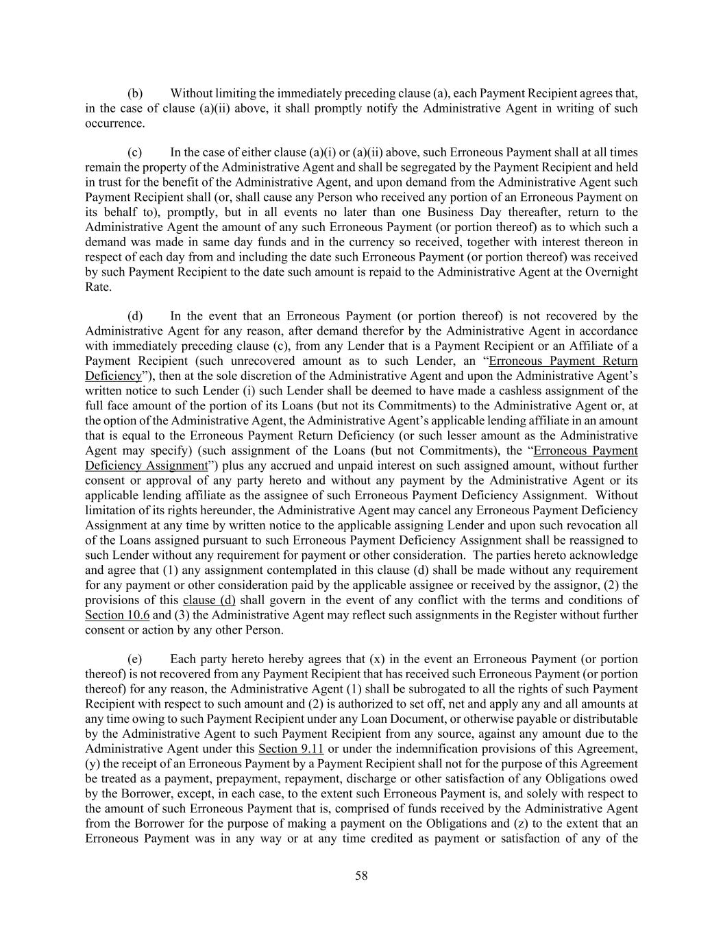 58 (b) Without limiting the immediately preceding clause (a), each Payment Recipient agrees that, in the case of clause (a)(ii) above, it shall promptly notify the Administrative Agent in writing of such occurrence. (c) In the case of either clause (a)(i) or (a)(ii) above, such Erroneous Payment shall at all times remain the property of the Administrative Agent and shall be segregated by the Payment Recipient and held in trust for the benefit of the Administrative Agent, and upon demand from the Administrative Agent such Payment Recipient shall (or, shall cause any Person who received any portion of an Erroneous Payment on its behalf to), promptly, but in all events no later than one Business Day thereafter, return to the Administrative Agent the amount of any such Erroneous Payment (or portion thereof) as to which such a demand was made in same day funds and in the currency so received, together with interest thereon in respect of each day from and including the date such Erroneous Payment (or portion thereof) was received by such Payment Recipient to the date such amount is repaid to the Administrative Agent at the Overnight Rate. (d) In the event that an Erroneous Payment (or portion thereof) is not recovered by the Administrative Agent for any reason, after demand therefor by the Administrative Agent in accordance with immediately preceding clause (c), from any Lender that is a Payment Recipient or an Affiliate of a Payment Recipient (such unrecovered amount as to such Lender, an “Erroneous Payment Return Deficiency”), then at the sole discretion of the Administrative Agent and upon the Administrative Agent’s written notice to such Lender (i) such Lender shall be deemed to have made a cashless assignment of the full face amount of the portion of its Loans (but not its Commitments) to the Administrative Agent or, at the option of the Administrative Agent, the Administrative Agent’s applicable lending affiliate in an amount that is equal to the Erroneous Payment Return Deficiency (or such lesser amount as the Administrative Agent may specify) (such assignment of the Loans (but not Commitments), the “Erroneous Payment Deficiency Assignment”) plus any accrued and unpaid interest on such assigned amount, without further consent or approval of any party hereto and without any payment by the Administrative Agent or its applicable lending affiliate as the assignee of such Erroneous Payment Deficiency Assignment. Without limitation of its rights hereunder, the Administrative Agent may cancel any Erroneous Payment Deficiency Assignment at any time by written notice to the applicable assigning Lender and upon such revocation all of the Loans assigned pursuant to such Erroneous Payment Deficiency Assignment shall be reassigned to such Lender without any requirement for payment or other consideration. The parties hereto acknowledge and agree that (1) any assignment contemplated in this clause (d) shall be made without any requirement for any payment or other consideration paid by the applicable assignee or received by the assignor, (2) the provisions of this clause (d) shall govern in the event of any conflict with the terms and conditions of Section 10.6 and (3) the Administrative Agent may reflect such assignments in the Register without further consent or action by any other Person. (e) Each party hereto hereby agrees that (x) in the event an Erroneous Payment (or portion thereof) is not recovered from any Payment Recipient that has received such Erroneous Payment (or portion thereof) for any reason, the Administrative Agent (1) shall be subrogated to all the rights of such Payment Recipient with respect to such amount and (2) is authorized to set off, net and apply any and all amounts at any time owing to such Payment Recipient under any Loan Document, or otherwise payable or distributable by the Administrative Agent to such Payment Recipient from any source, against any amount due to the Administrative Agent under this Section 9.11 or under the indemnification provisions of this Agreement, (y) the receipt of an Erroneous Payment by a Payment Recipient shall not for the purpose of this Agreement be treated as a payment, prepayment, repayment, discharge or other satisfaction of any Obligations owed by the Borrower, except, in each case, to the extent such Erroneous Payment is, and solely with respect to the amount of such Erroneous Payment that is, comprised of funds received by the Administrative Agent from the Borrower for the purpose of making a payment on the Obligations and (z) to the extent that an Erroneous Payment was in any way or at any time credited as payment or satisfaction of any of the