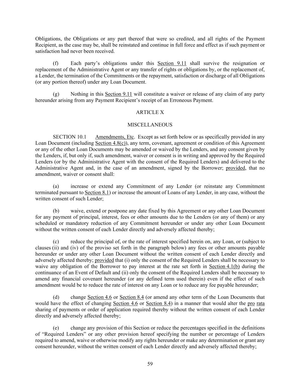 59 Obligations, the Obligations or any part thereof that were so credited, and all rights of the Payment Recipient, as the case may be, shall be reinstated and continue in full force and effect as if such payment or satisfaction had never been received. (f) Each party’s obligations under this Section 9.11 shall survive the resignation or replacement of the Administrative Agent or any transfer of rights or obligations by, or the replacement of, a Lender, the termination of the Commitments or the repayment, satisfaction or discharge of all Obligations (or any portion thereof) under any Loan Document. (g) Nothing in this Section 9.11 will constitute a waiver or release of any claim of any party hereunder arising from any Payment Recipient’s receipt of an Erroneous Payment. ARTICLE X MISCELLANEOUS SECTION 10.1 Amendments, Etc. Except as set forth below or as specifically provided in any Loan Document (including Section 4.8(c)), any term, covenant, agreement or condition of this Agreement or any of the other Loan Documents may be amended or waived by the Lenders, and any consent given by the Lenders, if, but only if, such amendment, waiver or consent is in writing and approved by the Required Lenders (or by the Administrative Agent with the consent of the Required Lenders) and delivered to the Administrative Agent and, in the case of an amendment, signed by the Borrower; provided, that no amendment, waiver or consent shall: (a) increase or extend any Commitment of any Lender (or reinstate any Commitment terminated pursuant to Section 8.1) or increase the amount of Loans of any Lender, in any case, without the written consent of such Lender; (b) waive, extend or postpone any date fixed by this Agreement or any other Loan Document for any payment of principal, interest, fees or other amounts due to the Lenders (or any of them) or any scheduled or mandatory reduction of any Commitment hereunder or under any other Loan Document without the written consent of each Lender directly and adversely affected thereby; (c) reduce the principal of, or the rate of interest specified herein on, any Loan, or (subject to clauses (ii) and (iv) of the proviso set forth in the paragraph below) any fees or other amounts payable hereunder or under any other Loan Document without the written consent of each Lender directly and adversely affected thereby; provided that (i) only the consent of the Required Lenders shall be necessary to waive any obligation of the Borrower to pay interest at the rate set forth in Section 4.1(b) during the continuance of an Event of Default and (ii) only the consent of the Required Lenders shall be necessary to amend any financial covenant hereunder (or any defined term used therein) even if the effect of such amendment would be to reduce the rate of interest on any Loan or to reduce any fee payable hereunder; (d) change Section 4.6 or Section 8.4 (or amend any other term of the Loan Documents that would have the effect of changing Section 4.6 or Section 8.4) in a manner that would alter the pro rata sharing of payments or order of application required thereby without the written consent of each Lender directly and adversely affected thereby; (e) change any provision of this Section or reduce the percentages specified in the definitions of “Required Lenders” or any other provision hereof specifying the number or percentage of Lenders required to amend, waive or otherwise modify any rights hereunder or make any determination or grant any consent hereunder, without the written consent of each Lender directly and adversely affected thereby;