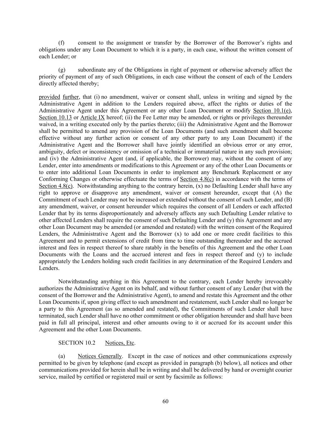 60 (f) consent to the assignment or transfer by the Borrower of the Borrower’s rights and obligations under any Loan Document to which it is a party, in each case, without the written consent of each Lender; or (g) subordinate any of the Obligations in right of payment or otherwise adversely affect the priority of payment of any of such Obligations, in each case without the consent of each of the Lenders directly affected thereby; provided further, that (i) no amendment, waiver or consent shall, unless in writing and signed by the Administrative Agent in addition to the Lenders required above, affect the rights or duties of the Administrative Agent under this Agreement or any other Loan Document or modify Section 10.1(e), Section 10.13 or Article IX hereof; (ii) the Fee Letter may be amended, or rights or privileges thereunder waived, in a writing executed only by the parties thereto; (iii) the Administrative Agent and the Borrower shall be permitted to amend any provision of the Loan Documents (and such amendment shall become effective without any further action or consent of any other party to any Loan Document) if the Administrative Agent and the Borrower shall have jointly identified an obvious error or any error, ambiguity, defect or inconsistency or omission of a technical or immaterial nature in any such provision; and (iv) the Administrative Agent (and, if applicable, the Borrower) may, without the consent of any Lender, enter into amendments or modifications to this Agreement or any of the other Loan Documents or to enter into additional Loan Documents in order to implement any Benchmark Replacement or any Conforming Changes or otherwise effectuate the terms of Section 4.8(c) in accordance with the terms of Section 4.8(c). Notwithstanding anything to the contrary herein, (x) no Defaulting Lender shall have any right to approve or disapprove any amendment, waiver or consent hereunder, except that (A) the Commitment of such Lender may not be increased or extended without the consent of such Lender, and (B) any amendment, waiver, or consent hereunder which requires the consent of all Lenders or each affected Lender that by its terms disproportionately and adversely affects any such Defaulting Lender relative to other affected Lenders shall require the consent of such Defaulting Lender and (y) this Agreement and any other Loan Document may be amended (or amended and restated) with the written consent of the Required Lenders, the Administrative Agent and the Borrower (x) to add one or more credit facilities to this Agreement and to permit extensions of credit from time to time outstanding thereunder and the accrued interest and fees in respect thereof to share ratably in the benefits of this Agreement and the other Loan Documents with the Loans and the accrued interest and fees in respect thereof and (y) to include appropriately the Lenders holding such credit facilities in any determination of the Required Lenders and Lenders. Notwithstanding anything in this Agreement to the contrary, each Lender hereby irrevocably authorizes the Administrative Agent on its behalf, and without further consent of any Lender (but with the consent of the Borrower and the Administrative Agent), to amend and restate this Agreement and the other Loan Documents if, upon giving effect to such amendment and restatement, such Lender shall no longer be a party to this Agreement (as so amended and restated), the Commitments of such Lender shall have terminated, such Lender shall have no other commitment or other obligation hereunder and shall have been paid in full all principal, interest and other amounts owing to it or accrued for its account under this Agreement and the other Loan Documents. SECTION 10.2 Notices, Etc. (a) Notices Generally. Except in the case of notices and other communications expressly permitted to be given by telephone (and except as provided in paragraph (b) below), all notices and other communications provided for herein shall be in writing and shall be delivered by hand or overnight courier service, mailed by certified or registered mail or sent by facsimile as follows: