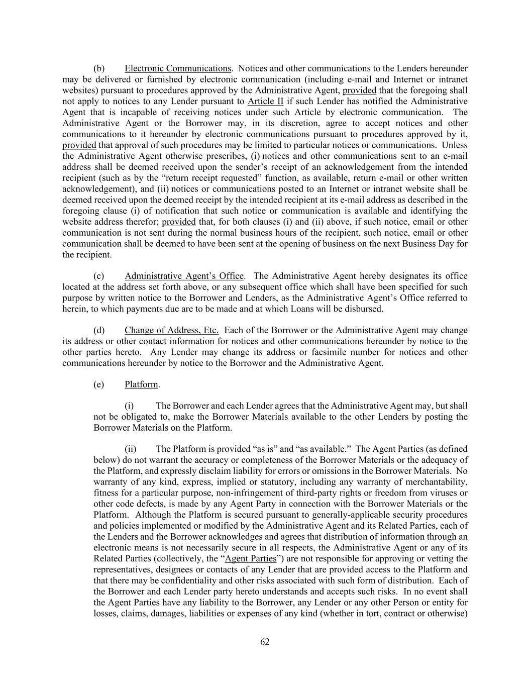 62 (b) Electronic Communications. Notices and other communications to the Lenders hereunder may be delivered or furnished by electronic communication (including e-mail and Internet or intranet websites) pursuant to procedures approved by the Administrative Agent, provided that the foregoing shall not apply to notices to any Lender pursuant to Article II if such Lender has notified the Administrative Agent that is incapable of receiving notices under such Article by electronic communication. The Administrative Agent or the Borrower may, in its discretion, agree to accept notices and other communications to it hereunder by electronic communications pursuant to procedures approved by it, provided that approval of such procedures may be limited to particular notices or communications. Unless the Administrative Agent otherwise prescribes, (i) notices and other communications sent to an e-mail address shall be deemed received upon the sender’s receipt of an acknowledgement from the intended recipient (such as by the “return receipt requested” function, as available, return e-mail or other written acknowledgement), and (ii) notices or communications posted to an Internet or intranet website shall be deemed received upon the deemed receipt by the intended recipient at its e-mail address as described in the foregoing clause (i) of notification that such notice or communication is available and identifying the website address therefor; provided that, for both clauses (i) and (ii) above, if such notice, email or other communication is not sent during the normal business hours of the recipient, such notice, email or other communication shall be deemed to have been sent at the opening of business on the next Business Day for the recipient. (c) Administrative Agent’s Office. The Administrative Agent hereby designates its office located at the address set forth above, or any subsequent office which shall have been specified for such purpose by written notice to the Borrower and Lenders, as the Administrative Agent’s Office referred to herein, to which payments due are to be made and at which Loans will be disbursed. (d) Change of Address, Etc. Each of the Borrower or the Administrative Agent may change its address or other contact information for notices and other communications hereunder by notice to the other parties hereto. Any Lender may change its address or facsimile number for notices and other communications hereunder by notice to the Borrower and the Administrative Agent. (e) Platform. (i) The Borrower and each Lender agrees that the Administrative Agent may, but shall not be obligated to, make the Borrower Materials available to the other Lenders by posting the Borrower Materials on the Platform. (ii) The Platform is provided “as is” and “as available.” The Agent Parties (as defined below) do not warrant the accuracy or completeness of the Borrower Materials or the adequacy of the Platform, and expressly disclaim liability for errors or omissions in the Borrower Materials. No warranty of any kind, express, implied or statutory, including any warranty of merchantability, fitness for a particular purpose, non-infringement of third-party rights or freedom from viruses or other code defects, is made by any Agent Party in connection with the Borrower Materials or the Platform. Although the Platform is secured pursuant to generally-applicable security procedures and policies implemented or modified by the Administrative Agent and its Related Parties, each of the Lenders and the Borrower acknowledges and agrees that distribution of information through an electronic means is not necessarily secure in all respects, the Administrative Agent or any of its Related Parties (collectively, the “Agent Parties”) are not responsible for approving or vetting the representatives, designees or contacts of any Lender that are provided access to the Platform and that there may be confidentiality and other risks associated with such form of distribution. Each of the Borrower and each Lender party hereto understands and accepts such risks. In no event shall the Agent Parties have any liability to the Borrower, any Lender or any other Person or entity for losses, claims, damages, liabilities or expenses of any kind (whether in tort, contract or otherwise)