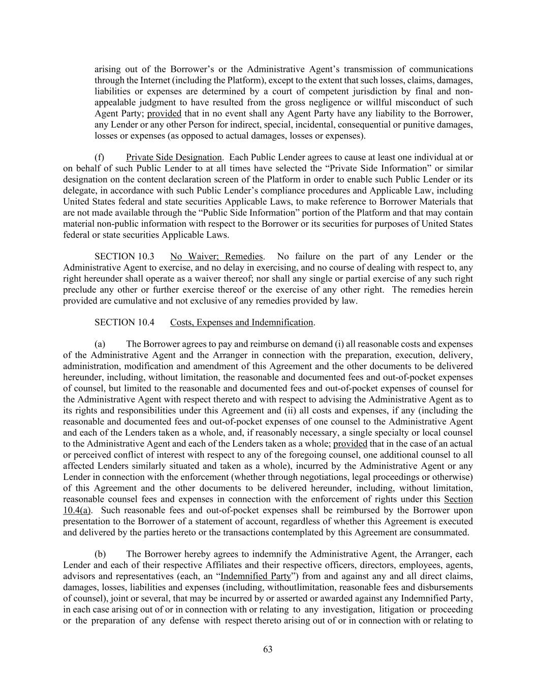 63 arising out of the Borrower’s or the Administrative Agent’s transmission of communications through the Internet (including the Platform), except to the extent that such losses, claims, damages, liabilities or expenses are determined by a court of competent jurisdiction by final and non- appealable judgment to have resulted from the gross negligence or willful misconduct of such Agent Party; provided that in no event shall any Agent Party have any liability to the Borrower, any Lender or any other Person for indirect, special, incidental, consequential or punitive damages, losses or expenses (as opposed to actual damages, losses or expenses). (f) Private Side Designation. Each Public Lender agrees to cause at least one individual at or on behalf of such Public Lender to at all times have selected the “Private Side Information” or similar designation on the content declaration screen of the Platform in order to enable such Public Lender or its delegate, in accordance with such Public Lender’s compliance procedures and Applicable Law, including United States federal and state securities Applicable Laws, to make reference to Borrower Materials that are not made available through the “Public Side Information” portion of the Platform and that may contain material non-public information with respect to the Borrower or its securities for purposes of United States federal or state securities Applicable Laws. SECTION 10.3 No Waiver; Remedies. No failure on the part of any Lender or the Administrative Agent to exercise, and no delay in exercising, and no course of dealing with respect to, any right hereunder shall operate as a waiver thereof; nor shall any single or partial exercise of any such right preclude any other or further exercise thereof or the exercise of any other right. The remedies herein provided are cumulative and not exclusive of any remedies provided by law. SECTION 10.4 Costs, Expenses and Indemnification. (a) The Borrower agrees to pay and reimburse on demand (i) all reasonable costs and expenses of the Administrative Agent and the Arranger in connection with the preparation, execution, delivery, administration, modification and amendment of this Agreement and the other documents to be delivered hereunder, including, without limitation, the reasonable and documented fees and out-of-pocket expenses of counsel, but limited to the reasonable and documented fees and out-of-pocket expenses of counsel for the Administrative Agent with respect thereto and with respect to advising the Administrative Agent as to its rights and responsibilities under this Agreement and (ii) all costs and expenses, if any (including the reasonable and documented fees and out-of-pocket expenses of one counsel to the Administrative Agent and each of the Lenders taken as a whole, and, if reasonably necessary, a single specialty or local counsel to the Administrative Agent and each of the Lenders taken as a whole; provided that in the case of an actual or perceived conflict of interest with respect to any of the foregoing counsel, one additional counsel to all affected Lenders similarly situated and taken as a whole), incurred by the Administrative Agent or any Lender in connection with the enforcement (whether through negotiations, legal proceedings or otherwise) of this Agreement and the other documents to be delivered hereunder, including, without limitation, reasonable counsel fees and expenses in connection with the enforcement of rights under this Section 10.4(a). Such reasonable fees and out-of-pocket expenses shall be reimbursed by the Borrower upon presentation to the Borrower of a statement of account, regardless of whether this Agreement is executed and delivered by the parties hereto or the transactions contemplated by this Agreement are consummated. (b) The Borrower hereby agrees to indemnify the Administrative Agent, the Arranger, each Lender and each of their respective Affiliates and their respective officers, directors, employees, agents, advisors and representatives (each, an “Indemnified Party”) from and against any and all direct claims, damages, losses, liabilities and expenses (including, without limitation, reasonable fees and disbursements of counsel), joint or several, that may be incurred by or asserted or awarded against any Indemnified Party, in each case arising out of or in connection with or relating to any investigation, litigation or proceeding or the preparation of any defense with respect thereto arising out of or in connection with or relating to