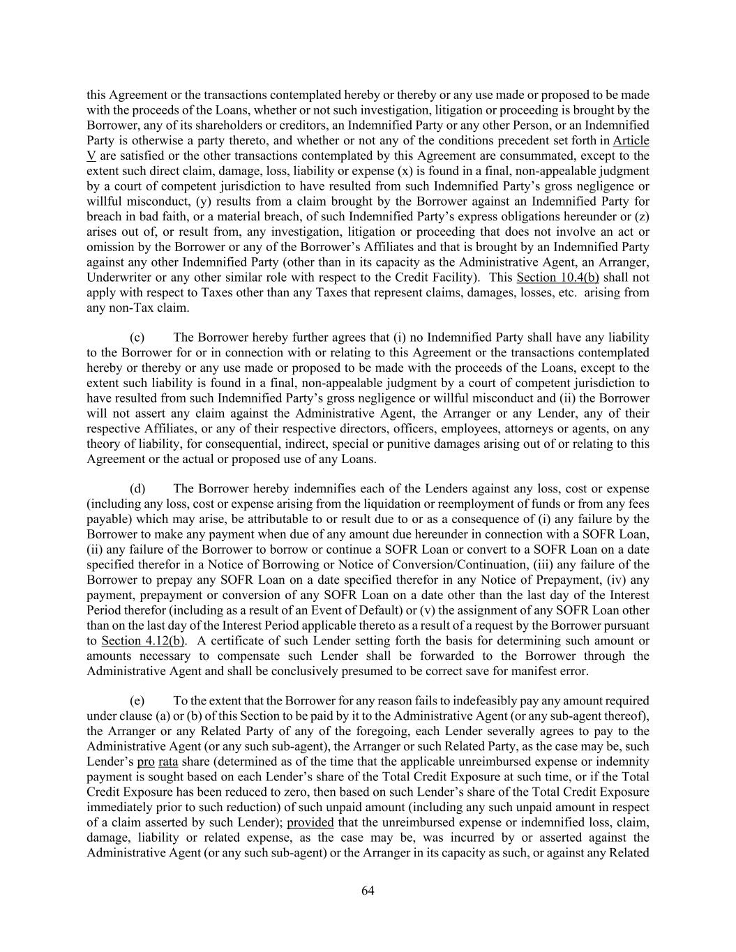 64 this Agreement or the transactions contemplated hereby or thereby or any use made or proposed to be made with the proceeds of the Loans, whether or not such investigation, litigation or proceeding is brought by the Borrower, any of its shareholders or creditors, an Indemnified Party or any other Person, or an Indemnified Party is otherwise a party thereto, and whether or not any of the conditions precedent set forth in Article V are satisfied or the other transactions contemplated by this Agreement are consummated, except to the extent such direct claim, damage, loss, liability or expense (x) is found in a final, non-appealable judgment by a court of competent jurisdiction to have resulted from such Indemnified Party’s gross negligence or willful misconduct, (y) results from a claim brought by the Borrower against an Indemnified Party for breach in bad faith, or a material breach, of such Indemnified Party’s express obligations hereunder or (z) arises out of, or result from, any investigation, litigation or proceeding that does not involve an act or omission by the Borrower or any of the Borrower’s Affiliates and that is brought by an Indemnified Party against any other Indemnified Party (other than in its capacity as the Administrative Agent, an Arranger, Underwriter or any other similar role with respect to the Credit Facility). This Section 10.4(b) shall not apply with respect to Taxes other than any Taxes that represent claims, damages, losses, etc. arising from any non-Tax claim. (c) The Borrower hereby further agrees that (i) no Indemnified Party shall have any liability to the Borrower for or in connection with or relating to this Agreement or the transactions contemplated hereby or thereby or any use made or proposed to be made with the proceeds of the Loans, except to the extent such liability is found in a final, non-appealable judgment by a court of competent jurisdiction to have resulted from such Indemnified Party’s gross negligence or willful misconduct and (ii) the Borrower will not assert any claim against the Administrative Agent, the Arranger or any Lender, any of their respective Affiliates, or any of their respective directors, officers, employees, attorneys or agents, on any theory of liability, for consequential, indirect, special or punitive damages arising out of or relating to this Agreement or the actual or proposed use of any Loans. (d) The Borrower hereby indemnifies each of the Lenders against any loss, cost or expense (including any loss, cost or expense arising from the liquidation or reemployment of funds or from any fees payable) which may arise, be attributable to or result due to or as a consequence of (i) any failure by the Borrower to make any payment when due of any amount due hereunder in connection with a SOFR Loan, (ii) any failure of the Borrower to borrow or continue a SOFR Loan or convert to a SOFR Loan on a date specified therefor in a Notice of Borrowing or Notice of Conversion/Continuation, (iii) any failure of the Borrower to prepay any SOFR Loan on a date specified therefor in any Notice of Prepayment, (iv) any payment, prepayment or conversion of any SOFR Loan on a date other than the last day of the Interest Period therefor (including as a result of an Event of Default) or (v) the assignment of any SOFR Loan other than on the last day of the Interest Period applicable thereto as a result of a request by the Borrower pursuant to Section 4.12(b). A certificate of such Lender setting forth the basis for determining such amount or amounts necessary to compensate such Lender shall be forwarded to the Borrower through the Administrative Agent and shall be conclusively presumed to be correct save for manifest error. (e) To the extent that the Borrower for any reason fails to indefeasibly pay any amount required under clause (a) or (b) of this Section to be paid by it to the Administrative Agent (or any sub-agent thereof), the Arranger or any Related Party of any of the foregoing, each Lender severally agrees to pay to the Administrative Agent (or any such sub-agent), the Arranger or such Related Party, as the case may be, such Lender’s pro rata share (determined as of the time that the applicable unreimbursed expense or indemnity payment is sought based on each Lender’s share of the Total Credit Exposure at such time, or if the Total Credit Exposure has been reduced to zero, then based on such Lender’s share of the Total Credit Exposure immediately prior to such reduction) of such unpaid amount (including any such unpaid amount in respect of a claim asserted by such Lender); provided that the unreimbursed expense or indemnified loss, claim, damage, liability or related expense, as the case may be, was incurred by or asserted against the Administrative Agent (or any such sub-agent) or the Arranger in its capacity as such, or against any Related