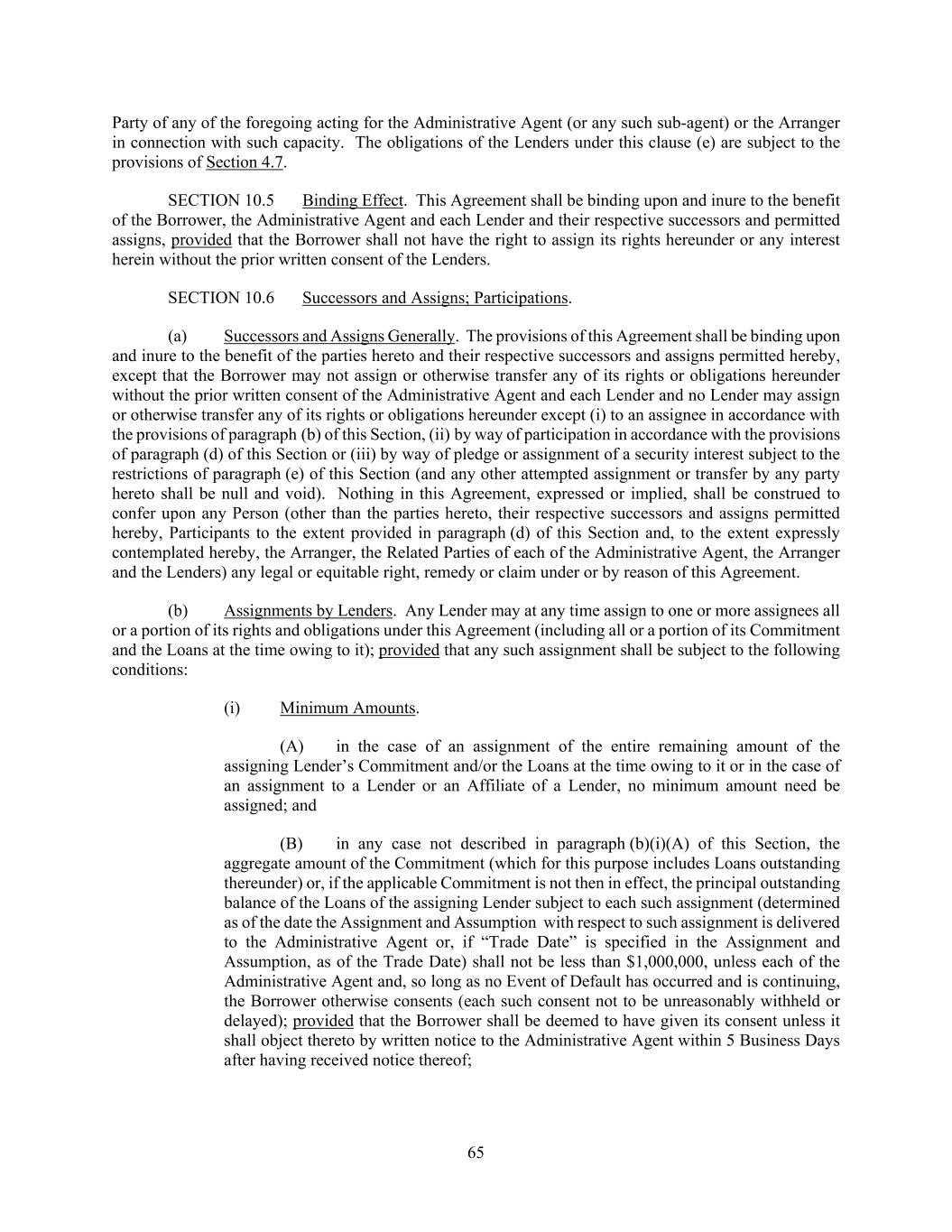 65 Party of any of the foregoing acting for the Administrative Agent (or any such sub-agent) or the Arranger in connection with such capacity. The obligations of the Lenders under this clause (e) are subject to the provisions of Section 4.7. SECTION 10.5 Binding Effect. This Agreement shall be binding upon and inure to the benefit of the Borrower, the Administrative Agent and each Lender and their respective successors and permitted assigns, provided that the Borrower shall not have the right to assign its rights hereunder or any interest herein without the prior written consent of the Lenders. SECTION 10.6 Successors and Assigns; Participations. (a) Successors and Assigns Generally. The provisions of this Agreement shall be binding upon and inure to the benefit of the parties hereto and their respective successors and assigns permitted hereby, except that the Borrower may not assign or otherwise transfer any of its rights or obligations hereunder without the prior written consent of the Administrative Agent and each Lender and no Lender may assign or otherwise transfer any of its rights or obligations hereunder except (i) to an assignee in accordance with the provisions of paragraph (b) of this Section, (ii) by way of participation in accordance with the provisions of paragraph (d) of this Section or (iii) by way of pledge or assignment of a security interest subject to the restrictions of paragraph (e) of this Section (and any other attempted assignment or transfer by any party hereto shall be null and void). Nothing in this Agreement, expressed or implied, shall be construed to confer upon any Person (other than the parties hereto, their respective successors and assigns permitted hereby, Participants to the extent provided in paragraph (d) of this Section and, to the extent expressly contemplated hereby, the Arranger, the Related Parties of each of the Administrative Agent, the Arranger and the Lenders) any legal or equitable right, remedy or claim under or by reason of this Agreement. (b) Assignments by Lenders. Any Lender may at any time assign to one or more assignees all or a portion of its rights and obligations under this Agreement (including all or a portion of its Commitment and the Loans at the time owing to it); provided that any such assignment shall be subject to the following conditions: (i) Minimum Amounts. (A) in the case of an assignment of the entire remaining amount of the assigning Lender’s Commitment and/or the Loans at the time owing to it or in the case of an assignment to a Lender or an Affiliate of a Lender, no minimum amount need be assigned; and (B) in any case not described in paragraph (b)(i)(A) of this Section, the aggregate amount of the Commitment (which for this purpose includes Loans outstanding thereunder) or, if the applicable Commitment is not then in effect, the principal outstanding balance of the Loans of the assigning Lender subject to each such assignment (determined as of the date the Assignment and Assumption with respect to such assignment is delivered to the Administrative Agent or, if “Trade Date” is specified in the Assignment and Assumption, as of the Trade Date) shall not be less than $1,000,000, unless each of the Administrative Agent and, so long as no Event of Default has occurred and is continuing, the Borrower otherwise consents (each such consent not to be unreasonably withheld or delayed); provided that the Borrower shall be deemed to have given its consent unless it shall object thereto by written notice to the Administrative Agent within 5 Business Days after having received notice thereof;