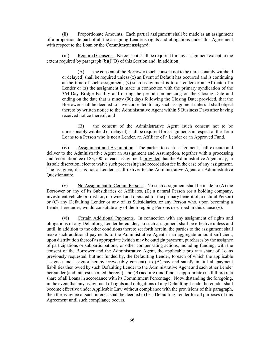 66 (ii) Proportionate Amounts. Each partial assignment shall be made as an assignment of a proportionate part of all the assigning Lender’s rights and obligations under this Agreement with respect to the Loan or the Commitment assigned; (iii) Required Consents. No consent shall be required for any assignment except to the extent required by paragraph (b)(i)(B) of this Section and, in addition: (A) the consent of the Borrower (such consent not to be unreasonably withheld or delayed) shall be required unless (x) an Event of Default has occurred and is continuing at the time of such assignment, (y) such assignment is to a Lender or an Affiliate of a Lender or (z) the assignment is made in connection with the primary syndication of the 364-Day Bridge Facility and during the period commencing on the Closing Date and ending on the date that is ninety (90) days following the Closing Date; provided, that the Borrower shall be deemed to have consented to any such assignment unless it shall object thereto by written notice to the Administrative Agent within 5 Business Days after having received notice thereof; and (B) the consent of the Administrative Agent (such consent not to be unreasonably withheld or delayed) shall be required for assignments in respect of the Term Loans to a Person who is not a Lender, an Affiliate of a Lender or an Approved Fund. (iv) Assignment and Assumption. The parties to each assignment shall execute and deliver to the Administrative Agent an Assignment and Assumption, together with a processing and recordation fee of $3,500 for each assignment; provided that the Administrative Agent may, in its sole discretion, elect to waive such processing and recordation fee in the case of any assignment. The assignee, if it is not a Lender, shall deliver to the Administrative Agent an Administrative Questionnaire. (v) No Assignment to Certain Persons. No such assignment shall be made to (A) the Borrower or any of its Subsidiaries or Affiliates, (B) a natural Person (or a holding company, investment vehicle or trust for, or owned and operated for the primary benefit of, a natural Person) or (C) any Defaulting Lender or any of its Subsidiaries, or any Person who, upon becoming a Lender hereunder, would constitute any of the foregoing Persons described in this clause (v). (vi) Certain Additional Payments. In connection with any assignment of rights and obligations of any Defaulting Lender hereunder, no such assignment shall be effective unless and until, in addition to the other conditions thereto set forth herein, the parties to the assignment shall make such additional payments to the Administrative Agent in an aggregate amount sufficient, upon distribution thereof as appropriate (which may be outright payment, purchases by the assignee of participations or subparticipations, or other compensating actions, including funding, with the consent of the Borrower and the Administrative Agent, the applicable pro rata share of Loans previously requested, but not funded by, the Defaulting Lender, to each of which the applicable assignee and assignor hereby irrevocably consent), to (A) pay and satisfy in full all payment liabilities then owed by such Defaulting Lender to the Administrative Agent and each other Lender hereunder (and interest accrued thereon), and (B) acquire (and fund as appropriate) its full pro rata share of all Loans in accordance with its Commitment Percentage. Notwithstanding the foregoing, in the event that any assignment of rights and obligations of any Defaulting Lender hereunder shall become effective under Applicable Law without compliance with the provisions of this paragraph, then the assignee of such interest shall be deemed to be a Defaulting Lender for all purposes of this Agreement until such compliance occurs.