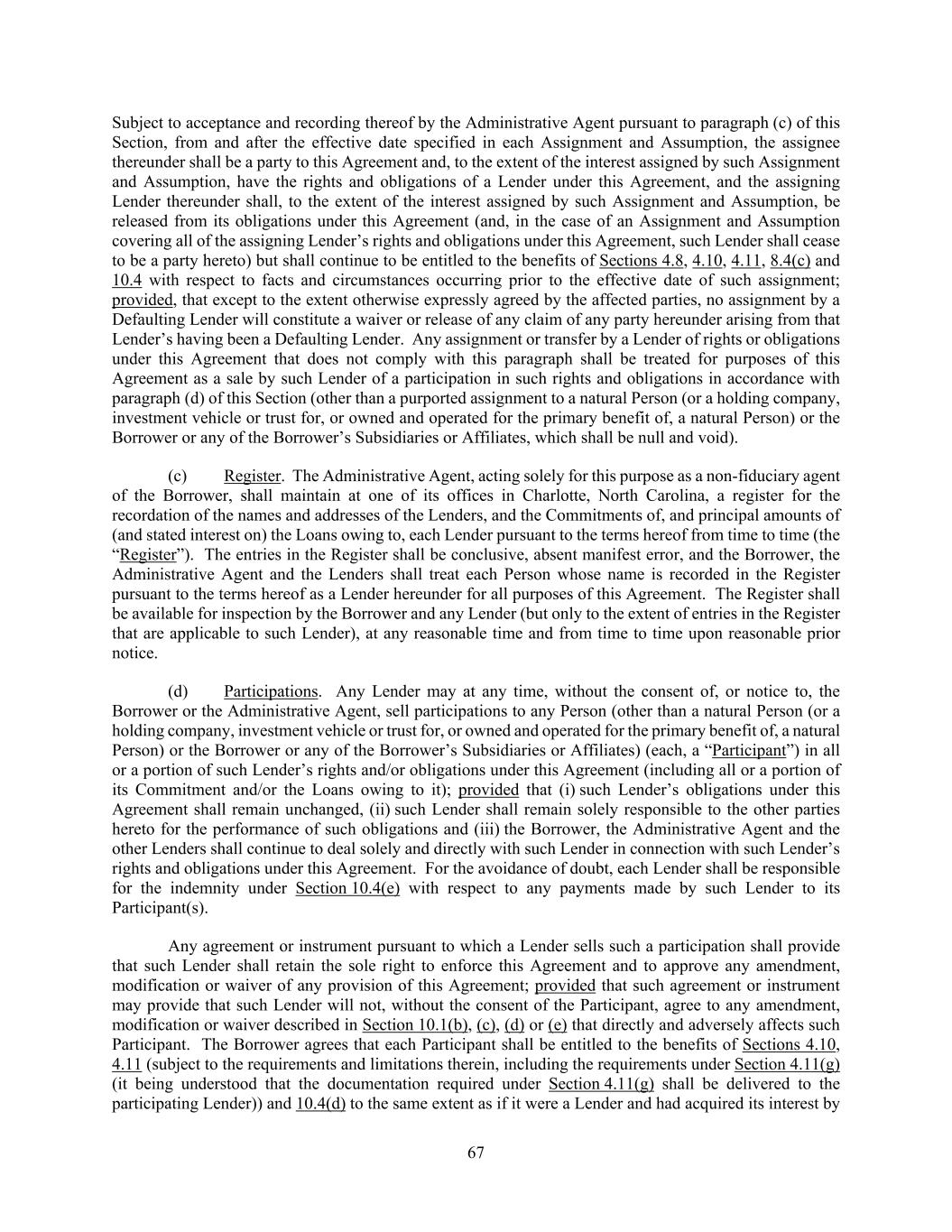 67 Subject to acceptance and recording thereof by the Administrative Agent pursuant to paragraph (c) of this Section, from and after the effective date specified in each Assignment and Assumption, the assignee thereunder shall be a party to this Agreement and, to the extent of the interest assigned by such Assignment and Assumption, have the rights and obligations of a Lender under this Agreement, and the assigning Lender thereunder shall, to the extent of the interest assigned by such Assignment and Assumption, be released from its obligations under this Agreement (and, in the case of an Assignment and Assumption covering all of the assigning Lender’s rights and obligations under this Agreement, such Lender shall cease to be a party hereto) but shall continue to be entitled to the benefits of Sections 4.8, 4.10, 4.11, 8.4(c) and 10.4 with respect to facts and circumstances occurring prior to the effective date of such assignment; provided, that except to the extent otherwise expressly agreed by the affected parties, no assignment by a Defaulting Lender will constitute a waiver or release of any claim of any party hereunder arising from that Lender’s having been a Defaulting Lender. Any assignment or transfer by a Lender of rights or obligations under this Agreement that does not comply with this paragraph shall be treated for purposes of this Agreement as a sale by such Lender of a participation in such rights and obligations in accordance with paragraph (d) of this Section (other than a purported assignment to a natural Person (or a holding company, investment vehicle or trust for, or owned and operated for the primary benefit of, a natural Person) or the Borrower or any of the Borrower’s Subsidiaries or Affiliates, which shall be null and void). (c) Register. The Administrative Agent, acting solely for this purpose as a non-fiduciary agent of the Borrower, shall maintain at one of its offices in Charlotte, North Carolina, a register for the recordation of the names and addresses of the Lenders, and the Commitments of, and principal amounts of (and stated interest on) the Loans owing to, each Lender pursuant to the terms hereof from time to time (the “Register”). The entries in the Register shall be conclusive, absent manifest error, and the Borrower, the Administrative Agent and the Lenders shall treat each Person whose name is recorded in the Register pursuant to the terms hereof as a Lender hereunder for all purposes of this Agreement. The Register shall be available for inspection by the Borrower and any Lender (but only to the extent of entries in the Register that are applicable to such Lender), at any reasonable time and from time to time upon reasonable prior notice. (d) Participations. Any Lender may at any time, without the consent of, or notice to, the Borrower or the Administrative Agent, sell participations to any Person (other than a natural Person (or a holding company, investment vehicle or trust for, or owned and operated for the primary benefit of, a natural Person) or the Borrower or any of the Borrower’s Subsidiaries or Affiliates) (each, a “Participant”) in all or a portion of such Lender’s rights and/or obligations under this Agreement (including all or a portion of its Commitment and/or the Loans owing to it); provided that (i) such Lender’s obligations under this Agreement shall remain unchanged, (ii) such Lender shall remain solely responsible to the other parties hereto for the performance of such obligations and (iii) the Borrower, the Administrative Agent and the other Lenders shall continue to deal solely and directly with such Lender in connection with such Lender’s rights and obligations under this Agreement. For the avoidance of doubt, each Lender shall be responsible for the indemnity under Section 10.4(e) with respect to any payments made by such Lender to its Participant(s). Any agreement or instrument pursuant to which a Lender sells such a participation shall provide that such Lender shall retain the sole right to enforce this Agreement and to approve any amendment, modification or waiver of any provision of this Agreement; provided that such agreement or instrument may provide that such Lender will not, without the consent of the Participant, agree to any amendment, modification or waiver described in Section 10.1(b), (c), (d) or (e) that directly and adversely affects such Participant. The Borrower agrees that each Participant shall be entitled to the benefits of Sections 4.10, 4.11 (subject to the requirements and limitations therein, including the requirements under Section 4.11(g) (it being understood that the documentation required under Section 4.11(g) shall be delivered to the participating Lender)) and 10.4(d) to the same extent as if it were a Lender and had acquired its interest by