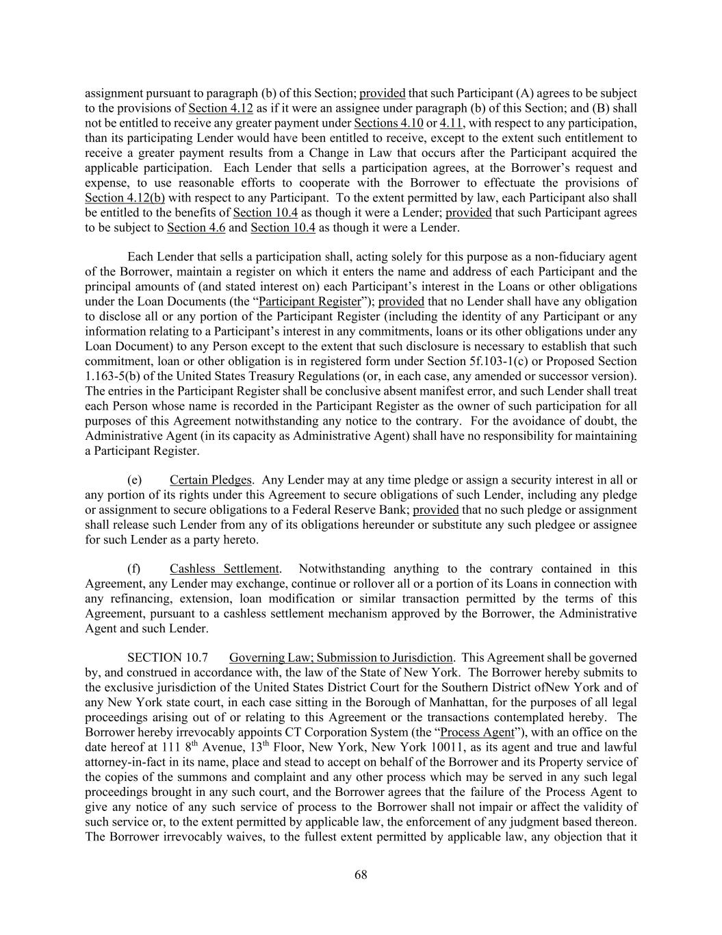 68 assignment pursuant to paragraph (b) of this Section; provided that such Participant (A) agrees to be subject to the provisions of Section 4.12 as if it were an assignee under paragraph (b) of this Section; and (B) shall not be entitled to receive any greater payment under Sections 4.10 or 4.11, with respect to any participation, than its participating Lender would have been entitled to receive, except to the extent such entitlement to receive a greater payment results from a Change in Law that occurs after the Participant acquired the applicable participation. Each Lender that sells a participation agrees, at the Borrower’s request and expense, to use reasonable efforts to cooperate with the Borrower to effectuate the provisions of Section 4.12(b) with respect to any Participant. To the extent permitted by law, each Participant also shall be entitled to the benefits of Section 10.4 as though it were a Lender; provided that such Participant agrees to be subject to Section 4.6 and Section 10.4 as though it were a Lender. Each Lender that sells a participation shall, acting solely for this purpose as a non-fiduciary agent of the Borrower, maintain a register on which it enters the name and address of each Participant and the principal amounts of (and stated interest on) each Participant’s interest in the Loans or other obligations under the Loan Documents (the “Participant Register”); provided that no Lender shall have any obligation to disclose all or any portion of the Participant Register (including the identity of any Participant or any information relating to a Participant’s interest in any commitments, loans or its other obligations under any Loan Document) to any Person except to the extent that such disclosure is necessary to establish that such commitment, loan or other obligation is in registered form under Section 5f.103-1(c) or Proposed Section 1.163-5(b) of the United States Treasury Regulations (or, in each case, any amended or successor version). The entries in the Participant Register shall be conclusive absent manifest error, and such Lender shall treat each Person whose name is recorded in the Participant Register as the owner of such participation for all purposes of this Agreement notwithstanding any notice to the contrary. For the avoidance of doubt, the Administrative Agent (in its capacity as Administrative Agent) shall have no responsibility for maintaining a Participant Register. (e) Certain Pledges. Any Lender may at any time pledge or assign a security interest in all or any portion of its rights under this Agreement to secure obligations of such Lender, including any pledge or assignment to secure obligations to a Federal Reserve Bank; provided that no such pledge or assignment shall release such Lender from any of its obligations hereunder or substitute any such pledgee or assignee for such Lender as a party hereto. (f) Cashless Settlement. Notwithstanding anything to the contrary contained in this Agreement, any Lender may exchange, continue or rollover all or a portion of its Loans in connection with any refinancing, extension, loan modification or similar transaction permitted by the terms of this Agreement, pursuant to a cashless settlement mechanism approved by the Borrower, the Administrative Agent and such Lender. SECTION 10.7 Governing Law; Submission to Jurisdiction. This Agreement shall be governed by, and construed in accordance with, the law of the State of New York. The Borrower hereby submits to the exclusive jurisdiction of the United States District Court for the Southern District of New York and of any New York state court, in each case sitting in the Borough of Manhattan, for the purposes of all legal proceedings arising out of or relating to this Agreement or the transactions contemplated hereby. The Borrower hereby irrevocably appoints CT Corporation System (the “Process Agent”), with an office on the date hereof at 111 8th Avenue, 13th Floor, New York, New York 10011, as its agent and true and lawful attorney-in-fact in its name, place and stead to accept on behalf of the Borrower and its Property service of the copies of the summons and complaint and any other process which may be served in any such legal proceedings brought in any such court, and the Borrower agrees that the failure of the Process Agent to give any notice of any such service of process to the Borrower shall not impair or affect the validity of such service or, to the extent permitted by applicable law, the enforcement of any judgment based thereon. The Borrower irrevocably waives, to the fullest extent permitted by applicable law, any objection that it