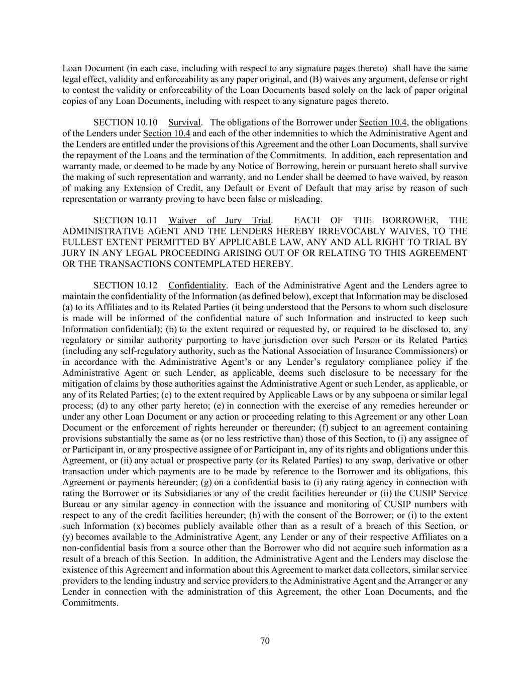 70 Loan Document (in each case, including with respect to any signature pages thereto) shall have the same legal effect, validity and enforceability as any paper original, and (B) waives any argument, defense or right to contest the validity or enforceability of the Loan Documents based solely on the lack of paper original copies of any Loan Documents, including with respect to any signature pages thereto. SECTION 10.10 Survival. The obligations of the Borrower under Section 10.4, the obligations of the Lenders under Section 10.4 and each of the other indemnities to which the Administrative Agent and the Lenders are entitled under the provisions of this Agreement and the other Loan Documents, shall survive the repayment of the Loans and the termination of the Commitments. In addition, each representation and warranty made, or deemed to be made by any Notice of Borrowing, herein or pursuant hereto shall survive the making of such representation and warranty, and no Lender shall be deemed to have waived, by reason of making any Extension of Credit, any Default or Event of Default that may arise by reason of such representation or warranty proving to have been false or misleading. SECTION 10.11 Waiver of Jury Trial. EACH OF THE BORROWER, THE ADMINISTRATIVE AGENT AND THE LENDERS HEREBY IRREVOCABLY WAIVES, TO THE FULLEST EXTENT PERMITTED BY APPLICABLE LAW, ANY AND ALL RIGHT TO TRIAL BY JURY IN ANY LEGAL PROCEEDING ARISING OUT OF OR RELATING TO THIS AGREEMENT OR THE TRANSACTIONS CONTEMPLATED HEREBY. SECTION 10.12 Confidentiality. Each of the Administrative Agent and the Lenders agree to maintain the confidentiality of the Information (as defined below), except that Information may be disclosed (a) to its Affiliates and to its Related Parties (it being understood that the Persons to whom such disclosure is made will be informed of the confidential nature of such Information and instructed to keep such Information confidential); (b) to the extent required or requested by, or required to be disclosed to, any regulatory or similar authority purporting to have jurisdiction over such Person or its Related Parties (including any self-regulatory authority, such as the National Association of Insurance Commissioners) or in accordance with the Administrative Agent’s or any Lender’s regulatory compliance policy if the Administrative Agent or such Lender, as applicable, deems such disclosure to be necessary for the mitigation of claims by those authorities against the Administrative Agent or such Lender, as applicable, or any of its Related Parties; (c) to the extent required by Applicable Laws or by any subpoena or similar legal process; (d) to any other party hereto; (e) in connection with the exercise of any remedies hereunder or under any other Loan Document or any action or proceeding relating to this Agreement or any other Loan Document or the enforcement of rights hereunder or thereunder; (f) subject to an agreement containing provisions substantially the same as (or no less restrictive than) those of this Section, to (i) any assignee of or Participant in, or any prospective assignee of or Participant in, any of its rights and obligations under this Agreement, or (ii) any actual or prospective party (or its Related Parties) to any swap, derivative or other transaction under which payments are to be made by reference to the Borrower and its obligations, this Agreement or payments hereunder; (g) on a confidential basis to (i) any rating agency in connection with rating the Borrower or its Subsidiaries or any of the credit facilities hereunder or (ii) the CUSIP Service Bureau or any similar agency in connection with the issuance and monitoring of CUSIP numbers with respect to any of the credit facilities hereunder; (h) with the consent of the Borrower; or (i) to the extent such Information (x) becomes publicly available other than as a result of a breach of this Section, or (y) becomes available to the Administrative Agent, any Lender or any of their respective Affiliates on a non-confidential basis from a source other than the Borrower who did not acquire such information as a result of a breach of this Section. In addition, the Administrative Agent and the Lenders may disclose the existence of this Agreement and information about this Agreement to market data collectors, similar service providers to the lending industry and service providers to the Administrative Agent and the Arranger or any Lender in connection with the administration of this Agreement, the other Loan Documents, and the Commitments.