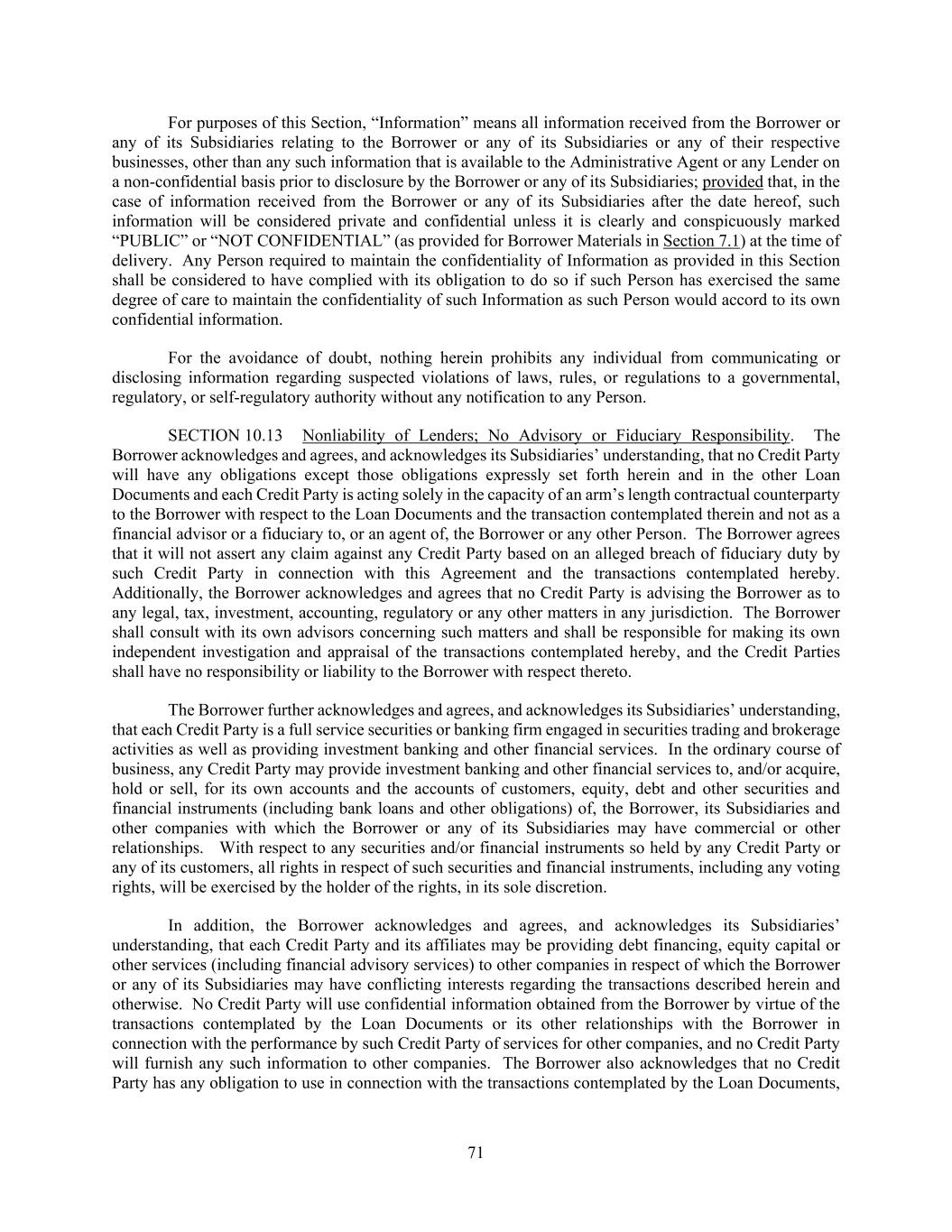 71 For purposes of this Section, “Information” means all information received from the Borrower or any of its Subsidiaries relating to the Borrower or any of its Subsidiaries or any of their respective businesses, other than any such information that is available to the Administrative Agent or any Lender on a non-confidential basis prior to disclosure by the Borrower or any of its Subsidiaries; provided that, in the case of information received from the Borrower or any of its Subsidiaries after the date hereof, such information will be considered private and confidential unless it is clearly and conspicuously marked “PUBLIC” or “NOT CONFIDENTIAL” (as provided for Borrower Materials in Section 7.1) at the time of delivery. Any Person required to maintain the confidentiality of Information as provided in this Section shall be considered to have complied with its obligation to do so if such Person has exercised the same degree of care to maintain the confidentiality of such Information as such Person would accord to its own confidential information. For the avoidance of doubt, nothing herein prohibits any individual from communicating or disclosing information regarding suspected violations of laws, rules, or regulations to a governmental, regulatory, or self-regulatory authority without any notification to any Person. SECTION 10.13 Nonliability of Lenders; No Advisory or Fiduciary Responsibility. The Borrower acknowledges and agrees, and acknowledges its Subsidiaries’ understanding, that no Credit Party will have any obligations except those obligations expressly set forth herein and in the other Loan Documents and each Credit Party is acting solely in the capacity of an arm’s length contractual counterparty to the Borrower with respect to the Loan Documents and the transaction contemplated therein and not as a financial advisor or a fiduciary to, or an agent of, the Borrower or any other Person. The Borrower agrees that it will not assert any claim against any Credit Party based on an alleged breach of fiduciary duty by such Credit Party in connection with this Agreement and the transactions contemplated hereby. Additionally, the Borrower acknowledges and agrees that no Credit Party is advising the Borrower as to any legal, tax, investment, accounting, regulatory or any other matters in any jurisdiction. The Borrower shall consult with its own advisors concerning such matters and shall be responsible for making its own independent investigation and appraisal of the transactions contemplated hereby, and the Credit Parties shall have no responsibility or liability to the Borrower with respect thereto. The Borrower further acknowledges and agrees, and acknowledges its Subsidiaries’ understanding, that each Credit Party is a full service securities or banking firm engaged in securities trading and brokerage activities as well as providing investment banking and other financial services. In the ordinary course of business, any Credit Party may provide investment banking and other financial services to, and/or acquire, hold or sell, for its own accounts and the accounts of customers, equity, debt and other securities and financial instruments (including bank loans and other obligations) of, the Borrower, its Subsidiaries and other companies with which the Borrower or any of its Subsidiaries may have commercial or other relationships. With respect to any securities and/or financial instruments so held by any Credit Party or any of its customers, all rights in respect of such securities and financial instruments, including any voting rights, will be exercised by the holder of the rights, in its sole discretion. In addition, the Borrower acknowledges and agrees, and acknowledges its Subsidiaries’ understanding, that each Credit Party and its affiliates may be providing debt financing, equity capital or other services (including financial advisory services) to other companies in respect of which the Borrower or any of its Subsidiaries may have conflicting interests regarding the transactions described herein and otherwise. No Credit Party will use confidential information obtained from the Borrower by virtue of the transactions contemplated by the Loan Documents or its other relationships with the Borrower in connection with the performance by such Credit Party of services for other companies, and no Credit Party will furnish any such information to other companies. The Borrower also acknowledges that no Credit Party has any obligation to use in connection with the transactions contemplated by the Loan Documents,