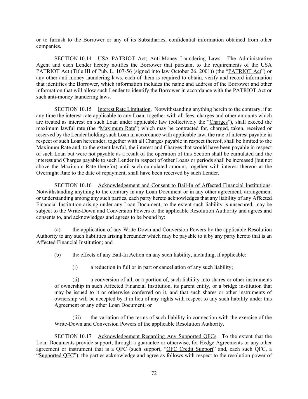 72 or to furnish to the Borrower or any of its Subsidiaries, confidential information obtained from other companies. SECTION 10.14 USA PATRIOT Act; Anti-Money Laundering Laws. The Administrative Agent and each Lender hereby notifies the Borrower that pursuant to the requirements of the USA PATRIOT Act (Title III of Pub. L. 107-56 (signed into law October 26, 2001)) (the “PATRIOT Act”) or any other anti-money laundering laws, each of them is required to obtain, verify and record information that identifies the Borrower, which information includes the name and address of the Borrower and other information that will allow such Lender to identify the Borrower in accordance with the PATRIOT Act or such anti-money laundering laws. SECTION 10.15 Interest Rate Limitation. Notwithstanding anything herein to the contrary, if at any time the interest rate applicable to any Loan, together with all fees, charges and other amounts which are treated as interest on such Loan under applicable law (collectively the “Charges”), shall exceed the maximum lawful rate (the “Maximum Rate”) which may be contracted for, charged, taken, received or reserved by the Lender holding such Loan in accordance with applicable law, the rate of interest payable in respect of such Loan hereunder, together with all Charges payable in respect thereof, shall be limited to the Maximum Rate and, to the extent lawful, the interest and Charges that would have been payable in respect of such Loan but were not payable as a result of the operation of this Section shall be cumulated and the interest and Charges payable to such Lender in respect of other Loans or periods shall be increased (but not above the Maximum Rate therefor) until such cumulated amount, together with interest thereon at the Overnight Rate to the date of repayment, shall have been received by such Lender. SECTION 10.16 Acknowledgement and Consent to Bail-In of Affected Financial Institutions. Notwithstanding anything to the contrary in any Loan Document or in any other agreement, arrangement or understanding among any such parties, each party hereto acknowledges that any liability of any Affected Financial Institution arising under any Loan Document, to the extent such liability is unsecured, may be subject to the Write-Down and Conversion Powers of the applicable Resolution Authority and agrees and consents to, and acknowledges and agrees to be bound by: (a) the application of any Write-Down and Conversion Powers by the applicable Resolution Authority to any such liabilities arising hereunder which may be payable to it by any party hereto that is an Affected Financial Institution; and (b) the effects of any Bail-In Action on any such liability, including, if applicable: (i) a reduction in full or in part or cancellation of any such liability; (ii) a conversion of all, or a portion of, such liability into shares or other instruments of ownership in such Affected Financial Institution, its parent entity, or a bridge institution that may be issued to it or otherwise conferred on it, and that such shares or other instruments of ownership will be accepted by it in lieu of any rights with respect to any such liability under this Agreement or any other Loan Document; or (iii) the variation of the terms of such liability in connection with the exercise of the Write-Down and Conversion Powers of the applicable Resolution Authority. SECTION 10.17 Acknowledgement Regarding Any Supported QFCs. To the extent that the Loan Documents provide support, through a guarantee or otherwise, for Hedge Agreements or any other agreement or instrument that is a QFC (such support, “QFC Credit Support” and, each such QFC, a “Supported QFC”), the parties acknowledge and agree as follows with respect to the resolution power of