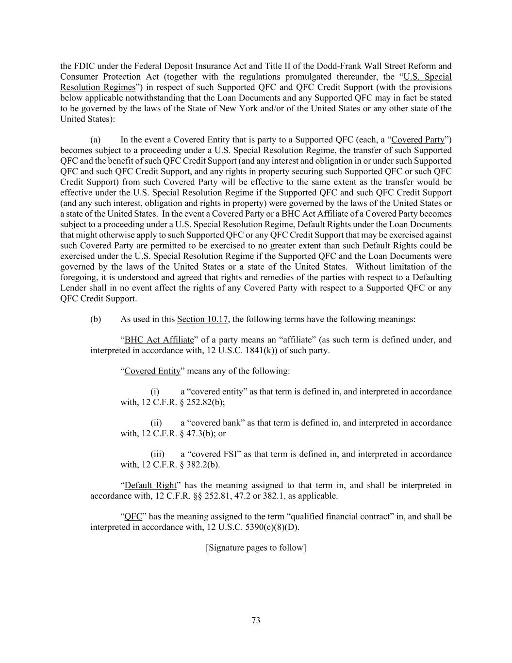 73 the FDIC under the Federal Deposit Insurance Act and Title II of the Dodd-Frank Wall Street Reform and Consumer Protection Act (together with the regulations promulgated thereunder, the “U.S. Special Resolution Regimes”) in respect of such Supported QFC and QFC Credit Support (with the provisions below applicable notwithstanding that the Loan Documents and any Supported QFC may in fact be stated to be governed by the laws of the State of New York and/or of the United States or any other state of the United States): (a) In the event a Covered Entity that is party to a Supported QFC (each, a “Covered Party”) becomes subject to a proceeding under a U.S. Special Resolution Regime, the transfer of such Supported QFC and the benefit of such QFC Credit Support (and any interest and obligation in or under such Supported QFC and such QFC Credit Support, and any rights in property securing such Supported QFC or such QFC Credit Support) from such Covered Party will be effective to the same extent as the transfer would be effective under the U.S. Special Resolution Regime if the Supported QFC and such QFC Credit Support (and any such interest, obligation and rights in property) were governed by the laws of the United States or a state of the United States. In the event a Covered Party or a BHC Act Affiliate of a Covered Party becomes subject to a proceeding under a U.S. Special Resolution Regime, Default Rights under the Loan Documents that might otherwise apply to such Supported QFC or any QFC Credit Support that may be exercised against such Covered Party are permitted to be exercised to no greater extent than such Default Rights could be exercised under the U.S. Special Resolution Regime if the Supported QFC and the Loan Documents were governed by the laws of the United States or a state of the United States. Without limitation of the foregoing, it is understood and agreed that rights and remedies of the parties with respect to a Defaulting Lender shall in no event affect the rights of any Covered Party with respect to a Supported QFC or any QFC Credit Support. (b) As used in this Section 10.17, the following terms have the following meanings: “BHC Act Affiliate” of a party means an “affiliate” (as such term is defined under, and interpreted in accordance with, 12 U.S.C. 1841(k)) of such party. “Covered Entity” means any of the following: (i) a “covered entity” as that term is defined in, and interpreted in accordance with, 12 C.F.R. § 252.82(b); (ii) a “covered bank” as that term is defined in, and interpreted in accordance with, 12 C.F.R. § 47.3(b); or (iii) a “covered FSI” as that term is defined in, and interpreted in accordance with, 12 C.F.R. § 382.2(b). “Default Right” has the meaning assigned to that term in, and shall be interpreted in accordance with, 12 C.F.R. §§ 252.81, 47.2 or 382.1, as applicable. “QFC” has the meaning assigned to the term “qualified financial contract” in, and shall be interpreted in accordance with, 12 U.S.C. 5390(c)(8)(D). [Signature pages to follow]