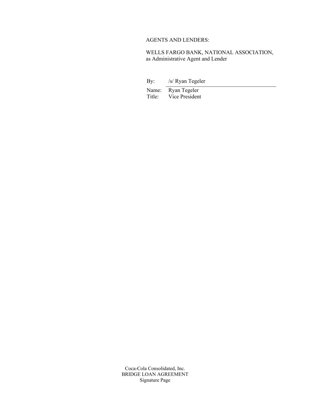 Coca-Cola Consolidated, Inc. BRIDGE LOAN AGREEMENT Signature Page AGENTS AND LENDERS: WELLS FARGO BANK, NATIONAL ASSOCIATION, as Administrative Agent and Lender By: /s/ Ryan Tegeler Name: Ryan Tegeler Title: Vice President