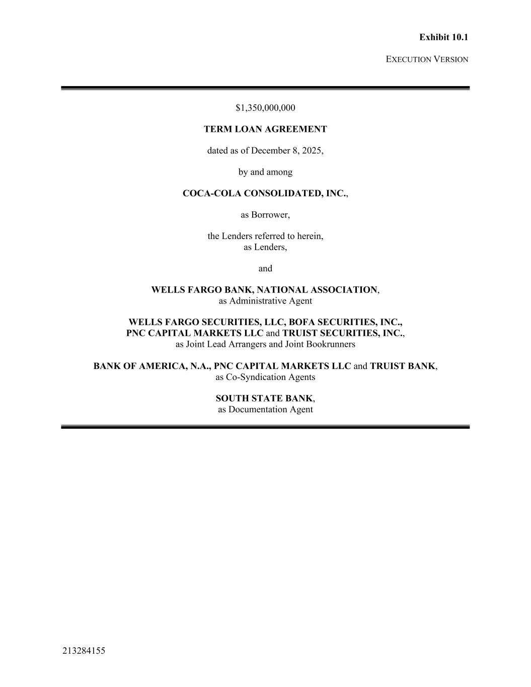 Exhibit 10.1 EXECUTION VERSION 213284155 $1,350,000,000 TERM LOAN AGREEMENT dated as of December 8, 2025, by and among COCA-COLA CONSOLIDATED, INC., as Borrower, the Lenders referred to herein, as Lenders, and WELLS FARGO BANK, NATIONAL ASSOCIATION, as Administrative Agent WELLS FARGO SECURITIES, LLC, BOFA SECURITIES, INC., PNC CAPITAL MARKETS LLC and TRUIST SECURITIES, INC., as Joint Lead Arrangers and Joint Bookrunners BANK OF AMERICA, N.A., PNC CAPITAL MARKETS LLC and TRUIST BANK, as Co-Syndication Agents SOUTH STATE BANK, as Documentation Agent