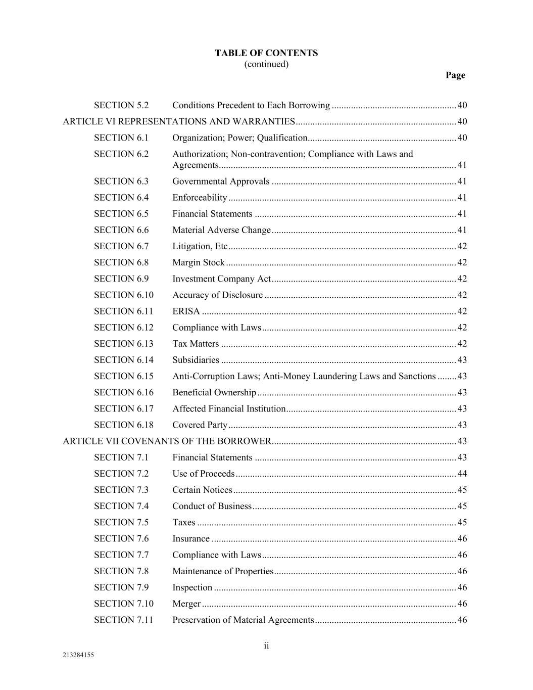 TABLE OF CONTENTS (continued) Page ii 213284155 SECTION 5.2 Conditions Precedent to Each Borrowing .................................................... 40 ARTICLE VI REPRESENTATIONS AND WARRANTIES ................................................................... 40 SECTION 6.1 Organization; Power; Qualification .............................................................. 40 SECTION 6.2 Authorization; Non-contravention; Compliance with Laws and Agreements................................................................................................... 41 SECTION 6.3 Governmental Approvals ............................................................................. 41 SECTION 6.4 Enforceability ............................................................................................... 41 SECTION 6.5 Financial Statements .................................................................................... 41 SECTION 6.6 Material Adverse Change ............................................................................. 41 SECTION 6.7 Litigation, Etc ............................................................................................... 42 SECTION 6.8 Margin Stock ................................................................................................ 42 SECTION 6.9 Investment Company Act ............................................................................. 42 SECTION 6.10 Accuracy of Disclosure ................................................................................ 42 SECTION 6.11 ERISA .......................................................................................................... 42 SECTION 6.12 Compliance with Laws ................................................................................. 42 SECTION 6.13 Tax Matters .................................................................................................. 42 SECTION 6.14 Subsidiaries .................................................................................................. 43 SECTION 6.15 Anti-Corruption Laws; Anti-Money Laundering Laws and Sanctions ........ 43 SECTION 6.16 Beneficial Ownership ................................................................................... 43 SECTION 6.17 Affected Financial Institution ....................................................................... 43 SECTION 6.18 Covered Party ............................................................................................... 43 ARTICLE VII COVENANTS OF THE BORROWER ............................................................................. 43 SECTION 7.1 Financial Statements .................................................................................... 43 SECTION 7.2 Use of Proceeds ............................................................................................ 44 SECTION 7.3 Certain Notices ............................................................................................. 45 SECTION 7.4 Conduct of Business ..................................................................................... 45 SECTION 7.5 Taxes ............................................................................................................ 45 SECTION 7.6 Insurance ...................................................................................................... 46 SECTION 7.7 Compliance with Laws ................................................................................. 46 SECTION 7.8 Maintenance of Properties ............................................................................ 46 SECTION 7.9 Inspection ..................................................................................................... 46 SECTION 7.10 Merger .......................................................................................................... 46 SECTION 7.11 Preservation of Material Agreements ........................................................... 46