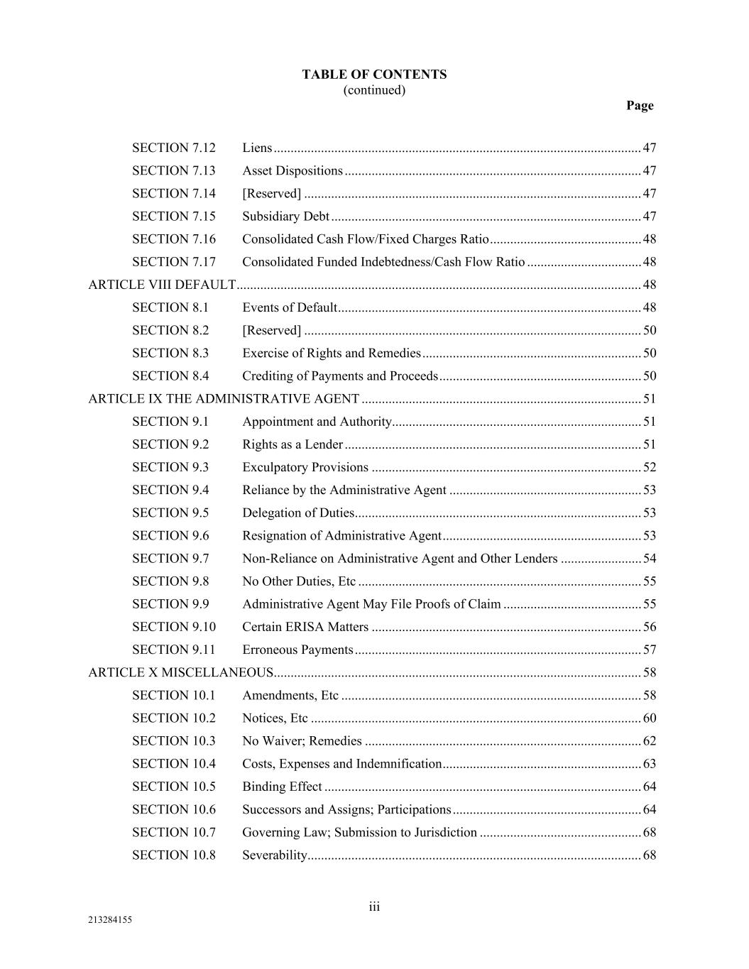 TABLE OF CONTENTS (continued) Page iii 213284155 SECTION 7.12 Liens ............................................................................................................. 47 SECTION 7.13 Asset Dispositions ........................................................................................ 47 SECTION 7.14 [Reserved] .................................................................................................... 47 SECTION 7.15 Subsidiary Debt ............................................................................................ 47 SECTION 7.16 Consolidated Cash Flow/Fixed Charges Ratio ............................................. 48 SECTION 7.17 Consolidated Funded Indebtedness/Cash Flow Ratio .................................. 48 ARTICLE VIII DEFAULT ........................................................................................................................ 48 SECTION 8.1 Events of Default .......................................................................................... 48 SECTION 8.2 [Reserved] .................................................................................................... 50 SECTION 8.3 Exercise of Rights and Remedies ................................................................. 50 SECTION 8.4 Crediting of Payments and Proceeds ............................................................ 50 ARTICLE IX THE ADMINISTRATIVE AGENT ................................................................................... 51 SECTION 9.1 Appointment and Authority.......................................................................... 51 SECTION 9.2 Rights as a Lender ........................................................................................ 51 SECTION 9.3 Exculpatory Provisions ................................................................................ 52 SECTION 9.4 Reliance by the Administrative Agent ......................................................... 53 SECTION 9.5 Delegation of Duties ..................................................................................... 53 SECTION 9.6 Resignation of Administrative Agent ........................................................... 53 SECTION 9.7 Non-Reliance on Administrative Agent and Other Lenders ........................ 54 SECTION 9.8 No Other Duties, Etc .................................................................................... 55 SECTION 9.9 Administrative Agent May File Proofs of Claim ......................................... 55 SECTION 9.10 Certain ERISA Matters ................................................................................ 56 SECTION 9.11 Erroneous Payments ..................................................................................... 57 ARTICLE X MISCELLANEOUS............................................................................................................. 58 SECTION 10.1 Amendments, Etc ......................................................................................... 58 SECTION 10.2 Notices, Etc .................................................................................................. 60 SECTION 10.3 No Waiver; Remedies .................................................................................. 62 SECTION 10.4 Costs, Expenses and Indemnification ........................................................... 63 SECTION 10.5 Binding Effect .............................................................................................. 64 SECTION 10.6 Successors and Assigns; Participations ........................................................ 64 SECTION 10.7 Governing Law; Submission to Jurisdiction ................................................ 68 SECTION 10.8 Severability................................................................................................... 68