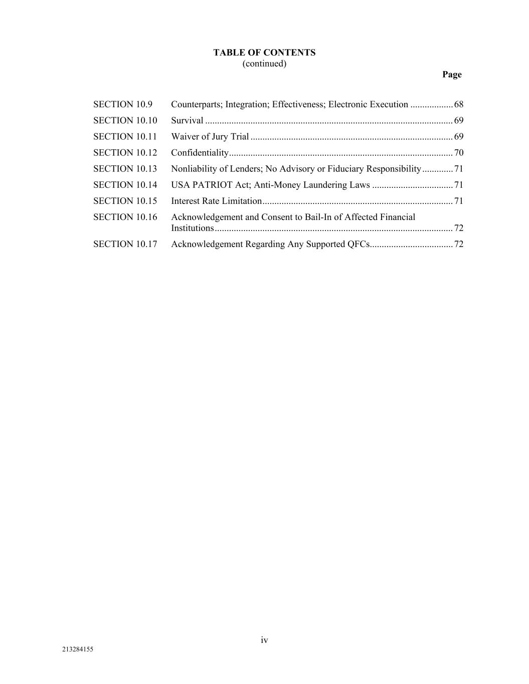 TABLE OF CONTENTS (continued) Page iv 213284155 SECTION 10.9 Counterparts; Integration; Effectiveness; Electronic Execution .................. 68 SECTION 10.10 Survival ........................................................................................................ 69 SECTION 10.11 Waiver of Jury Trial ..................................................................................... 69 SECTION 10.12 Confidentiality .............................................................................................. 70 SECTION 10.13 Nonliability of Lenders; No Advisory or Fiduciary Responsibility ............. 71 SECTION 10.14 USA PATRIOT Act; Anti-Money Laundering Laws .................................. 71 SECTION 10.15 Interest Rate Limitation ................................................................................ 71 SECTION 10.16 Acknowledgement and Consent to Bail-In of Affected Financial Institutions .................................................................................................... 72 SECTION 10.17 Acknowledgement Regarding Any Supported QFCs ................................... 72
