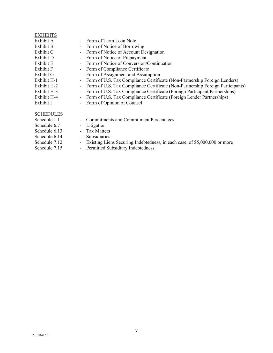 v 213284155 EXHIBITS Exhibit A - Form of Term Loan Note Exhibit B - Form of Notice of Borrowing Exhibit C - Form of Notice of Account Designation Exhibit D - Form of Notice of Prepayment Exhibit E - Form of Notice of Conversion/Continuation Exhibit F - Form of Compliance Certificate Exhibit G - Form of Assignment and Assumption Exhibit H-1 - Form of U.S. Tax Compliance Certificate (Non-Partnership Foreign Lenders) Exhibit H-2 - Form of U.S. Tax Compliance Certificate (Non-Partnership Foreign Participants) Exhibit H-3 - Form of U.S. Tax Compliance Certificate (Foreign Participant Partnerships) Exhibit H-4 - Form of U.S. Tax Compliance Certificate (Foreign Lender Partnerships) Exhibit I - Form of Opinion of Counsel SCHEDULES Schedule 1.1 - Commitments and Commitment Percentages Schedule 6.7 - Litigation Schedule 6.13 - Tax Matters Schedule 6.14 - Subsidiaries Schedule 7.12 - Existing Liens Securing Indebtedness, in each case, of $5,000,000 or more Schedule 7.15 - Permitted Subsidiary Indebtedness