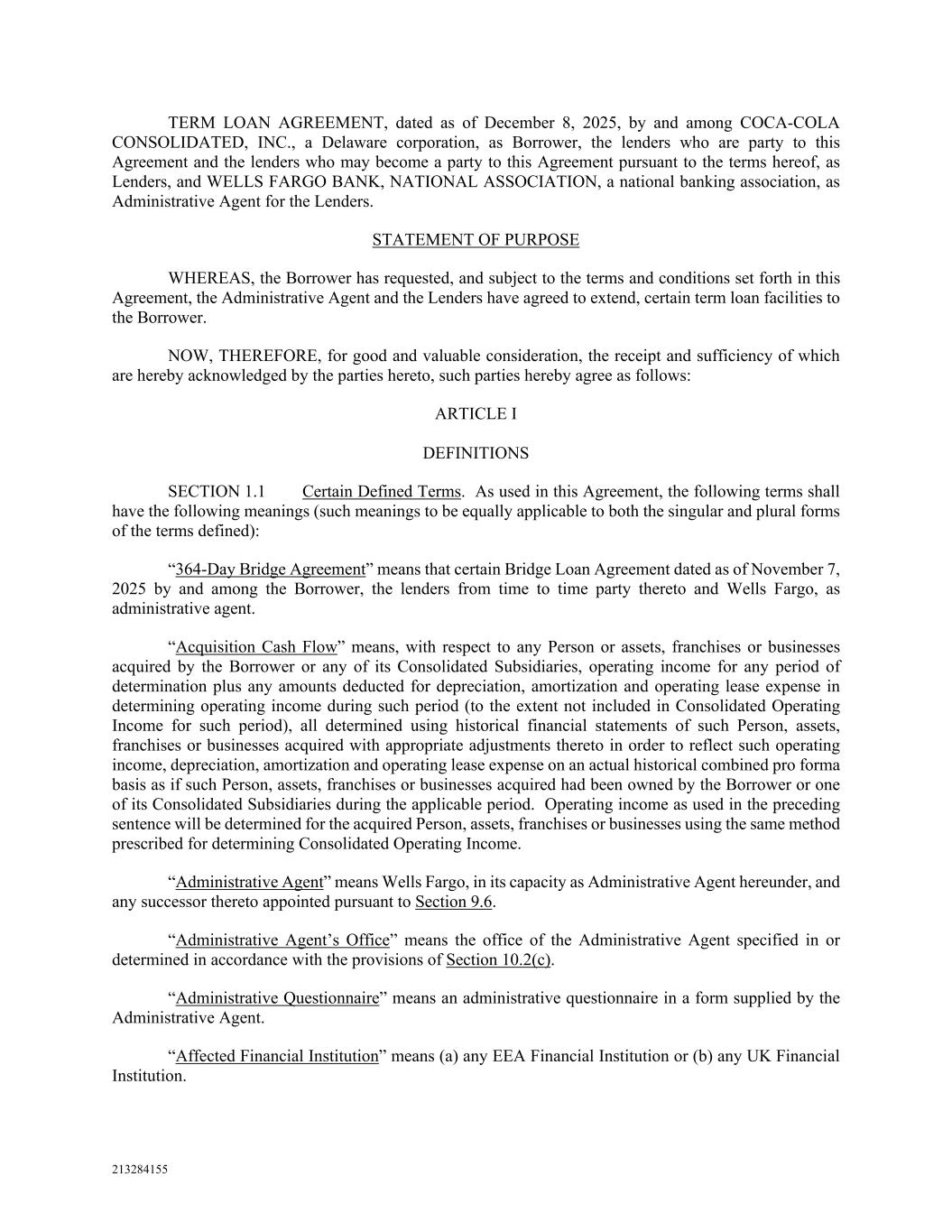 213284155 TERM LOAN AGREEMENT, dated as of December 8, 2025, by and among COCA-COLA CONSOLIDATED, INC., a Delaware corporation, as Borrower, the lenders who are party to this Agreement and the lenders who may become a party to this Agreement pursuant to the terms hereof, as Lenders, and WELLS FARGO BANK, NATIONAL ASSOCIATION, a national banking association, as Administrative Agent for the Lenders. STATEMENT OF PURPOSE WHEREAS, the Borrower has requested, and subject to the terms and conditions set forth in this Agreement, the Administrative Agent and the Lenders have agreed to extend, certain term loan facilities to the Borrower. NOW, THEREFORE, for good and valuable consideration, the receipt and sufficiency of which are hereby acknowledged by the parties hereto, such parties hereby agree as follows: ARTICLE I DEFINITIONS SECTION 1.1 Certain Defined Terms. As used in this Agreement, the following terms shall have the following meanings (such meanings to be equally applicable to both the singular and plural forms of the terms defined): “364-Day Bridge Agreement” means that certain Bridge Loan Agreement dated as of November 7, 2025 by and among the Borrower, the lenders from time to time party thereto and Wells Fargo, as administrative agent. “Acquisition Cash Flow” means, with respect to any Person or assets, franchises or businesses acquired by the Borrower or any of its Consolidated Subsidiaries, operating income for any period of determination plus any amounts deducted for depreciation, amortization and operating lease expense in determining operating income during such period (to the extent not included in Consolidated Operating Income for such period), all determined using historical financial statements of such Person, assets, franchises or businesses acquired with appropriate adjustments thereto in order to reflect such operating income, depreciation, amortization and operating lease expense on an actual historical combined pro forma basis as if such Person, assets, franchises or businesses acquired had been owned by the Borrower or one of its Consolidated Subsidiaries during the applicable period. Operating income as used in the preceding sentence will be determined for the acquired Person, assets, franchises or businesses using the same method prescribed for determining Consolidated Operating Income. “Administrative Agent” means Wells Fargo, in its capacity as Administrative Agent hereunder, and any successor thereto appointed pursuant to Section 9.6. “Administrative Agent’s Office” means the office of the Administrative Agent specified in or determined in accordance with the provisions of Section 10.2(c). “Administrative Questionnaire” means an administrative questionnaire in a form supplied by the Administrative Agent. “Affected Financial Institution” means (a) any EEA Financial Institution or (b) any UK Financial Institution.