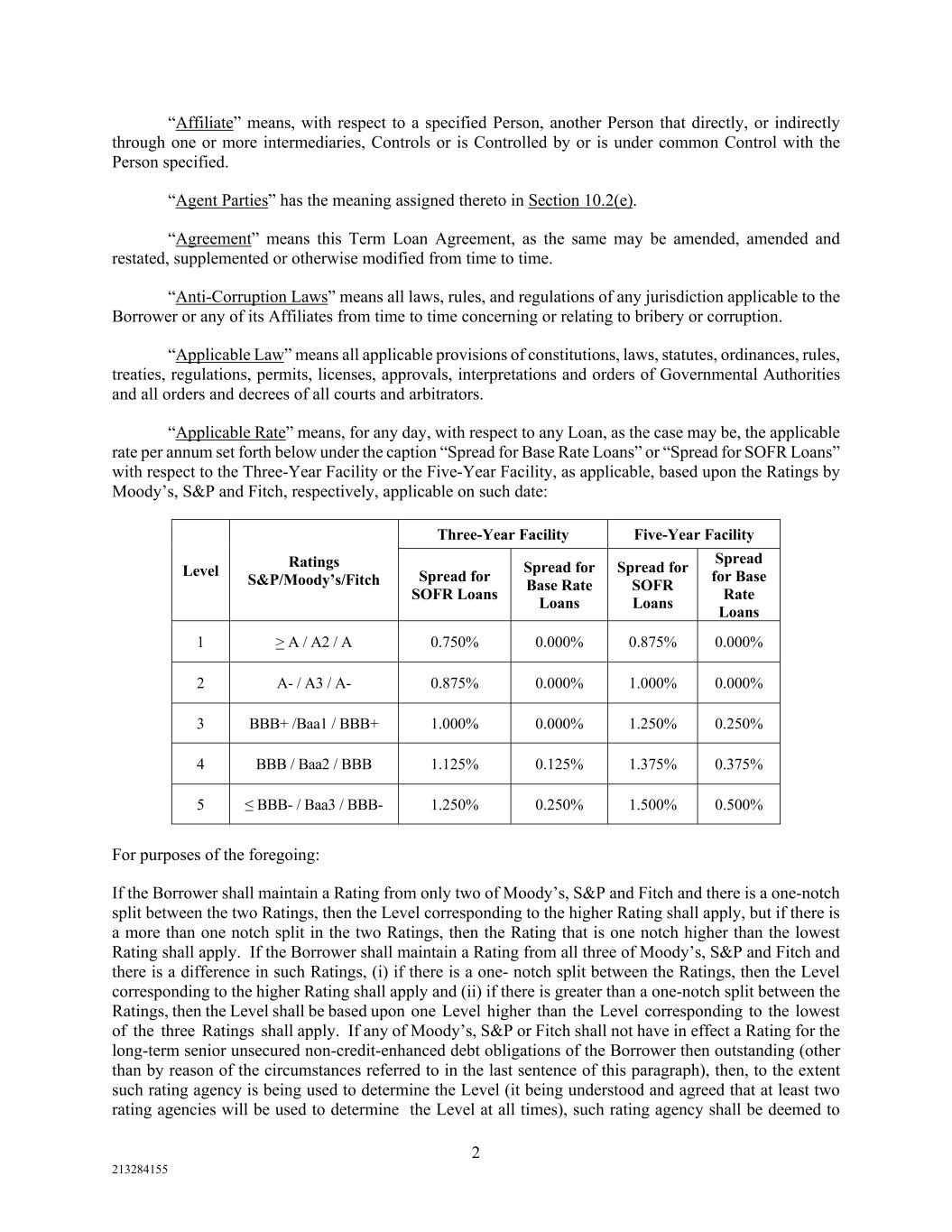2 213284155 “Affiliate” means, with respect to a specified Person, another Person that directly, or indirectly through one or more intermediaries, Controls or is Controlled by or is under common Control with the Person specified. “Agent Parties” has the meaning assigned thereto in Section 10.2(e). “Agreement” means this Term Loan Agreement, as the same may be amended, amended and restated, supplemented or otherwise modified from time to time. “Anti-Corruption Laws” means all laws, rules, and regulations of any jurisdiction applicable to the Borrower or any of its Affiliates from time to time concerning or relating to bribery or corruption. “Applicable Law” means all applicable provisions of constitutions, laws, statutes, ordinances, rules, treaties, regulations, permits, licenses, approvals, interpretations and orders of Governmental Authorities and all orders and decrees of all courts and arbitrators. “Applicable Rate” means, for any day, with respect to any Loan, as the case may be, the applicable rate per annum set forth below under the caption “Spread for Base Rate Loans” or “Spread for SOFR Loans” with respect to the Three-Year Facility or the Five-Year Facility, as applicable, based upon the Ratings by Moody’s, S&P and Fitch, respectively, applicable on such date: Level Ratings S&P/Moody’s/Fitch Three-Year Facility Five-Year Facility Spread for SOFR Loans Spread for Base Rate Loans Spread for SOFR Loans Spread for Base Rate Loans 1 > A / A2 / A 0.750% 0.000% 0.875% 0.000% 2 A- / A3 / A- 0.875% 0.000% 1.000% 0.000% 3 BBB+ /Baa1 / BBB+ 1.000% 0.000% 1.250% 0.250% 4 BBB / Baa2 / BBB 1.125% 0.125% 1.375% 0.375% 5 ≤ BBB- / Baa3 / BBB- 1.250% 0.250% 1.500% 0.500% For purposes of the foregoing: If the Borrower shall maintain a Rating from only two of Moody’s, S&P and Fitch and there is a one-notch split between the two Ratings, then the Level corresponding to the higher Rating shall apply, but if there is a more than one notch split in the two Ratings, then the Rating that is one notch higher than the lowest Rating shall apply. If the Borrower shall maintain a Rating from all three of Moody’s, S&P and Fitch and there is a difference in such Ratings, (i) if there is a one- notch split between the Ratings, then the Level corresponding to the higher Rating shall apply and (ii) if there is greater than a one-notch split between the Ratings, then the Level shall be based upon one Level higher than the Level corresponding to the lowest of the three Ratings shall apply. If any of Moody’s, S&P or Fitch shall not have in effect a Rating for the long-term senior unsecured non-credit-enhanced debt obligations of the Borrower then outstanding (other than by reason of the circumstances referred to in the last sentence of this paragraph), then, to the extent such rating agency is being used to determine the Level (it being understood and agreed that at least two rating agencies will be used to determine the Level at all times), such rating agency shall be deemed to