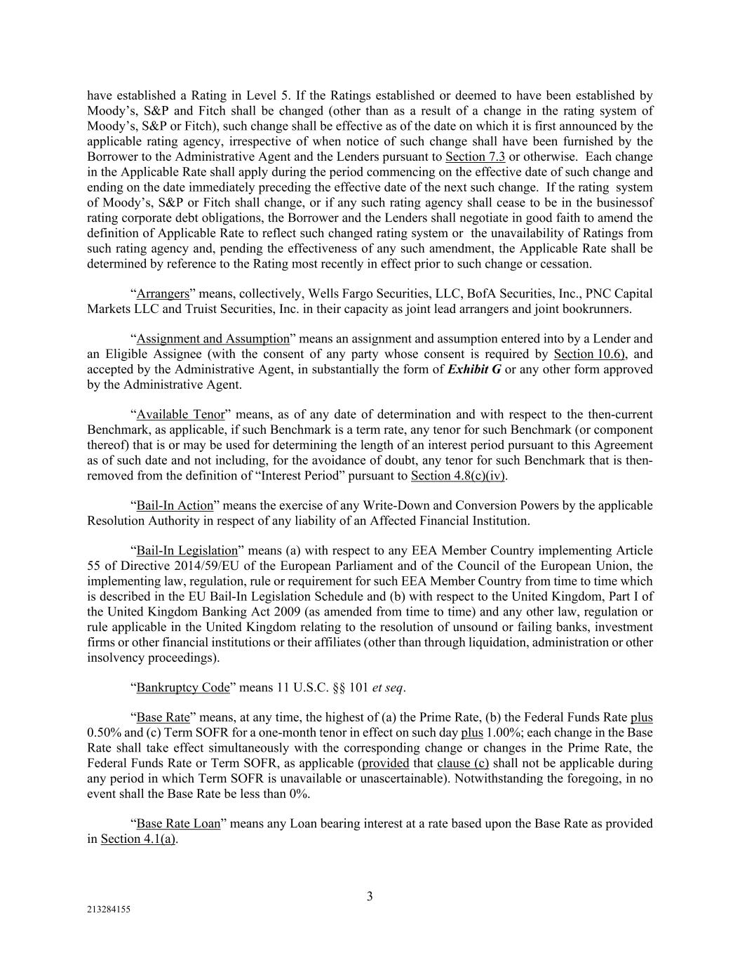 3 213284155 have established a Rating in Level 5. If the Ratings established or deemed to have been established by Moody’s, S&P and Fitch shall be changed (other than as a result of a change in the rating system of Moody’s, S&P or Fitch), such change shall be effective as of the date on which it is first announced by the applicable rating agency, irrespective of when notice of such change shall have been furnished by the Borrower to the Administrative Agent and the Lenders pursuant to Section 7.3 or otherwise. Each change in the Applicable Rate shall apply during the period commencing on the effective date of such change and ending on the date immediately preceding the effective date of the next such change. If the rating system of Moody’s, S&P or Fitch shall change, or if any such rating agency shall cease to be in the business of rating corporate debt obligations, the Borrower and the Lenders shall negotiate in good faith to amend the definition of Applicable Rate to reflect such changed rating system or the unavailability of Ratings from such rating agency and, pending the effectiveness of any such amendment, the Applicable Rate shall be determined by reference to the Rating most recently in effect prior to such change or cessation. “Arrangers” means, collectively, Wells Fargo Securities, LLC, BofA Securities, Inc., PNC Capital Markets LLC and Truist Securities, Inc. in their capacity as joint lead arrangers and joint bookrunners. “Assignment and Assumption” means an assignment and assumption entered into by a Lender and an Eligible Assignee (with the consent of any party whose consent is required by Section 10.6), and accepted by the Administrative Agent, in substantially the form of Exhibit G or any other form approved by the Administrative Agent. “Available Tenor” means, as of any date of determination and with respect to the then-current Benchmark, as applicable, if such Benchmark is a term rate, any tenor for such Benchmark (or component thereof) that is or may be used for determining the length of an interest period pursuant to this Agreement as of such date and not including, for the avoidance of doubt, any tenor for such Benchmark that is then- removed from the definition of “Interest Period” pursuant to Section 4.8(c)(iv). “Bail-In Action” means the exercise of any Write-Down and Conversion Powers by the applicable Resolution Authority in respect of any liability of an Affected Financial Institution. “Bail-In Legislation” means (a) with respect to any EEA Member Country implementing Article 55 of Directive 2014/59/EU of the European Parliament and of the Council of the European Union, the implementing law, regulation, rule or requirement for such EEA Member Country from time to time which is described in the EU Bail-In Legislation Schedule and (b) with respect to the United Kingdom, Part I of the United Kingdom Banking Act 2009 (as amended from time to time) and any other law, regulation or rule applicable in the United Kingdom relating to the resolution of unsound or failing banks, investment firms or other financial institutions or their affiliates (other than through liquidation, administration or other insolvency proceedings). “Bankruptcy Code” means 11 U.S.C. §§ 101 et seq. “Base Rate” means, at any time, the highest of (a) the Prime Rate, (b) the Federal Funds Rate plus 0.50% and (c) Term SOFR for a one-month tenor in effect on such day plus 1.00%; each change in the Base Rate shall take effect simultaneously with the corresponding change or changes in the Prime Rate, the Federal Funds Rate or Term SOFR, as applicable (provided that clause (c) shall not be applicable during any period in which Term SOFR is unavailable or unascertainable). Notwithstanding the foregoing, in no event shall the Base Rate be less than 0%. “Base Rate Loan” means any Loan bearing interest at a rate based upon the Base Rate as provided in Section 4.1(a).