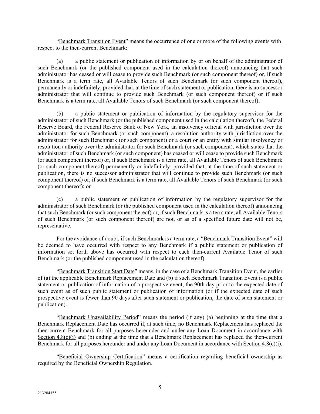 5 213284155 “Benchmark Transition Event” means the occurrence of one or more of the following events with respect to the then-current Benchmark: (a) a public statement or publication of information by or on behalf of the administrator of such Benchmark (or the published component used in the calculation thereof) announcing that such administrator has ceased or will cease to provide such Benchmark (or such component thereof) or, if such Benchmark is a term rate, all Available Tenors of such Benchmark (or such component thereof), permanently or indefinitely; provided that, at the time of such statement or publication, there is no successor administrator that will continue to provide such Benchmark (or such component thereof) or if such Benchmark is a term rate, all Available Tenors of such Benchmark (or such component thereof); (b) a public statement or publication of information by the regulatory supervisor for the administrator of such Benchmark (or the published component used in the calculation thereof), the Federal Reserve Board, the Federal Reserve Bank of New York, an insolvency official with jurisdiction over the administrator for such Benchmark (or such component), a resolution authority with jurisdiction over the administrator for such Benchmark (or such component) or a court or an entity with similar insolvency or resolution authority over the administrator for such Benchmark (or such component), which states that the administrator of such Benchmark (or such component) has ceased or will cease to provide such Benchmark (or such component thereof) or, if such Benchmark is a term rate, all Available Tenors of such Benchmark (or such component thereof) permanently or indefinitely; provided that, at the time of such statement or publication, there is no successor administrator that will continue to provide such Benchmark (or such component thereof) or, if such Benchmark is a term rate, all Available Tenors of such Benchmark (or such component thereof); or (c) a public statement or publication of information by the regulatory supervisor for the administrator of such Benchmark (or the published component used in the calculation thereof) announcing that such Benchmark (or such component thereof) or, if such Benchmark is a term rate, all Available Tenors of such Benchmark (or such component thereof) are not, or as of a specified future date will not be, representative. For the avoidance of doubt, if such Benchmark is a term rate, a “Benchmark Transition Event” will be deemed to have occurred with respect to any Benchmark if a public statement or publication of information set forth above has occurred with respect to each then-current Available Tenor of such Benchmark (or the published component used in the calculation thereof). “Benchmark Transition Start Date” means, in the case of a Benchmark Transition Event, the earlier of (a) the applicable Benchmark Replacement Date and (b) if such Benchmark Transition Event is a public statement or publication of information of a prospective event, the 90th day prior to the expected date of such event as of such public statement or publication of information (or if the expected date of such prospective event is fewer than 90 days after such statement or publication, the date of such statement or publication). “Benchmark Unavailability Period” means the period (if any) (a) beginning at the time that a Benchmark Replacement Date has occurred if, at such time, no Benchmark Replacement has replaced the then-current Benchmark for all purposes hereunder and under any Loan Document in accordance with Section 4.8(c)(i) and (b) ending at the time that a Benchmark Replacement has replaced the then-current Benchmark for all purposes hereunder and under any Loan Document in accordance with Section 4.8(c)(i). “Beneficial Ownership Certification” means a certification regarding beneficial ownership as required by the Beneficial Ownership Regulation.