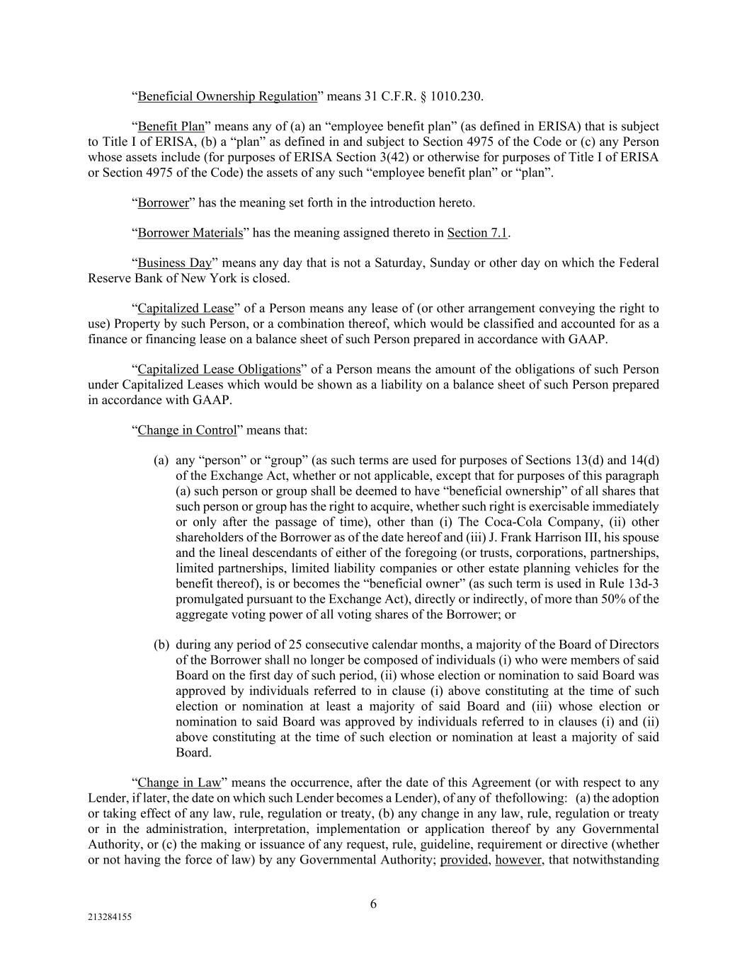 6 213284155 “Beneficial Ownership Regulation” means 31 C.F.R. § 1010.230. “Benefit Plan” means any of (a) an “employee benefit plan” (as defined in ERISA) that is subject to Title I of ERISA, (b) a “plan” as defined in and subject to Section 4975 of the Code or (c) any Person whose assets include (for purposes of ERISA Section 3(42) or otherwise for purposes of Title I of ERISA or Section 4975 of the Code) the assets of any such “employee benefit plan” or “plan”. “Borrower” has the meaning set forth in the introduction hereto. “Borrower Materials” has the meaning assigned thereto in Section 7.1. “Business Day” means any day that is not a Saturday, Sunday or other day on which the Federal Reserve Bank of New York is closed. “Capitalized Lease” of a Person means any lease of (or other arrangement conveying the right to use) Property by such Person, or a combination thereof, which would be classified and accounted for as a finance or financing lease on a balance sheet of such Person prepared in accordance with GAAP. “Capitalized Lease Obligations” of a Person means the amount of the obligations of such Person under Capitalized Leases which would be shown as a liability on a balance sheet of such Person prepared in accordance with GAAP. “Change in Control” means that: (a) any “person” or “group” (as such terms are used for purposes of Sections 13(d) and 14(d) of the Exchange Act, whether or not applicable, except that for purposes of this paragraph (a) such person or group shall be deemed to have “beneficial ownership” of all shares that such person or group has the right to acquire, whether such right is exercisable immediately or only after the passage of time), other than (i) The Coca-Cola Company, (ii) other shareholders of the Borrower as of the date hereof and (iii) J. Frank Harrison III, his spouse and the lineal descendants of either of the foregoing (or trusts, corporations, partnerships, limited partnerships, limited liability companies or other estate planning vehicles for the benefit thereof), is or becomes the “beneficial owner” (as such term is used in Rule 13d-3 promulgated pursuant to the Exchange Act), directly or indirectly, of more than 50% of the aggregate voting power of all voting shares of the Borrower; or (b) during any period of 25 consecutive calendar months, a majority of the Board of Directors of the Borrower shall no longer be composed of individuals (i) who were members of said Board on the first day of such period, (ii) whose election or nomination to said Board was approved by individuals referred to in clause (i) above constituting at the time of such election or nomination at least a majority of said Board and (iii) whose election or nomination to said Board was approved by individuals referred to in clauses (i) and (ii) above constituting at the time of such election or nomination at least a majority of said Board. “Change in Law” means the occurrence, after the date of this Agreement (or with respect to any Lender, if later, the date on which such Lender becomes a Lender), of any of the following: (a) the adoption or taking effect of any law, rule, regulation or treaty, (b) any change in any law, rule, regulation or treaty or in the administration, interpretation, implementation or application thereof by any Governmental Authority, or (c) the making or issuance of any request, rule, guideline, requirement or directive (whether or not having the force of law) by any Governmental Authority; provided, however, that notwithstanding