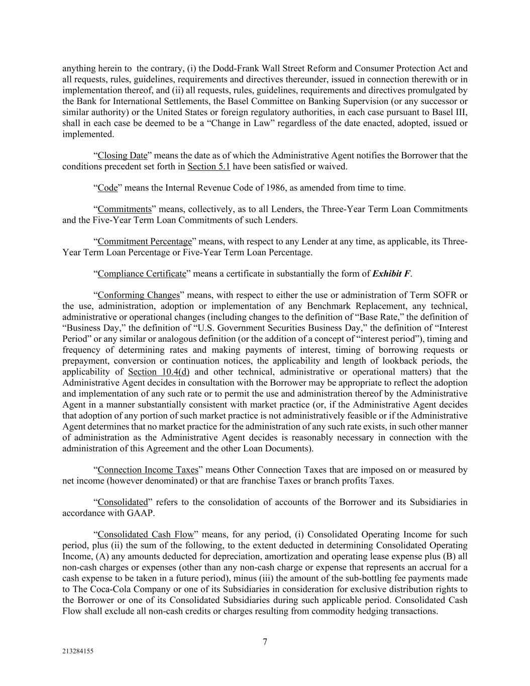 7 213284155 anything herein to the contrary, (i) the Dodd-Frank Wall Street Reform and Consumer Protection Act and all requests, rules, guidelines, requirements and directives thereunder, issued in connection therewith or in implementation thereof, and (ii) all requests, rules, guidelines, requirements and directives promulgated by the Bank for International Settlements, the Basel Committee on Banking Supervision (or any successor or similar authority) or the United States or foreign regulatory authorities, in each case pursuant to Basel III, shall in each case be deemed to be a “Change in Law” regardless of the date enacted, adopted, issued or implemented. “Closing Date” means the date as of which the Administrative Agent notifies the Borrower that the conditions precedent set forth in Section 5.1 have been satisfied or waived. “Code” means the Internal Revenue Code of 1986, as amended from time to time. “Commitments” means, collectively, as to all Lenders, the Three-Year Term Loan Commitments and the Five-Year Term Loan Commitments of such Lenders. “Commitment Percentage” means, with respect to any Lender at any time, as applicable, its Three- Year Term Loan Percentage or Five-Year Term Loan Percentage. “Compliance Certificate” means a certificate in substantially the form of Exhibit F. “Conforming Changes” means, with respect to either the use or administration of Term SOFR or the use, administration, adoption or implementation of any Benchmark Replacement, any technical, administrative or operational changes (including changes to the definition of “Base Rate,” the definition of “Business Day,” the definition of “U.S. Government Securities Business Day,” the definition of “Interest Period” or any similar or analogous definition (or the addition of a concept of “interest period”), timing and frequency of determining rates and making payments of interest, timing of borrowing requests or prepayment, conversion or continuation notices, the applicability and length of lookback periods, the applicability of Section 10.4(d) and other technical, administrative or operational matters) that the Administrative Agent decides in consultation with the Borrower may be appropriate to reflect the adoption and implementation of any such rate or to permit the use and administration thereof by the Administrative Agent in a manner substantially consistent with market practice (or, if the Administrative Agent decides that adoption of any portion of such market practice is not administratively feasible or if the Administrative Agent determines that no market practice for the administration of any such rate exists, in such other manner of administration as the Administrative Agent decides is reasonably necessary in connection with the administration of this Agreement and the other Loan Documents). “Connection Income Taxes” means Other Connection Taxes that are imposed on or measured by net income (however denominated) or that are franchise Taxes or branch profits Taxes. “Consolidated” refers to the consolidation of accounts of the Borrower and its Subsidiaries in accordance with GAAP. “Consolidated Cash Flow” means, for any period, (i) Consolidated Operating Income for such period, plus (ii) the sum of the following, to the extent deducted in determining Consolidated Operating Income, (A) any amounts deducted for depreciation, amortization and operating lease expense plus (B) all non-cash charges or expenses (other than any non-cash charge or expense that represents an accrual for a cash expense to be taken in a future period), minus (iii) the amount of the sub-bottling fee payments made to The Coca-Cola Company or one of its Subsidiaries in consideration for exclusive distribution rights to the Borrower or one of its Consolidated Subsidiaries during such applicable period. Consolidated Cash Flow shall exclude all non-cash credits or charges resulting from commodity hedging transactions.