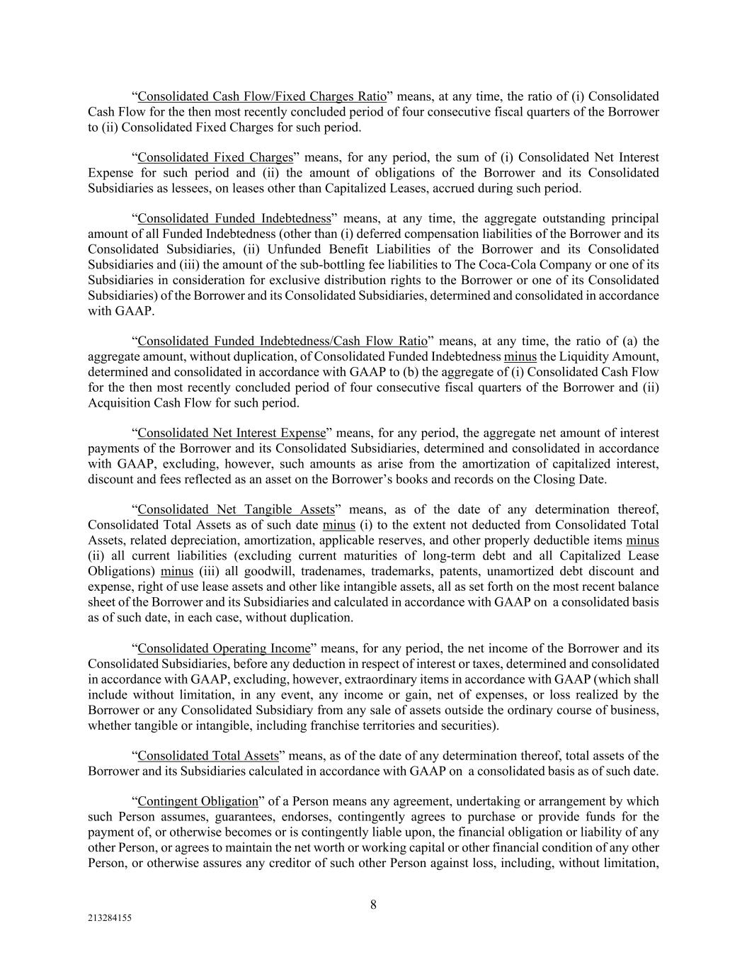 8 213284155 “Consolidated Cash Flow/Fixed Charges Ratio” means, at any time, the ratio of (i) Consolidated Cash Flow for the then most recently concluded period of four consecutive fiscal quarters of the Borrower to (ii) Consolidated Fixed Charges for such period. “Consolidated Fixed Charges” means, for any period, the sum of (i) Consolidated Net Interest Expense for such period and (ii) the amount of obligations of the Borrower and its Consolidated Subsidiaries as lessees, on leases other than Capitalized Leases, accrued during such period. “Consolidated Funded Indebtedness” means, at any time, the aggregate outstanding principal amount of all Funded Indebtedness (other than (i) deferred compensation liabilities of the Borrower and its Consolidated Subsidiaries, (ii) Unfunded Benefit Liabilities of the Borrower and its Consolidated Subsidiaries and (iii) the amount of the sub-bottling fee liabilities to The Coca-Cola Company or one of its Subsidiaries in consideration for exclusive distribution rights to the Borrower or one of its Consolidated Subsidiaries) of the Borrower and its Consolidated Subsidiaries, determined and consolidated in accordance with GAAP. “Consolidated Funded Indebtedness/Cash Flow Ratio” means, at any time, the ratio of (a) the aggregate amount, without duplication, of Consolidated Funded Indebtedness minus the Liquidity Amount, determined and consolidated in accordance with GAAP to (b) the aggregate of (i) Consolidated Cash Flow for the then most recently concluded period of four consecutive fiscal quarters of the Borrower and (ii) Acquisition Cash Flow for such period. “Consolidated Net Interest Expense” means, for any period, the aggregate net amount of interest payments of the Borrower and its Consolidated Subsidiaries, determined and consolidated in accordance with GAAP, excluding, however, such amounts as arise from the amortization of capitalized interest, discount and fees reflected as an asset on the Borrower’s books and records on the Closing Date. “Consolidated Net Tangible Assets” means, as of the date of any determination thereof, Consolidated Total Assets as of such date minus (i) to the extent not deducted from Consolidated Total Assets, related depreciation, amortization, applicable reserves, and other properly deductible items minus (ii) all current liabilities (excluding current maturities of long-term debt and all Capitalized Lease Obligations) minus (iii) all goodwill, tradenames, trademarks, patents, unamortized debt discount and expense, right of use lease assets and other like intangible assets, all as set forth on the most recent balance sheet of the Borrower and its Subsidiaries and calculated in accordance with GAAP on a consolidated basis as of such date, in each case, without duplication. “Consolidated Operating Income” means, for any period, the net income of the Borrower and its Consolidated Subsidiaries, before any deduction in respect of interest or taxes, determined and consolidated in accordance with GAAP, excluding, however, extraordinary items in accordance with GAAP (which shall include without limitation, in any event, any income or gain, net of expenses, or loss realized by the Borrower or any Consolidated Subsidiary from any sale of assets outside the ordinary course of business, whether tangible or intangible, including franchise territories and securities). “Consolidated Total Assets” means, as of the date of any determination thereof, total assets of the Borrower and its Subsidiaries calculated in accordance with GAAP on a consolidated basis as of such date. “Contingent Obligation” of a Person means any agreement, undertaking or arrangement by which such Person assumes, guarantees, endorses, contingently agrees to purchase or provide funds for the payment of, or otherwise becomes or is contingently liable upon, the financial obligation or liability of any other Person, or agrees to maintain the net worth or working capital or other financial condition of any other Person, or otherwise assures any creditor of such other Person against loss, including, without limitation,
