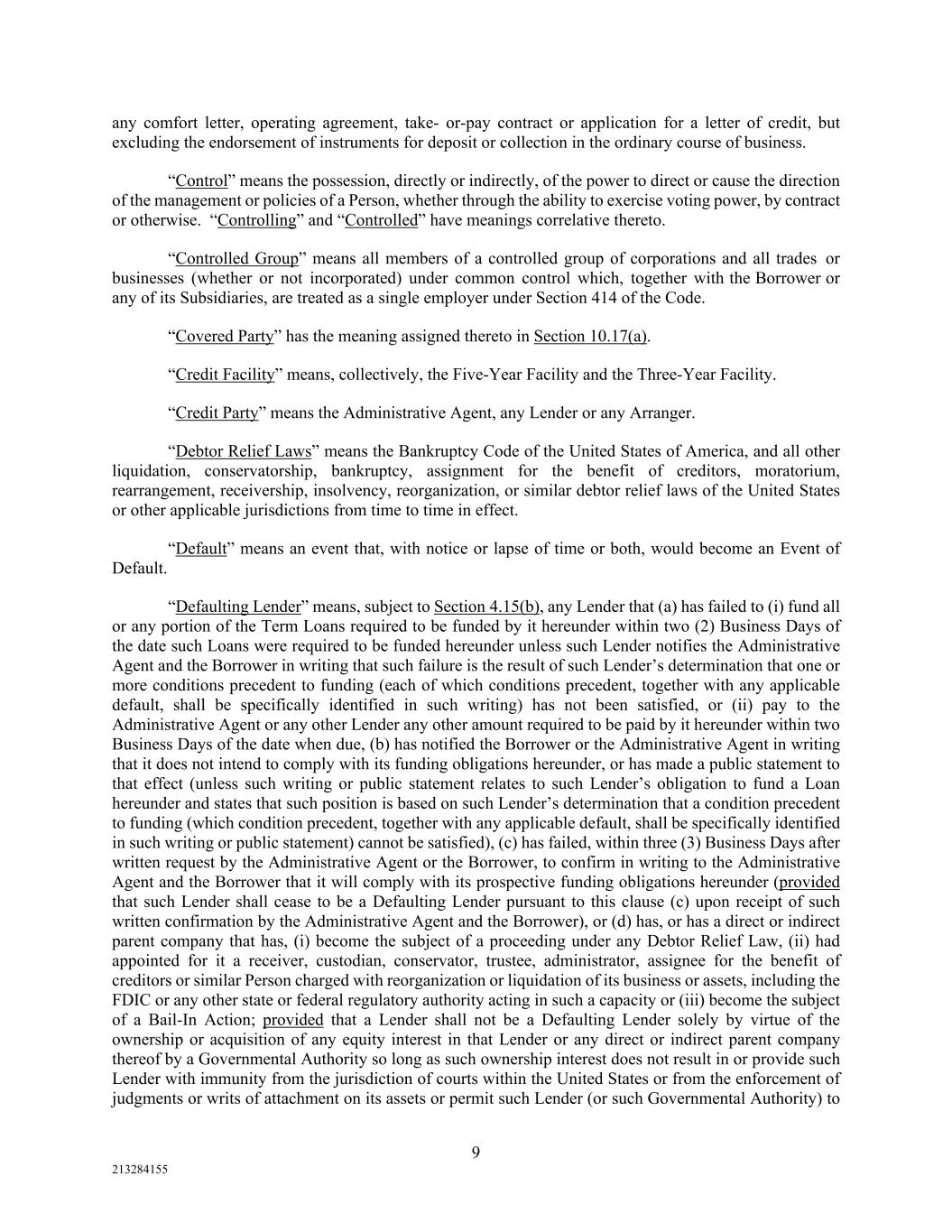 9 213284155 any comfort letter, operating agreement, take- or-pay contract or application for a letter of credit, but excluding the endorsement of instruments for deposit or collection in the ordinary course of business. “Control” means the possession, directly or indirectly, of the power to direct or cause the direction of the management or policies of a Person, whether through the ability to exercise voting power, by contract or otherwise. “Controlling” and “Controlled” have meanings correlative thereto. “Controlled Group” means all members of a controlled group of corporations and all trades or businesses (whether or not incorporated) under common control which, together with the Borrower or any of its Subsidiaries, are treated as a single employer under Section 414 of the Code. “Covered Party” has the meaning assigned thereto in Section 10.17(a). “Credit Facility” means, collectively, the Five-Year Facility and the Three-Year Facility. “Credit Party” means the Administrative Agent, any Lender or any Arranger. “Debtor Relief Laws” means the Bankruptcy Code of the United States of America, and all other liquidation, conservatorship, bankruptcy, assignment for the benefit of creditors, moratorium, rearrangement, receivership, insolvency, reorganization, or similar debtor relief laws of the United States or other applicable jurisdictions from time to time in effect. “Default” means an event that, with notice or lapse of time or both, would become an Event of Default. “Defaulting Lender” means, subject to Section 4.15(b), any Lender that (a) has failed to (i) fund all or any portion of the Term Loans required to be funded by it hereunder within two (2) Business Days of the date such Loans were required to be funded hereunder unless such Lender notifies the Administrative Agent and the Borrower in writing that such failure is the result of such Lender’s determination that one or more conditions precedent to funding (each of which conditions precedent, together with any applicable default, shall be specifically identified in such writing) has not been satisfied, or (ii) pay to the Administrative Agent or any other Lender any other amount required to be paid by it hereunder within two Business Days of the date when due, (b) has notified the Borrower or the Administrative Agent in writing that it does not intend to comply with its funding obligations hereunder, or has made a public statement to that effect (unless such writing or public statement relates to such Lender’s obligation to fund a Loan hereunder and states that such position is based on such Lender’s determination that a condition precedent to funding (which condition precedent, together with any applicable default, shall be specifically identified in such writing or public statement) cannot be satisfied), (c) has failed, within three (3) Business Days after written request by the Administrative Agent or the Borrower, to confirm in writing to the Administrative Agent and the Borrower that it will comply with its prospective funding obligations hereunder (provided that such Lender shall cease to be a Defaulting Lender pursuant to this clause (c) upon receipt of such written confirmation by the Administrative Agent and the Borrower), or (d) has, or has a direct or indirect parent company that has, (i) become the subject of a proceeding under any Debtor Relief Law, (ii) had appointed for it a receiver, custodian, conservator, trustee, administrator, assignee for the benefit of creditors or similar Person charged with reorganization or liquidation of its business or assets, including the FDIC or any other state or federal regulatory authority acting in such a capacity or (iii) become the subject of a Bail-In Action; provided that a Lender shall not be a Defaulting Lender solely by virtue of the ownership or acquisition of any equity interest in that Lender or any direct or indirect parent company thereof by a Governmental Authority so long as such ownership interest does not result in or provide such Lender with immunity from the jurisdiction of courts within the United States or from the enforcement of judgments or writs of attachment on its assets or permit such Lender (or such Governmental Authority) to