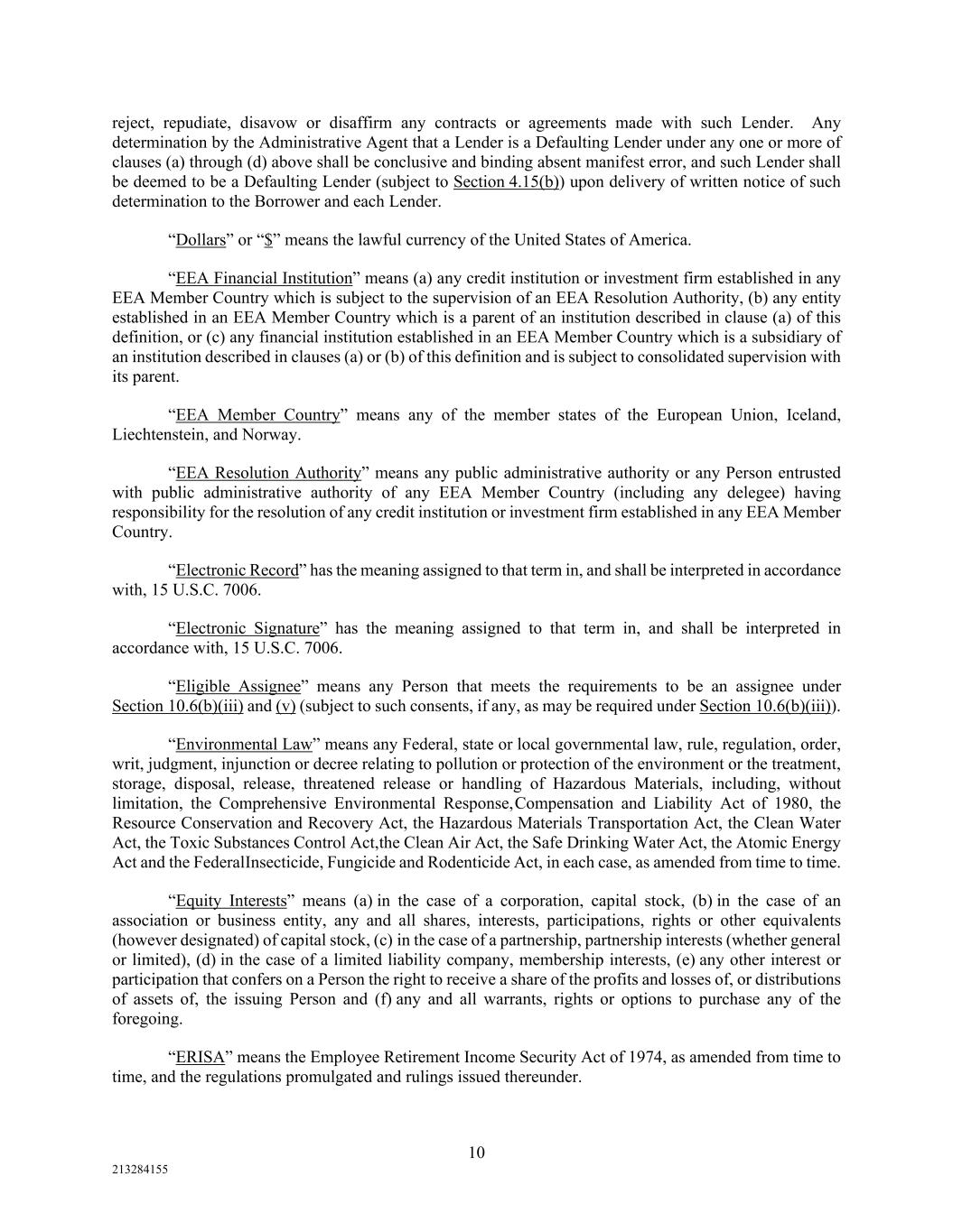 10 213284155 reject, repudiate, disavow or disaffirm any contracts or agreements made with such Lender. Any determination by the Administrative Agent that a Lender is a Defaulting Lender under any one or more of clauses (a) through (d) above shall be conclusive and binding absent manifest error, and such Lender shall be deemed to be a Defaulting Lender (subject to Section 4.15(b)) upon delivery of written notice of such determination to the Borrower and each Lender. “Dollars” or “$” means the lawful currency of the United States of America. “EEA Financial Institution” means (a) any credit institution or investment firm established in any EEA Member Country which is subject to the supervision of an EEA Resolution Authority, (b) any entity established in an EEA Member Country which is a parent of an institution described in clause (a) of this definition, or (c) any financial institution established in an EEA Member Country which is a subsidiary of an institution described in clauses (a) or (b) of this definition and is subject to consolidated supervision with its parent. “EEA Member Country” means any of the member states of the European Union, Iceland, Liechtenstein, and Norway. “EEA Resolution Authority” means any public administrative authority or any Person entrusted with public administrative authority of any EEA Member Country (including any delegee) having responsibility for the resolution of any credit institution or investment firm established in any EEA Member Country. “Electronic Record” has the meaning assigned to that term in, and shall be interpreted in accordance with, 15 U.S.C. 7006. “Electronic Signature” has the meaning assigned to that term in, and shall be interpreted in accordance with, 15 U.S.C. 7006. “Eligible Assignee” means any Person that meets the requirements to be an assignee under Section 10.6(b)(iii) and (v) (subject to such consents, if any, as may be required under Section 10.6(b)(iii)). “Environmental Law” means any Federal, state or local governmental law, rule, regulation, order, writ, judgment, injunction or decree relating to pollution or protection of the environment or the treatment, storage, disposal, release, threatened release or handling of Hazardous Materials, including, without limitation, the Comprehensive Environmental Response, Compensation and Liability Act of 1980, the Resource Conservation and Recovery Act, the Hazardous Materials Transportation Act, the Clean Water Act, the Toxic Substances Control Act, the Clean Air Act, the Safe Drinking Water Act, the Atomic Energy Act and the Federal Insecticide, Fungicide and Rodenticide Act, in each case, as amended from time to time. “Equity Interests” means (a) in the case of a corporation, capital stock, (b) in the case of an association or business entity, any and all shares, interests, participations, rights or other equivalents (however designated) of capital stock, (c) in the case of a partnership, partnership interests (whether general or limited), (d) in the case of a limited liability company, membership interests, (e) any other interest or participation that confers on a Person the right to receive a share of the profits and losses of, or distributions of assets of, the issuing Person and (f) any and all warrants, rights or options to purchase any of the foregoing. “ERISA” means the Employee Retirement Income Security Act of 1974, as amended from time to time, and the regulations promulgated and rulings issued thereunder.