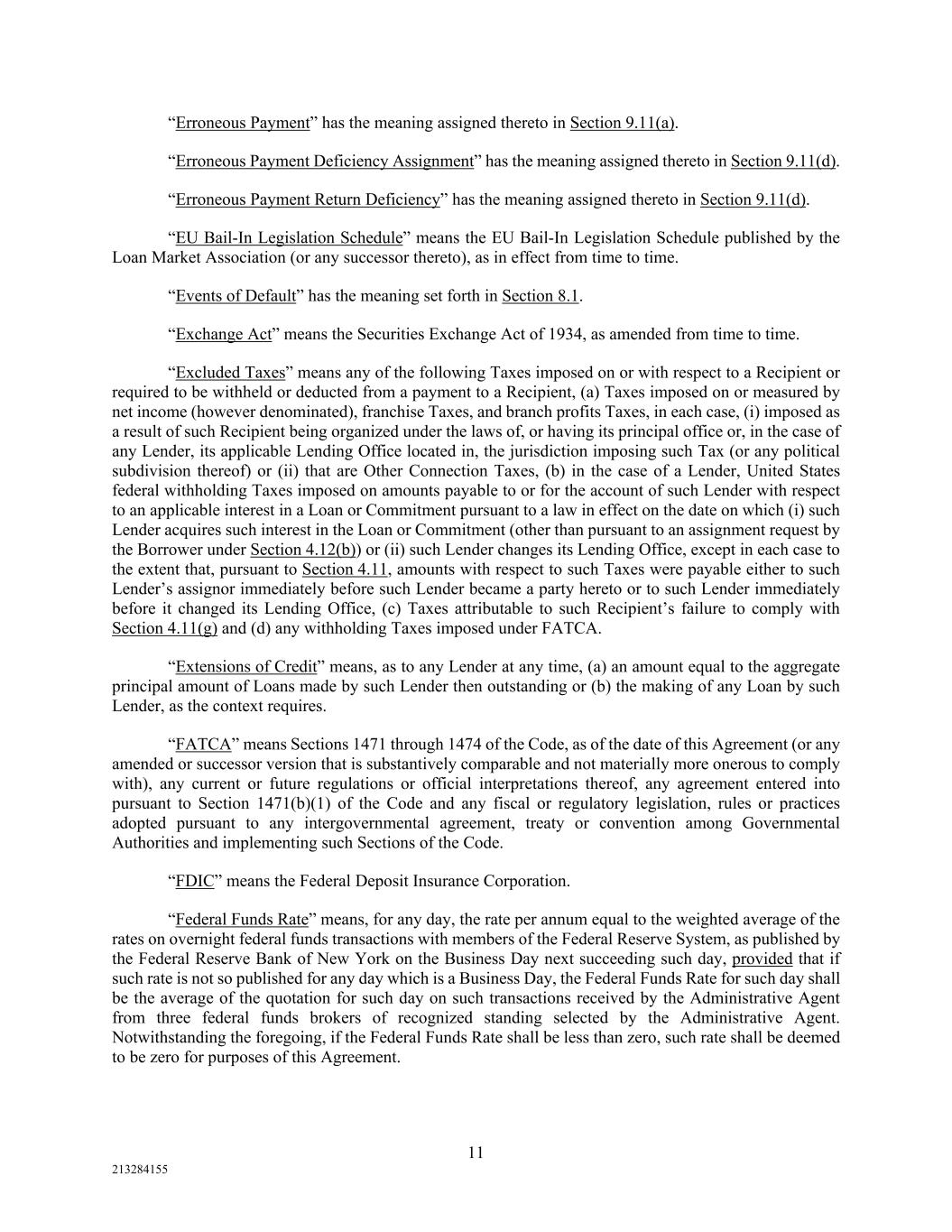 11 213284155 “Erroneous Payment” has the meaning assigned thereto in Section 9.11(a). “Erroneous Payment Deficiency Assignment” has the meaning assigned thereto in Section 9.11(d). “Erroneous Payment Return Deficiency” has the meaning assigned thereto in Section 9.11(d). “EU Bail-In Legislation Schedule” means the EU Bail-In Legislation Schedule published by the Loan Market Association (or any successor thereto), as in effect from time to time. “Events of Default” has the meaning set forth in Section 8.1. “Exchange Act” means the Securities Exchange Act of 1934, as amended from time to time. “Excluded Taxes” means any of the following Taxes imposed on or with respect to a Recipient or required to be withheld or deducted from a payment to a Recipient, (a) Taxes imposed on or measured by net income (however denominated), franchise Taxes, and branch profits Taxes, in each case, (i) imposed as a result of such Recipient being organized under the laws of, or having its principal office or, in the case of any Lender, its applicable Lending Office located in, the jurisdiction imposing such Tax (or any political subdivision thereof) or (ii) that are Other Connection Taxes, (b) in the case of a Lender, United States federal withholding Taxes imposed on amounts payable to or for the account of such Lender with respect to an applicable interest in a Loan or Commitment pursuant to a law in effect on the date on which (i) such Lender acquires such interest in the Loan or Commitment (other than pursuant to an assignment request by the Borrower under Section 4.12(b)) or (ii) such Lender changes its Lending Office, except in each case to the extent that, pursuant to Section 4.11, amounts with respect to such Taxes were payable either to such Lender’s assignor immediately before such Lender became a party hereto or to such Lender immediately before it changed its Lending Office, (c) Taxes attributable to such Recipient’s failure to comply with Section 4.11(g) and (d) any withholding Taxes imposed under FATCA. “Extensions of Credit” means, as to any Lender at any time, (a) an amount equal to the aggregate principal amount of Loans made by such Lender then outstanding or (b) the making of any Loan by such Lender, as the context requires. “FATCA” means Sections 1471 through 1474 of the Code, as of the date of this Agreement (or any amended or successor version that is substantively comparable and not materially more onerous to comply with), any current or future regulations or official interpretations thereof, any agreement entered into pursuant to Section 1471(b)(1) of the Code and any fiscal or regulatory legislation, rules or practices adopted pursuant to any intergovernmental agreement, treaty or convention among Governmental Authorities and implementing such Sections of the Code. “FDIC” means the Federal Deposit Insurance Corporation. “Federal Funds Rate” means, for any day, the rate per annum equal to the weighted average of the rates on overnight federal funds transactions with members of the Federal Reserve System, as published by the Federal Reserve Bank of New York on the Business Day next succeeding such day, provided that if such rate is not so published for any day which is a Business Day, the Federal Funds Rate for such day shall be the average of the quotation for such day on such transactions received by the Administrative Agent from three federal funds brokers of recognized standing selected by the Administrative Agent. Notwithstanding the foregoing, if the Federal Funds Rate shall be less than zero, such rate shall be deemed to be zero for purposes of this Agreement.