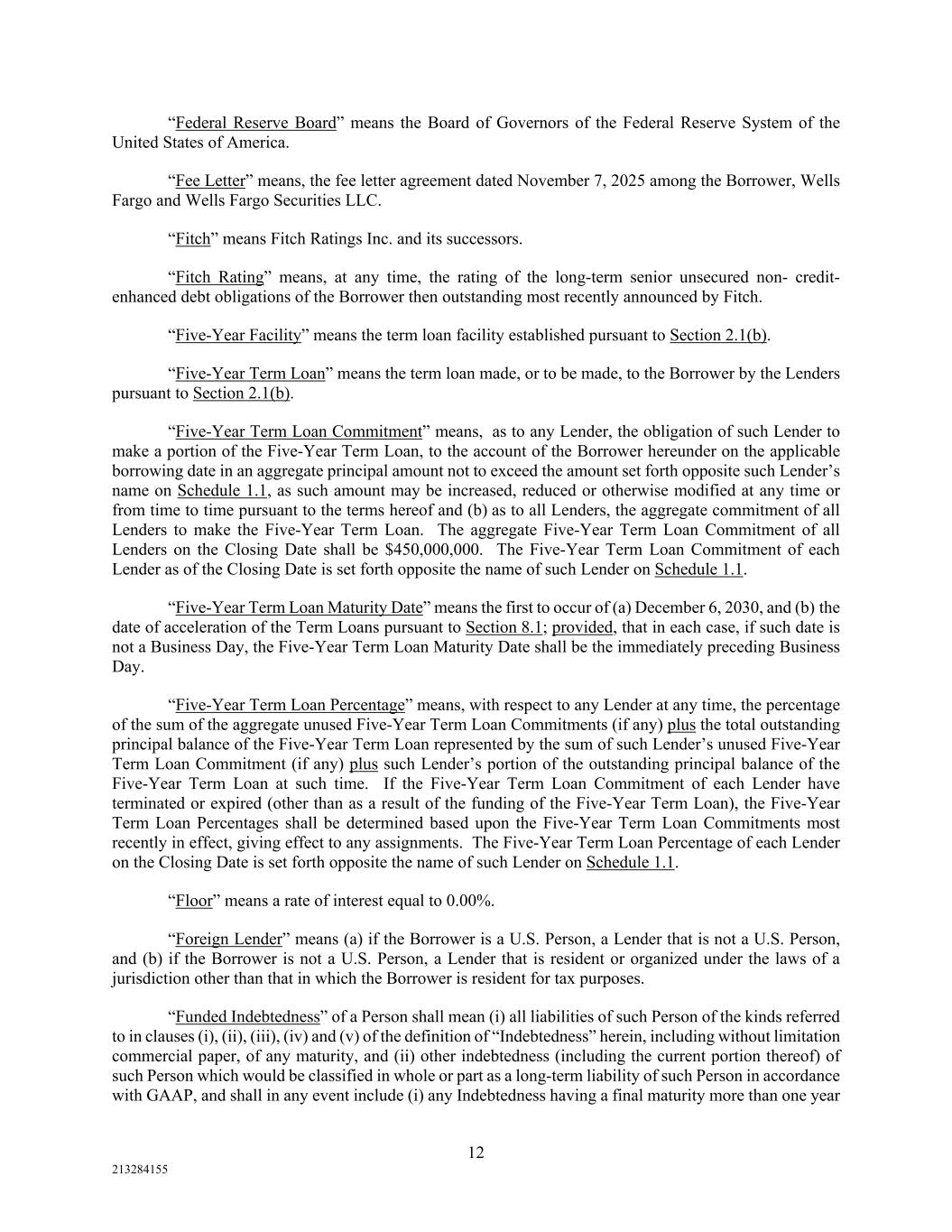 12 213284155 “Federal Reserve Board” means the Board of Governors of the Federal Reserve System of the United States of America. “Fee Letter” means, the fee letter agreement dated November 7, 2025 among the Borrower, Wells Fargo and Wells Fargo Securities LLC. “Fitch” means Fitch Ratings Inc. and its successors. “Fitch Rating” means, at any time, the rating of the long-term senior unsecured non- credit- enhanced debt obligations of the Borrower then outstanding most recently announced by Fitch. “Five-Year Facility” means the term loan facility established pursuant to Section 2.1(b). “Five-Year Term Loan” means the term loan made, or to be made, to the Borrower by the Lenders pursuant to Section 2.1(b). “Five-Year Term Loan Commitment” means, as to any Lender, the obligation of such Lender to make a portion of the Five-Year Term Loan, to the account of the Borrower hereunder on the applicable borrowing date in an aggregate principal amount not to exceed the amount set forth opposite such Lender’s name on Schedule 1.1, as such amount may be increased, reduced or otherwise modified at any time or from time to time pursuant to the terms hereof and (b) as to all Lenders, the aggregate commitment of all Lenders to make the Five-Year Term Loan. The aggregate Five-Year Term Loan Commitment of all Lenders on the Closing Date shall be $450,000,000. The Five-Year Term Loan Commitment of each Lender as of the Closing Date is set forth opposite the name of such Lender on Schedule 1.1. “Five-Year Term Loan Maturity Date” means the first to occur of (a) December 6, 2030, and (b) the date of acceleration of the Term Loans pursuant to Section 8.1; provided, that in each case, if such date is not a Business Day, the Five-Year Term Loan Maturity Date shall be the immediately preceding Business Day. “Five-Year Term Loan Percentage” means, with respect to any Lender at any time, the percentage of the sum of the aggregate unused Five-Year Term Loan Commitments (if any) plus the total outstanding principal balance of the Five-Year Term Loan represented by the sum of such Lender’s unused Five-Year Term Loan Commitment (if any) plus such Lender’s portion of the outstanding principal balance of the Five-Year Term Loan at such time. If the Five-Year Term Loan Commitment of each Lender have terminated or expired (other than as a result of the funding of the Five-Year Term Loan), the Five-Year Term Loan Percentages shall be determined based upon the Five-Year Term Loan Commitments most recently in effect, giving effect to any assignments. The Five-Year Term Loan Percentage of each Lender on the Closing Date is set forth opposite the name of such Lender on Schedule 1.1. “Floor” means a rate of interest equal to 0.00%. “Foreign Lender” means (a) if the Borrower is a U.S. Person, a Lender that is not a U.S. Person, and (b) if the Borrower is not a U.S. Person, a Lender that is resident or organized under the laws of a jurisdiction other than that in which the Borrower is resident for tax purposes. “Funded Indebtedness” of a Person shall mean (i) all liabilities of such Person of the kinds referred to in clauses (i), (ii), (iii), (iv) and (v) of the definition of “Indebtedness” herein, including without limitation commercial paper, of any maturity, and (ii) other indebtedness (including the current portion thereof) of such Person which would be classified in whole or part as a long-term liability of such Person in accordance with GAAP, and shall in any event include (i) any Indebtedness having a final maturity more than one year
