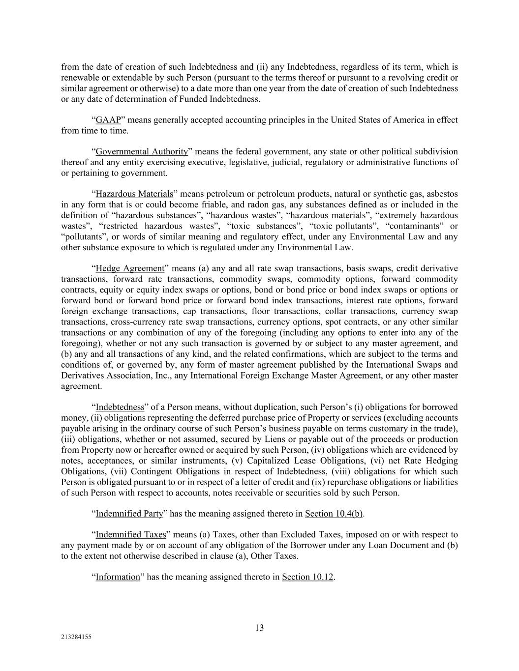 13 213284155 from the date of creation of such Indebtedness and (ii) any Indebtedness, regardless of its term, which is renewable or extendable by such Person (pursuant to the terms thereof or pursuant to a revolving credit or similar agreement or otherwise) to a date more than one year from the date of creation of such Indebtedness or any date of determination of Funded Indebtedness. “GAAP” means generally accepted accounting principles in the United States of America in effect from time to time. “Governmental Authority” means the federal government, any state or other political subdivision thereof and any entity exercising executive, legislative, judicial, regulatory or administrative functions of or pertaining to government. “Hazardous Materials” means petroleum or petroleum products, natural or synthetic gas, asbestos in any form that is or could become friable, and radon gas, any substances defined as or included in the definition of “hazardous substances”, “hazardous wastes”, “hazardous materials”, “extremely hazardous wastes”, “restricted hazardous wastes”, “toxic substances”, “toxic pollutants”, “contaminants” or “pollutants”, or words of similar meaning and regulatory effect, under any Environmental Law and any other substance exposure to which is regulated under any Environmental Law. “Hedge Agreement” means (a) any and all rate swap transactions, basis swaps, credit derivative transactions, forward rate transactions, commodity swaps, commodity options, forward commodity contracts, equity or equity index swaps or options, bond or bond price or bond index swaps or options or forward bond or forward bond price or forward bond index transactions, interest rate options, forward foreign exchange transactions, cap transactions, floor transactions, collar transactions, currency swap transactions, cross-currency rate swap transactions, currency options, spot contracts, or any other similar transactions or any combination of any of the foregoing (including any options to enter into any of the foregoing), whether or not any such transaction is governed by or subject to any master agreement, and (b) any and all transactions of any kind, and the related confirmations, which are subject to the terms and conditions of, or governed by, any form of master agreement published by the International Swaps and Derivatives Association, Inc., any International Foreign Exchange Master Agreement, or any other master agreement. “Indebtedness” of a Person means, without duplication, such Person’s (i) obligations for borrowed money, (ii) obligations representing the deferred purchase price of Property or services (excluding accounts payable arising in the ordinary course of such Person’s business payable on terms customary in the trade), (iii) obligations, whether or not assumed, secured by Liens or payable out of the proceeds or production from Property now or hereafter owned or acquired by such Person, (iv) obligations which are evidenced by notes, acceptances, or similar instruments, (v) Capitalized Lease Obligations, (vi) net Rate Hedging Obligations, (vii) Contingent Obligations in respect of Indebtedness, (viii) obligations for which such Person is obligated pursuant to or in respect of a letter of credit and (ix) repurchase obligations or liabilities of such Person with respect to accounts, notes receivable or securities sold by such Person. “Indemnified Party” has the meaning assigned thereto in Section 10.4(b). “Indemnified Taxes” means (a) Taxes, other than Excluded Taxes, imposed on or with respect to any payment made by or on account of any obligation of the Borrower under any Loan Document and (b) to the extent not otherwise described in clause (a), Other Taxes. “Information” has the meaning assigned thereto in Section 10.12.