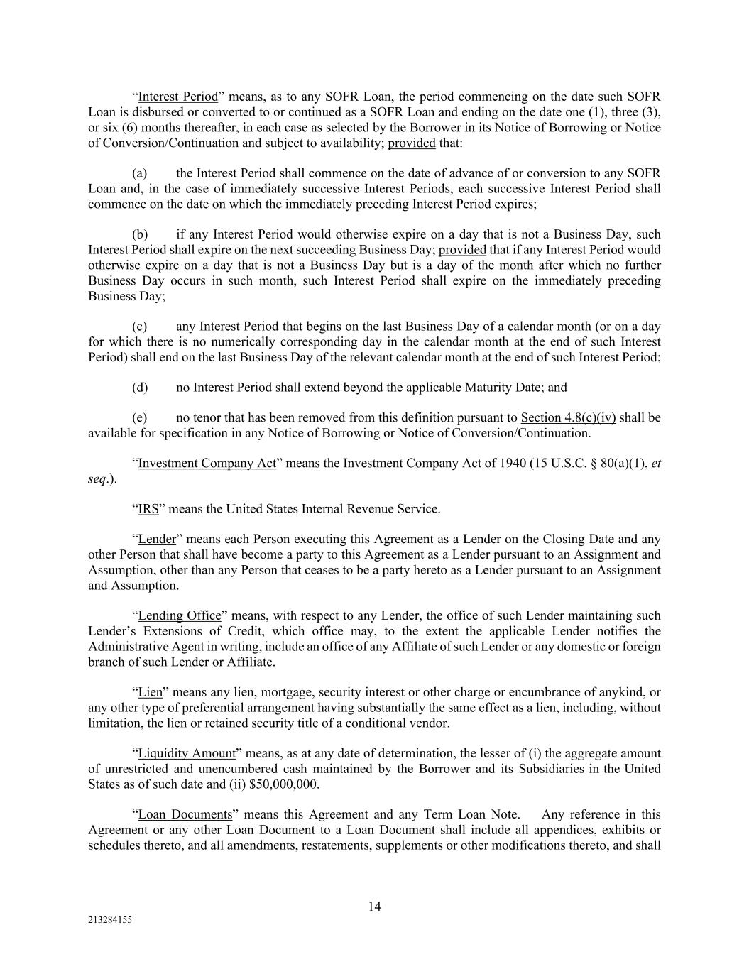 14 213284155 “Interest Period” means, as to any SOFR Loan, the period commencing on the date such SOFR Loan is disbursed or converted to or continued as a SOFR Loan and ending on the date one (1), three (3), or six (6) months thereafter, in each case as selected by the Borrower in its Notice of Borrowing or Notice of Conversion/Continuation and subject to availability; provided that: (a) the Interest Period shall commence on the date of advance of or conversion to any SOFR Loan and, in the case of immediately successive Interest Periods, each successive Interest Period shall commence on the date on which the immediately preceding Interest Period expires; (b) if any Interest Period would otherwise expire on a day that is not a Business Day, such Interest Period shall expire on the next succeeding Business Day; provided that if any Interest Period would otherwise expire on a day that is not a Business Day but is a day of the month after which no further Business Day occurs in such month, such Interest Period shall expire on the immediately preceding Business Day; (c) any Interest Period that begins on the last Business Day of a calendar month (or on a day for which there is no numerically corresponding day in the calendar month at the end of such Interest Period) shall end on the last Business Day of the relevant calendar month at the end of such Interest Period; (d) no Interest Period shall extend beyond the applicable Maturity Date; and (e) no tenor that has been removed from this definition pursuant to Section 4.8(c)(iv) shall be available for specification in any Notice of Borrowing or Notice of Conversion/Continuation. “Investment Company Act” means the Investment Company Act of 1940 (15 U.S.C. § 80(a)(1), et seq.). “IRS” means the United States Internal Revenue Service. “Lender” means each Person executing this Agreement as a Lender on the Closing Date and any other Person that shall have become a party to this Agreement as a Lender pursuant to an Assignment and Assumption, other than any Person that ceases to be a party hereto as a Lender pursuant to an Assignment and Assumption. “Lending Office” means, with respect to any Lender, the office of such Lender maintaining such Lender’s Extensions of Credit, which office may, to the extent the applicable Lender notifies the Administrative Agent in writing, include an office of any Affiliate of such Lender or any domestic or foreign branch of such Lender or Affiliate. “Lien” means any lien, mortgage, security interest or other charge or encumbrance of any kind, or any other type of preferential arrangement having substantially the same effect as a lien, including, without limitation, the lien or retained security title of a conditional vendor. “Liquidity Amount” means, as at any date of determination, the lesser of (i) the aggregate amount of unrestricted and unencumbered cash maintained by the Borrower and its Subsidiaries in the United States as of such date and (ii) $50,000,000. “Loan Documents” means this Agreement and any Term Loan Note. Any reference in this Agreement or any other Loan Document to a Loan Document shall include all appendices, exhibits or schedules thereto, and all amendments, restatements, supplements or other modifications thereto, and shall