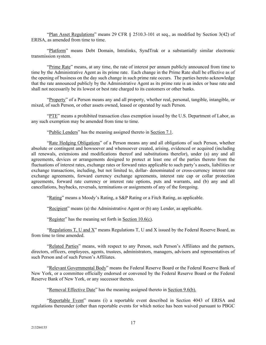 17 213284155 “Plan Asset Regulations” means 29 CFR § 2510.3-101 et seq., as modified by Section 3(42) of ERISA, as amended from time to time. “Platform” means Debt Domain, Intralinks, SyndTrak or a substantially similar electronic transmission system. “Prime Rate” means, at any time, the rate of interest per annum publicly announced from time to time by the Administrative Agent as its prime rate. Each change in the Prime Rate shall be effective as of the opening of business on the day such change in such prime rate occurs. The parties hereto acknowledge that the rate announced publicly by the Administrative Agent as its prime rate is an index or base rate and shall not necessarily be its lowest or best rate charged to its customers or other banks. “Property” of a Person means any and all property, whether real, personal, tangible, intangible, or mixed, of such Person, or other assets owned, leased or operated by such Person. “PTE” means a prohibited transaction class exemption issued by the U.S. Department of Labor, as any such exemption may be amended from time to time. “Public Lenders” has the meaning assigned thereto in Section 7.1. “Rate Hedging Obligations” of a Person means any and all obligations of such Person, whether absolute or contingent and howsoever and whensoever created, arising, evidenced or acquired (including all renewals, extensions and modifications thereof and substitutions therefor), under (a) any and all agreements, devices or arrangements designed to protect at least one of the parties thereto from the fluctuations of interest rates, exchange rates or forward rates applicable to such party’s assets, liabilities or exchange transactions, including, but not limited to, dollar- denominated or cross-currency interest rate exchange agreements, forward currency exchange agreements, interest rate cap or collar protection agreements, forward rate currency or interest rate options, puts and warrants, and (b) any and all cancellations, buybacks, reversals, terminations or assignments of any of the foregoing. “Rating” means a Moody’s Rating, a S&P Rating or a Fitch Rating, as applicable. “Recipient” means (a) the Administrative Agent or (b) any Lender, as applicable. “Register” has the meaning set forth in Section 10.6(c). “Regulations T, U and X” means Regulations T, U and X issued by the Federal Reserve Board, as from time to time amended. “Related Parties” means, with respect to any Person, such Person’s Affiliates and the partners, directors, officers, employees, agents, trustees, administrators, managers, advisors and representatives of such Person and of such Person’s Affiliates. “Relevant Governmental Body” means the Federal Reserve Board or the Federal Reserve Bank of New York, or a committee officially endorsed or convened by the Federal Reserve Board or the Federal Reserve Bank of New York, or any successor thereto. “Removal Effective Date” has the meaning assigned thereto in Section 9.6(b). “Reportable Event” means (i) a reportable event described in Section 4043 of ERISA and regulations thereunder (other than reportable events for which notice has been waived pursuant to PBGC