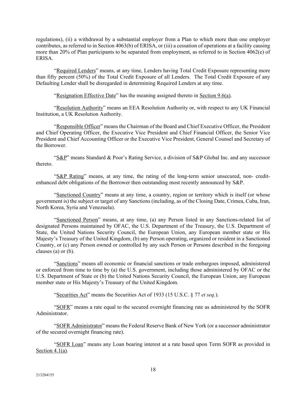 18 213284155 regulations), (ii) a withdrawal by a substantial employer from a Plan to which more than one employer contributes, as referred to in Section 4063(b) of ERISA, or (iii) a cessation of operations at a facility causing more than 20% of Plan participants to be separated from employment, as referred to in Section 4062(e) of ERISA. “Required Lenders” means, at any time, Lenders having Total Credit Exposure representing more than fifty percent (50%) of the Total Credit Exposure of all Lenders. The Total Credit Exposure of any Defaulting Lender shall be disregarded in determining Required Lenders at any time. “Resignation Effective Date” has the meaning assigned thereto in Section 9.6(a). “Resolution Authority” means an EEA Resolution Authority or, with respect to any UK Financial Institution, a UK Resolution Authority. “Responsible Officer” means the Chairman of the Board and Chief Executive Officer, the President and Chief Operating Officer, the Executive Vice President and Chief Financial Officer, the Senior Vice President and Chief Accounting Officer or the Executive Vice President, General Counsel and Secretary of the Borrower. “S&P” means Standard & Poor’s Rating Service, a division of S&P Global Inc. and any successor thereto. “S&P Rating” means, at any time, the rating of the long-term senior unsecured, non- credit- enhanced debt obligations of the Borrower then outstanding most recently announced by S&P. “Sanctioned Country” means at any time, a country, region or territory which is itself (or whose government is) the subject or target of any Sanctions (including, as of the Closing Date, Crimea, Cuba, Iran, North Korea, Syria and Venezuela). “Sanctioned Person” means, at any time, (a) any Person listed in any Sanctions-related list of designated Persons maintained by OFAC, the U.S. Department of the Treasury, the U.S. Department of State, the United Nations Security Council, the European Union, any European member state or His Majesty’s Treasury of the United Kingdom, (b) any Person operating, organized or resident in a Sanctioned Country, or (c) any Person owned or controlled by any such Person or Persons described in the foregoing clauses (a) or (b). “Sanctions” means all economic or financial sanctions or trade embargoes imposed, administered or enforced from time to time by (a) the U.S. government, including those administered by OFAC or the U.S. Department of State or (b) the United Nations Security Council, the European Union, any European member state or His Majesty’s Treasury of the United Kingdom. “Securities Act” means the Securities Act of 1933 (15 U.S.C. § 77 et seq.). “SOFR” means a rate equal to the secured overnight financing rate as administered by the SOFR Administrator. “SOFR Administrator” means the Federal Reserve Bank of New York (or a successor administrator of the secured overnight financing rate). “SOFR Loan” means any Loan bearing interest at a rate based upon Term SOFR as provided in Section 4.1(a).