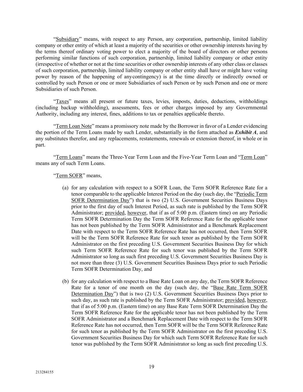 19 213284155 “Subsidiary” means, with respect to any Person, any corporation, partnership, limited liability company or other entity of which at least a majority of the securities or other ownership interests having by the terms thereof ordinary voting power to elect a majority of the board of directors or other persons performing similar functions of such corporation, partnership, limited liability company or other entity (irrespective of whether or not at the time securities or other ownership interests of any other class or classes of such corporation, partnership, limited liability company or other entity shall have or might have voting power by reason of the happening of any contingency) is at the time directly or indirectly owned or controlled by such Person or one or more Subsidiaries of such Person or by such Person and one or more Subsidiaries of such Person. “Taxes” means all present or future taxes, levies, imposts, duties, deductions, withholdings (including backup withholding), assessments, fees or other charges imposed by any Governmental Authority, including any interest, fines, additions to tax or penalties applicable thereto. “Term Loan Note” means a promissory note made by the Borrower in favor of a Lender evidencing the portion of the Term Loans made by such Lender, substantially in the form attached as Exhibit A, and any substitutes therefor, and any replacements, restatements, renewals or extension thereof, in whole or in part. “Term Loans” means the Three-Year Term Loan and the Five-Year Term Loan and “Term Loan” means any of such Term Loans. “Term SOFR” means, (a) for any calculation with respect to a SOFR Loan, the Term SOFR Reference Rate for a tenor comparable to the applicable Interest Period on the day (such day, the “Periodic Term SOFR Determination Day”) that is two (2) U.S. Government Securities Business Days prior to the first day of such Interest Period, as such rate is published by the Term SOFR Administrator; provided, however, that if as of 5:00 p.m. (Eastern time) on any Periodic Term SOFR Determination Day the Term SOFR Reference Rate for the applicable tenor has not been published by the Term SOFR Administrator and a Benchmark Replacement Date with respect to the Term SOFR Reference Rate has not occurred, then Term SOFR will be the Term SOFR Reference Rate for such tenor as published by the Term SOFR Administrator on the first preceding U.S. Government Securities Business Day for which such Term SOFR Reference Rate for such tenor was published by the Term SOFR Administrator so long as such first preceding U.S. Government Securities Business Day is not more than three (3) U.S. Government Securities Business Days prior to such Periodic Term SOFR Determination Day, and (b) for any calculation with respect to a Base Rate Loan on any day, the Term SOFR Reference Rate for a tenor of one month on the day (such day, the “Base Rate Term SOFR Determination Day”) that is two (2) U.S. Government Securities Business Days prior to such day, as such rate is published by the Term SOFR Administrator; provided, however, that if as of 5:00 p.m. (Eastern time) on any Base Rate Term SOFR Determination Day the Term SOFR Reference Rate for the applicable tenor has not been published by the Term SOFR Administrator and a Benchmark Replacement Date with respect to the Term SOFR Reference Rate has not occurred, then Term SOFR will be the Term SOFR Reference Rate for such tenor as published by the Term SOFR Administrator on the first preceding U.S. Government Securities Business Day for which such Term SOFR Reference Rate for such tenor was published by the Term SOFR Administrator so long as such first preceding U.S.
