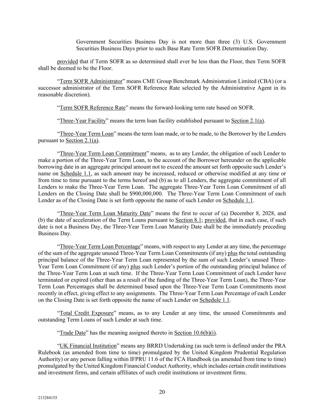 20 213284155 Government Securities Business Day is not more than three (3) U.S. Government Securities Business Days prior to such Base Rate Term SOFR Determination Day. provided that if Term SOFR as so determined shall ever be less than the Floor, then Term SOFR shall be deemed to be the Floor. “Term SOFR Administrator” means CME Group Benchmark Administration Limited (CBA) (or a successor administrator of the Term SOFR Reference Rate selected by the Administrative Agent in its reasonable discretion). “Term SOFR Reference Rate” means the forward-looking term rate based on SOFR. “Three-Year Facility” means the term loan facility established pursuant to Section 2.1(a). “Three-Year Term Loan” means the term loan made, or to be made, to the Borrower by the Lenders pursuant to Section 2.1(a). “Three-Year Term Loan Commitment” means, as to any Lender, the obligation of such Lender to make a portion of the Three-Year Term Loan, to the account of the Borrower hereunder on the applicable borrowing date in an aggregate principal amount not to exceed the amount set forth opposite such Lender’s name on Schedule 1.1, as such amount may be increased, reduced or otherwise modified at any time or from time to time pursuant to the terms hereof and (b) as to all Lenders, the aggregate commitment of all Lenders to make the Three-Year Term Loan. The aggregate Three-Year Term Loan Commitment of all Lenders on the Closing Date shall be $900,000,000. The Three-Year Term Loan Commitment of each Lender as of the Closing Date is set forth opposite the name of such Lender on Schedule 1.1. “Three-Year Term Loan Maturity Date” means the first to occur of (a) December 8, 2028, and (b) the date of acceleration of the Term Loans pursuant to Section 8.1; provided, that in each case, if such date is not a Business Day, the Three-Year Term Loan Maturity Date shall be the immediately preceding Business Day. “Three-Year Term Loan Percentage” means, with respect to any Lender at any time, the percentage of the sum of the aggregate unused Three-Year Term Loan Commitments (if any) plus the total outstanding principal balance of the Three-Year Term Loan represented by the sum of such Lender’s unused Three- Year Term Loan Commitment (if any) plus such Lender’s portion of the outstanding principal balance of the Three-Year Term Loan at such time. If the Three-Year Term Loan Commitment of each Lender have terminated or expired (other than as a result of the funding of the Three-Year Term Loan), the Three-Year Term Loan Percentages shall be determined based upon the Three-Year Term Loan Commitments most recently in effect, giving effect to any assignments. The Three-Year Term Loan Percentage of each Lender on the Closing Date is set forth opposite the name of such Lender on Schedule 1.1. “Total Credit Exposure” means, as to any Lender at any time, the unused Commitments and outstanding Term Loans of such Lender at such time. “Trade Date” has the meaning assigned thereto in Section 10.6(b)(i). “UK Financial Institution” means any BRRD Undertaking (as such term is defined under the PRA Rulebook (as amended from time to time) promulgated by the United Kingdom Prudential Regulation Authority) or any person falling within IFPRU 11.6 of the FCA Handbook (as amended from time to time) promulgated by the United Kingdom Financial Conduct Authority, which includes certain credit institutions and investment firms, and certain affiliates of such credit institutions or investment firms.