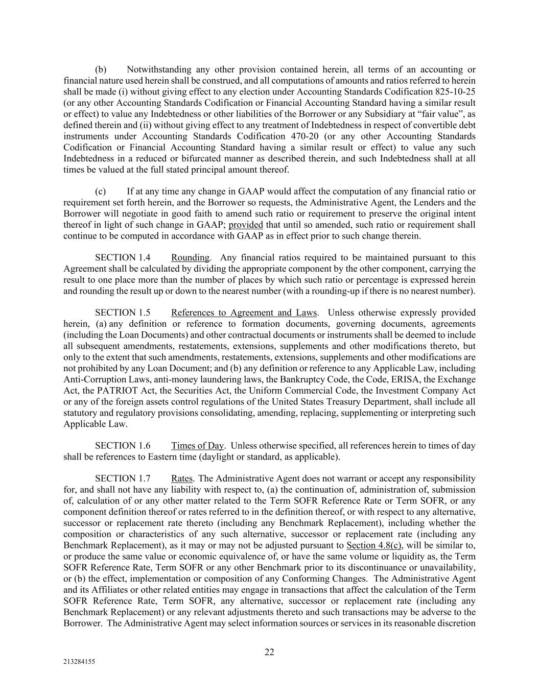 22 213284155 (b) Notwithstanding any other provision contained herein, all terms of an accounting or financial nature used herein shall be construed, and all computations of amounts and ratios referred to herein shall be made (i) without giving effect to any election under Accounting Standards Codification 825-10-25 (or any other Accounting Standards Codification or Financial Accounting Standard having a similar result or effect) to value any Indebtedness or other liabilities of the Borrower or any Subsidiary at “fair value”, as defined therein and (ii) without giving effect to any treatment of Indebtedness in respect of convertible debt instruments under Accounting Standards Codification 470-20 (or any other Accounting Standards Codification or Financial Accounting Standard having a similar result or effect) to value any such Indebtedness in a reduced or bifurcated manner as described therein, and such Indebtedness shall at all times be valued at the full stated principal amount thereof. (c) If at any time any change in GAAP would affect the computation of any financial ratio or requirement set forth herein, and the Borrower so requests, the Administrative Agent, the Lenders and the Borrower will negotiate in good faith to amend such ratio or requirement to preserve the original intent thereof in light of such change in GAAP; provided that until so amended, such ratio or requirement shall continue to be computed in accordance with GAAP as in effect prior to such change therein. SECTION 1.4 Rounding. Any financial ratios required to be maintained pursuant to this Agreement shall be calculated by dividing the appropriate component by the other component, carrying the result to one place more than the number of places by which such ratio or percentage is expressed herein and rounding the result up or down to the nearest number (with a rounding-up if there is no nearest number). SECTION 1.5 References to Agreement and Laws. Unless otherwise expressly provided herein, (a) any definition or reference to formation documents, governing documents, agreements (including the Loan Documents) and other contractual documents or instruments shall be deemed to include all subsequent amendments, restatements, extensions, supplements and other modifications thereto, but only to the extent that such amendments, restatements, extensions, supplements and other modifications are not prohibited by any Loan Document; and (b) any definition or reference to any Applicable Law, including Anti-Corruption Laws, anti-money laundering laws, the Bankruptcy Code, the Code, ERISA, the Exchange Act, the PATRIOT Act, the Securities Act, the Uniform Commercial Code, the Investment Company Act or any of the foreign assets control regulations of the United States Treasury Department, shall include all statutory and regulatory provisions consolidating, amending, replacing, supplementing or interpreting such Applicable Law. SECTION 1.6 Times of Day. Unless otherwise specified, all references herein to times of day shall be references to Eastern time (daylight or standard, as applicable). SECTION 1.7 Rates. The Administrative Agent does not warrant or accept any responsibility for, and shall not have any liability with respect to, (a) the continuation of, administration of, submission of, calculation of or any other matter related to the Term SOFR Reference Rate or Term SOFR, or any component definition thereof or rates referred to in the definition thereof, or with respect to any alternative, successor or replacement rate thereto (including any Benchmark Replacement), including whether the composition or characteristics of any such alternative, successor or replacement rate (including any Benchmark Replacement), as it may or may not be adjusted pursuant to Section 4.8(c), will be similar to, or produce the same value or economic equivalence of, or have the same volume or liquidity as, the Term SOFR Reference Rate, Term SOFR or any other Benchmark prior to its discontinuance or unavailability, or (b) the effect, implementation or composition of any Conforming Changes. The Administrative Agent and its Affiliates or other related entities may engage in transactions that affect the calculation of the Term SOFR Reference Rate, Term SOFR, any alternative, successor or replacement rate (including any Benchmark Replacement) or any relevant adjustments thereto and such transactions may be adverse to the Borrower. The Administrative Agent may select information sources or services in its reasonable discretion