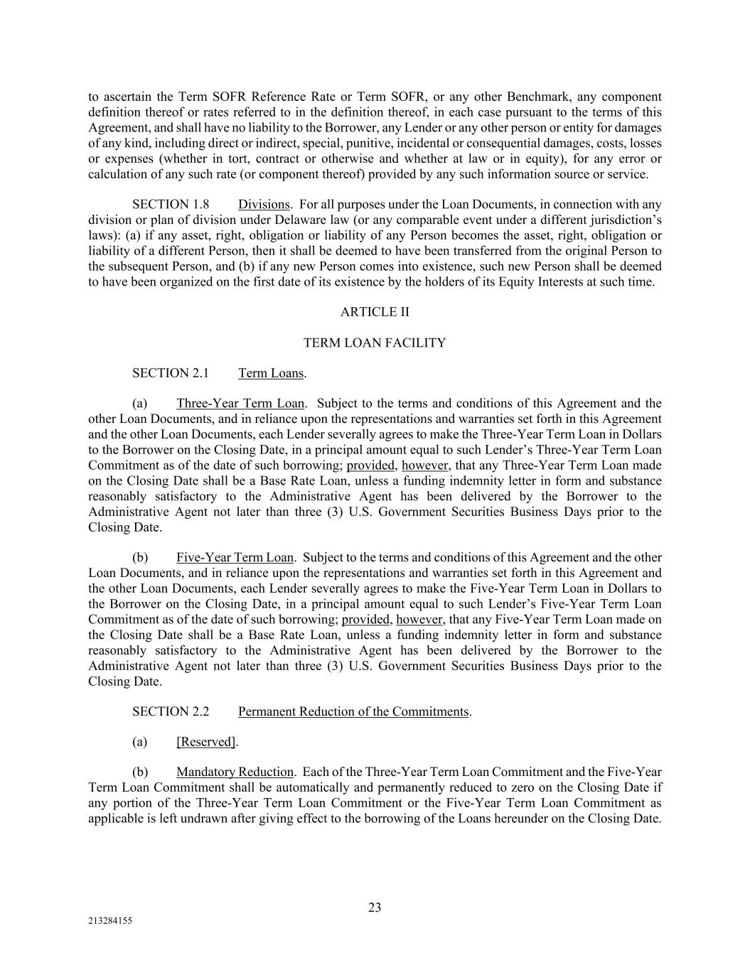 23 213284155 to ascertain the Term SOFR Reference Rate or Term SOFR, or any other Benchmark, any component definition thereof or rates referred to in the definition thereof, in each case pursuant to the terms of this Agreement, and shall have no liability to the Borrower, any Lender or any other person or entity for damages of any kind, including direct or indirect, special, punitive, incidental or consequential damages, costs, losses or expenses (whether in tort, contract or otherwise and whether at law or in equity), for any error or calculation of any such rate (or component thereof) provided by any such information source or service. SECTION 1.8 Divisions. For all purposes under the Loan Documents, in connection with any division or plan of division under Delaware law (or any comparable event under a different jurisdiction’s laws): (a) if any asset, right, obligation or liability of any Person becomes the asset, right, obligation or liability of a different Person, then it shall be deemed to have been transferred from the original Person to the subsequent Person, and (b) if any new Person comes into existence, such new Person shall be deemed to have been organized on the first date of its existence by the holders of its Equity Interests at such time. ARTICLE II TERM LOAN FACILITY SECTION 2.1 Term Loans. (a) Three-Year Term Loan. Subject to the terms and conditions of this Agreement and the other Loan Documents, and in reliance upon the representations and warranties set forth in this Agreement and the other Loan Documents, each Lender severally agrees to make the Three-Year Term Loan in Dollars to the Borrower on the Closing Date, in a principal amount equal to such Lender’s Three-Year Term Loan Commitment as of the date of such borrowing; provided, however, that any Three-Year Term Loan made on the Closing Date shall be a Base Rate Loan, unless a funding indemnity letter in form and substance reasonably satisfactory to the Administrative Agent has been delivered by the Borrower to the Administrative Agent not later than three (3) U.S. Government Securities Business Days prior to the Closing Date. (b) Five-Year Term Loan. Subject to the terms and conditions of this Agreement and the other Loan Documents, and in reliance upon the representations and warranties set forth in this Agreement and the other Loan Documents, each Lender severally agrees to make the Five-Year Term Loan in Dollars to the Borrower on the Closing Date, in a principal amount equal to such Lender’s Five-Year Term Loan Commitment as of the date of such borrowing; provided, however, that any Five-Year Term Loan made on the Closing Date shall be a Base Rate Loan, unless a funding indemnity letter in form and substance reasonably satisfactory to the Administrative Agent has been delivered by the Borrower to the Administrative Agent not later than three (3) U.S. Government Securities Business Days prior to the Closing Date. SECTION 2.2 Permanent Reduction of the Commitments. (a) [Reserved]. (b) Mandatory Reduction. Each of the Three-Year Term Loan Commitment and the Five-Year Term Loan Commitment shall be automatically and permanently reduced to zero on the Closing Date if any portion of the Three-Year Term Loan Commitment or the Five-Year Term Loan Commitment as applicable is left undrawn after giving effect to the borrowing of the Loans hereunder on the Closing Date.