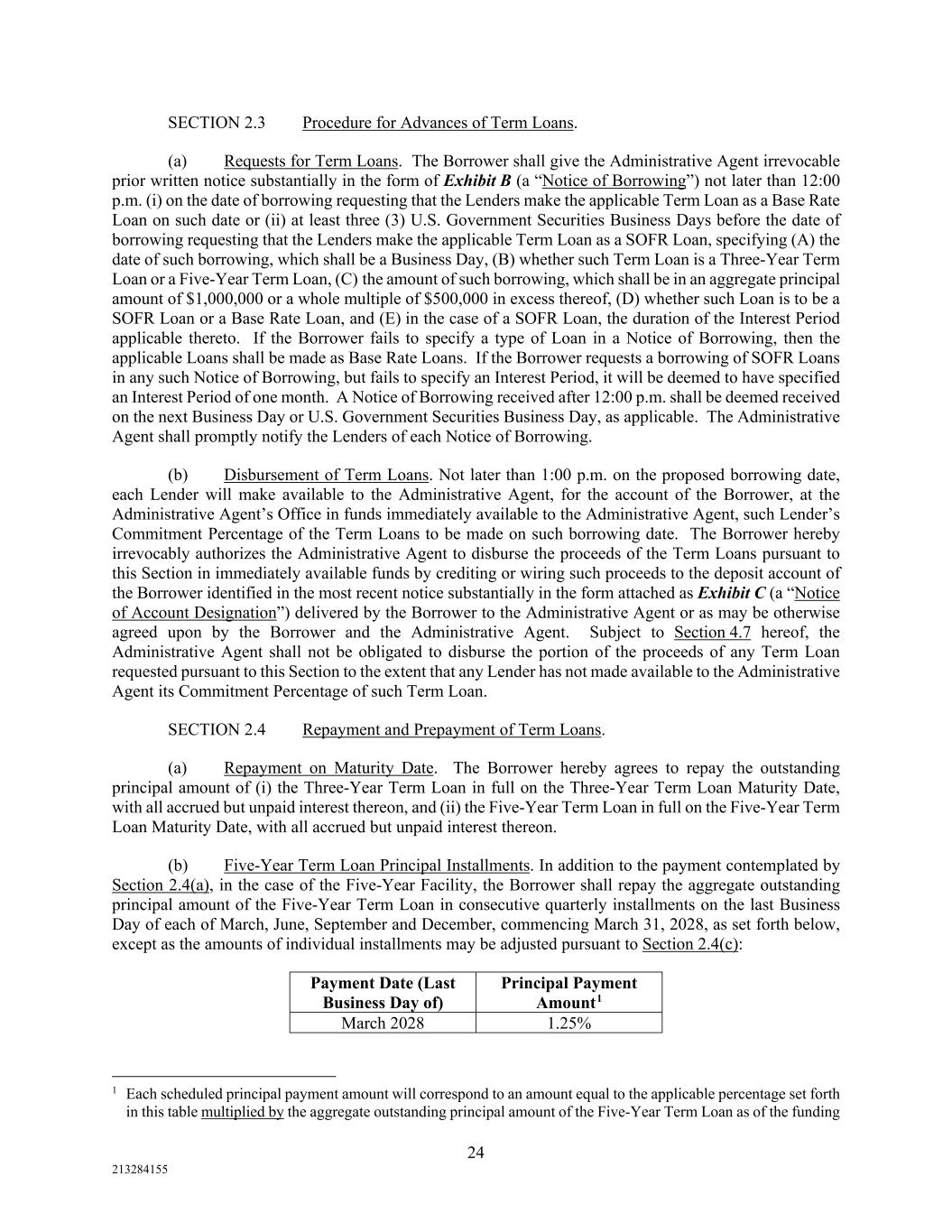 24 213284155 SECTION 2.3 Procedure for Advances of Term Loans. (a) Requests for Term Loans. The Borrower shall give the Administrative Agent irrevocable prior written notice substantially in the form of Exhibit B (a “Notice of Borrowing”) not later than 12:00 p.m. (i) on the date of borrowing requesting that the Lenders make the applicable Term Loan as a Base Rate Loan on such date or (ii) at least three (3) U.S. Government Securities Business Days before the date of borrowing requesting that the Lenders make the applicable Term Loan as a SOFR Loan, specifying (A) the date of such borrowing, which shall be a Business Day, (B) whether such Term Loan is a Three-Year Term Loan or a Five-Year Term Loan, (C) the amount of such borrowing, which shall be in an aggregate principal amount of $1,000,000 or a whole multiple of $500,000 in excess thereof, (D) whether such Loan is to be a SOFR Loan or a Base Rate Loan, and (E) in the case of a SOFR Loan, the duration of the Interest Period applicable thereto. If the Borrower fails to specify a type of Loan in a Notice of Borrowing, then the applicable Loans shall be made as Base Rate Loans. If the Borrower requests a borrowing of SOFR Loans in any such Notice of Borrowing, but fails to specify an Interest Period, it will be deemed to have specified an Interest Period of one month. A Notice of Borrowing received after 12:00 p.m. shall be deemed received on the next Business Day or U.S. Government Securities Business Day, as applicable. The Administrative Agent shall promptly notify the Lenders of each Notice of Borrowing. (b) Disbursement of Term Loans. Not later than 1:00 p.m. on the proposed borrowing date, each Lender will make available to the Administrative Agent, for the account of the Borrower, at the Administrative Agent’s Office in funds immediately available to the Administrative Agent, such Lender’s Commitment Percentage of the Term Loans to be made on such borrowing date. The Borrower hereby irrevocably authorizes the Administrative Agent to disburse the proceeds of the Term Loans pursuant to this Section in immediately available funds by crediting or wiring such proceeds to the deposit account of the Borrower identified in the most recent notice substantially in the form attached as Exhibit C (a “Notice of Account Designation”) delivered by the Borrower to the Administrative Agent or as may be otherwise agreed upon by the Borrower and the Administrative Agent. Subject to Section 4.7 hereof, the Administrative Agent shall not be obligated to disburse the portion of the proceeds of any Term Loan requested pursuant to this Section to the extent that any Lender has not made available to the Administrative Agent its Commitment Percentage of such Term Loan. SECTION 2.4 Repayment and Prepayment of Term Loans. (a) Repayment on Maturity Date. The Borrower hereby agrees to repay the outstanding principal amount of (i) the Three-Year Term Loan in full on the Three-Year Term Loan Maturity Date, with all accrued but unpaid interest thereon, and (ii) the Five-Year Term Loan in full on the Five-Year Term Loan Maturity Date, with all accrued but unpaid interest thereon. (b) Five-Year Term Loan Principal Installments. In addition to the payment contemplated by Section 2.4(a), in the case of the Five-Year Facility, the Borrower shall repay the aggregate outstanding principal amount of the Five-Year Term Loan in consecutive quarterly installments on the last Business Day of each of March, June, September and December, commencing March 31, 2028, as set forth below, except as the amounts of individual installments may be adjusted pursuant to Section 2.4(c): Payment Date (Last Business Day of) Principal Payment Amount1 March 2028 1.25% 1 Each scheduled principal payment amount will correspond to an amount equal to the applicable percentage set forth in this table multiplied by the aggregate outstanding principal amount of the Five-Year Term Loan as of the funding