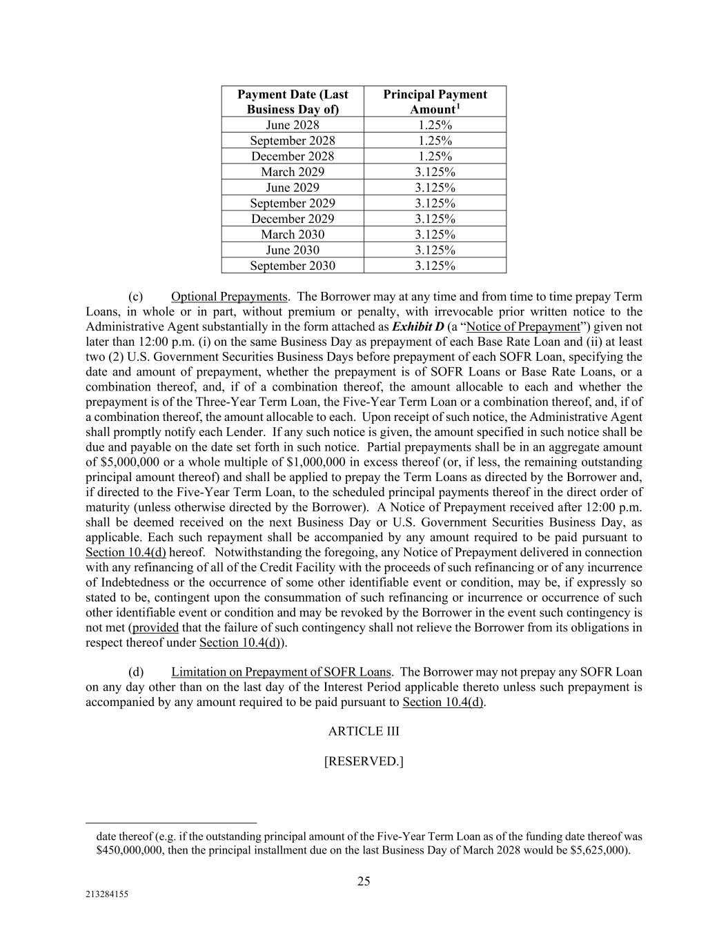25 213284155 Payment Date (Last Business Day of) Principal Payment Amount1 June 2028 1.25% September 2028 1.25% December 2028 1.25% March 2029 3.125% June 2029 3.125% September 2029 3.125% December 2029 3.125% March 2030 3.125% June 2030 3.125% September 2030 3.125% (c) Optional Prepayments. The Borrower may at any time and from time to time prepay Term Loans, in whole or in part, without premium or penalty, with irrevocable prior written notice to the Administrative Agent substantially in the form attached as Exhibit D (a “Notice of Prepayment”) given not later than 12:00 p.m. (i) on the same Business Day as prepayment of each Base Rate Loan and (ii) at least two (2) U.S. Government Securities Business Days before prepayment of each SOFR Loan, specifying the date and amount of prepayment, whether the prepayment is of SOFR Loans or Base Rate Loans, or a combination thereof, and, if of a combination thereof, the amount allocable to each and whether the prepayment is of the Three-Year Term Loan, the Five-Year Term Loan or a combination thereof, and, if of a combination thereof, the amount allocable to each. Upon receipt of such notice, the Administrative Agent shall promptly notify each Lender. If any such notice is given, the amount specified in such notice shall be due and payable on the date set forth in such notice. Partial prepayments shall be in an aggregate amount of $5,000,000 or a whole multiple of $1,000,000 in excess thereof (or, if less, the remaining outstanding principal amount thereof) and shall be applied to prepay the Term Loans as directed by the Borrower and, if directed to the Five-Year Term Loan, to the scheduled principal payments thereof in the direct order of maturity (unless otherwise directed by the Borrower). A Notice of Prepayment received after 12:00 p.m. shall be deemed received on the next Business Day or U.S. Government Securities Business Day, as applicable. Each such repayment shall be accompanied by any amount required to be paid pursuant to Section 10.4(d) hereof. Notwithstanding the foregoing, any Notice of Prepayment delivered in connection with any refinancing of all of the Credit Facility with the proceeds of such refinancing or of any incurrence of Indebtedness or the occurrence of some other identifiable event or condition, may be, if expressly so stated to be, contingent upon the consummation of such refinancing or incurrence or occurrence of such other identifiable event or condition and may be revoked by the Borrower in the event such contingency is not met (provided that the failure of such contingency shall not relieve the Borrower from its obligations in respect thereof under Section 10.4(d)). (d) Limitation on Prepayment of SOFR Loans. The Borrower may not prepay any SOFR Loan on any day other than on the last day of the Interest Period applicable thereto unless such prepayment is accompanied by any amount required to be paid pursuant to Section 10.4(d). ARTICLE III [RESERVED.] date thereof (e.g. if the outstanding principal amount of the Five-Year Term Loan as of the funding date thereof was $450,000,000, then the principal installment due on the last Business Day of March 2028 would be $5,625,000).