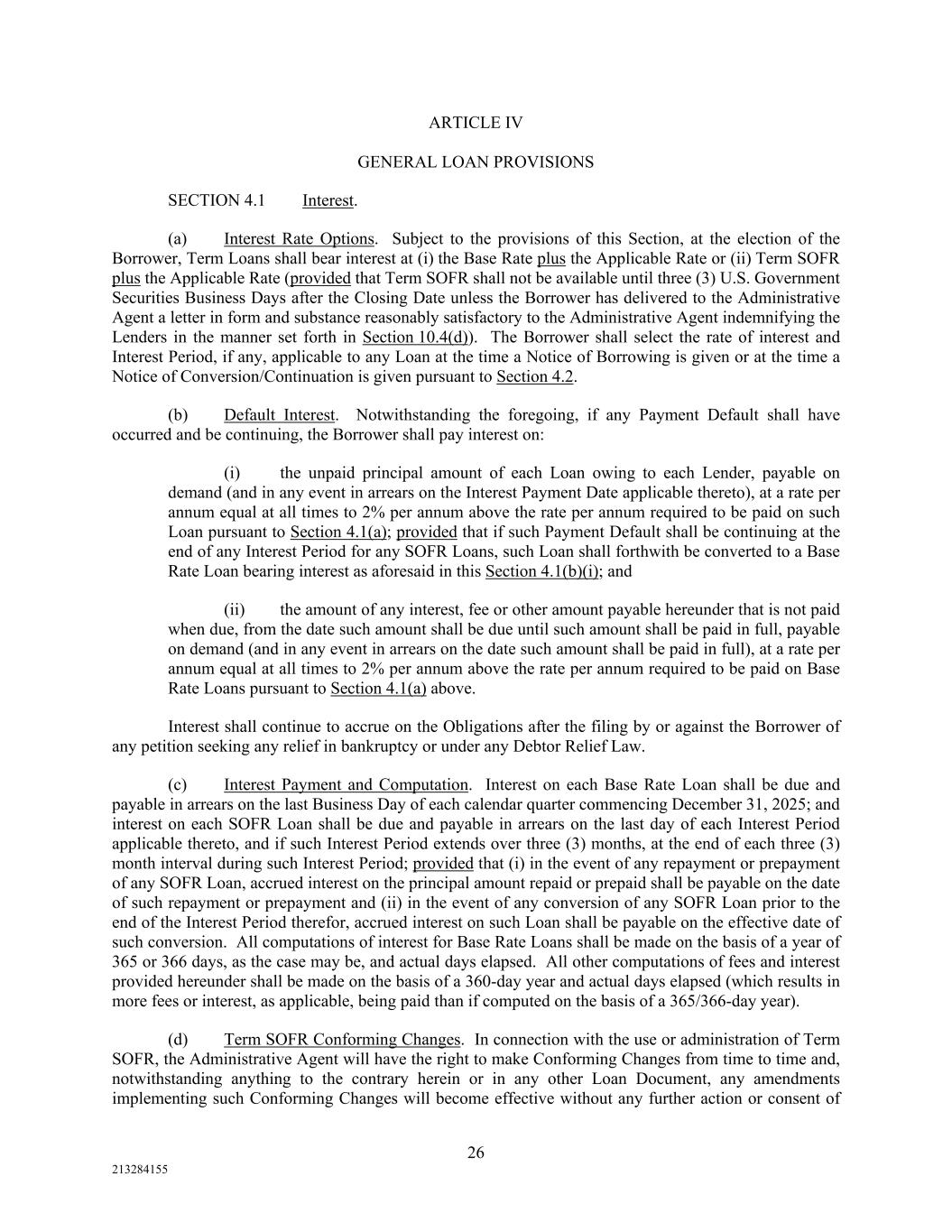 26 213284155 ARTICLE IV GENERAL LOAN PROVISIONS SECTION 4.1 Interest. (a) Interest Rate Options. Subject to the provisions of this Section, at the election of the Borrower, Term Loans shall bear interest at (i) the Base Rate plus the Applicable Rate or (ii) Term SOFR plus the Applicable Rate (provided that Term SOFR shall not be available until three (3) U.S. Government Securities Business Days after the Closing Date unless the Borrower has delivered to the Administrative Agent a letter in form and substance reasonably satisfactory to the Administrative Agent indemnifying the Lenders in the manner set forth in Section 10.4(d)). The Borrower shall select the rate of interest and Interest Period, if any, applicable to any Loan at the time a Notice of Borrowing is given or at the time a Notice of Conversion/Continuation is given pursuant to Section 4.2. (b) Default Interest. Notwithstanding the foregoing, if any Payment Default shall have occurred and be continuing, the Borrower shall pay interest on: (i) the unpaid principal amount of each Loan owing to each Lender, payable on demand (and in any event in arrears on the Interest Payment Date applicable thereto), at a rate per annum equal at all times to 2% per annum above the rate per annum required to be paid on such Loan pursuant to Section 4.1(a); provided that if such Payment Default shall be continuing at the end of any Interest Period for any SOFR Loans, such Loan shall forthwith be converted to a Base Rate Loan bearing interest as aforesaid in this Section 4.1(b)(i); and (ii) the amount of any interest, fee or other amount payable hereunder that is not paid when due, from the date such amount shall be due until such amount shall be paid in full, payable on demand (and in any event in arrears on the date such amount shall be paid in full), at a rate per annum equal at all times to 2% per annum above the rate per annum required to be paid on Base Rate Loans pursuant to Section 4.1(a) above. Interest shall continue to accrue on the Obligations after the filing by or against the Borrower of any petition seeking any relief in bankruptcy or under any Debtor Relief Law. (c) Interest Payment and Computation. Interest on each Base Rate Loan shall be due and payable in arrears on the last Business Day of each calendar quarter commencing December 31, 2025; and interest on each SOFR Loan shall be due and payable in arrears on the last day of each Interest Period applicable thereto, and if such Interest Period extends over three (3) months, at the end of each three (3) month interval during such Interest Period; provided that (i) in the event of any repayment or prepayment of any SOFR Loan, accrued interest on the principal amount repaid or prepaid shall be payable on the date of such repayment or prepayment and (ii) in the event of any conversion of any SOFR Loan prior to the end of the Interest Period therefor, accrued interest on such Loan shall be payable on the effective date of such conversion. All computations of interest for Base Rate Loans shall be made on the basis of a year of 365 or 366 days, as the case may be, and actual days elapsed. All other computations of fees and interest provided hereunder shall be made on the basis of a 360-day year and actual days elapsed (which results in more fees or interest, as applicable, being paid than if computed on the basis of a 365/366-day year). (d) Term SOFR Conforming Changes. In connection with the use or administration of Term SOFR, the Administrative Agent will have the right to make Conforming Changes from time to time and, notwithstanding anything to the contrary herein or in any other Loan Document, any amendments implementing such Conforming Changes will become effective without any further action or consent of