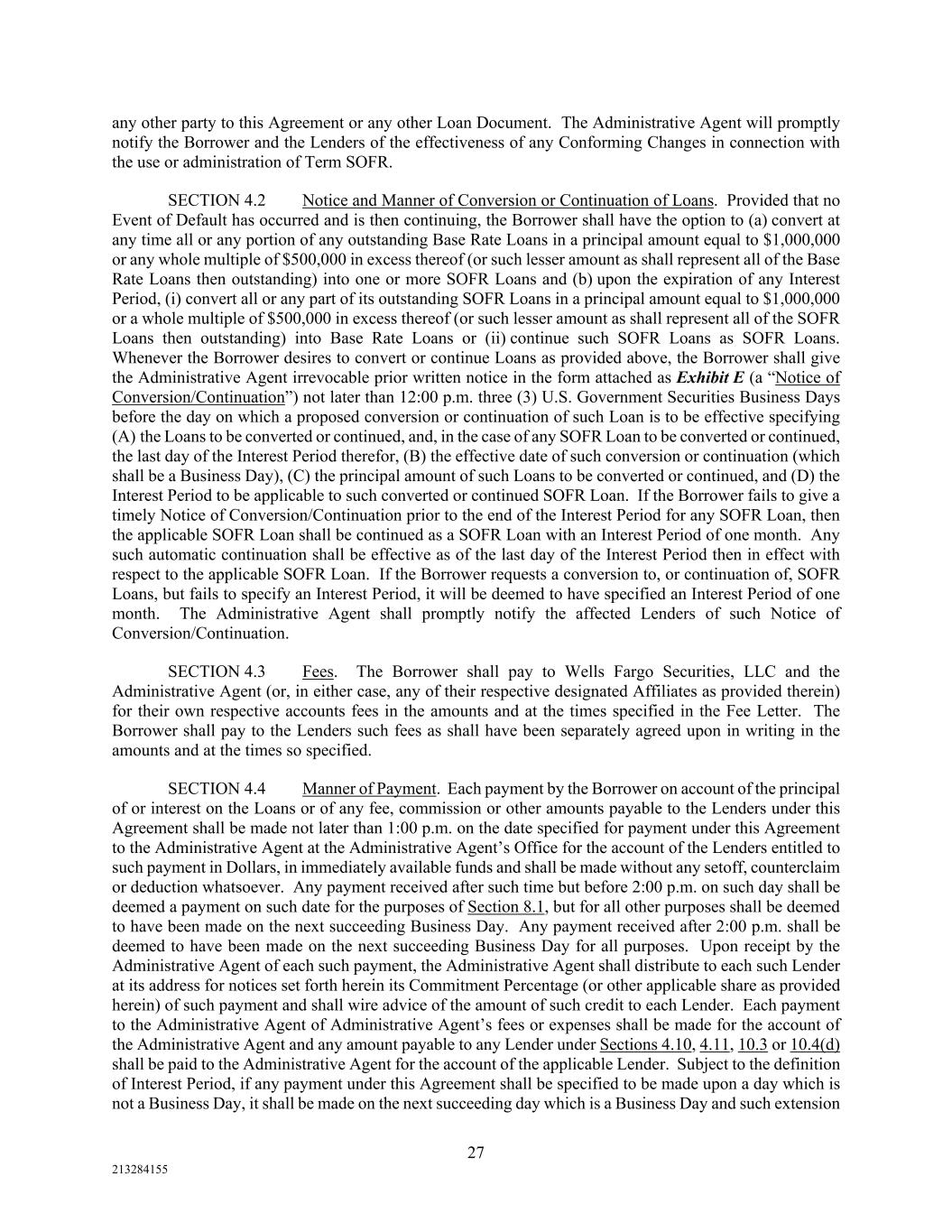 27 213284155 any other party to this Agreement or any other Loan Document. The Administrative Agent will promptly notify the Borrower and the Lenders of the effectiveness of any Conforming Changes in connection with the use or administration of Term SOFR. SECTION 4.2 Notice and Manner of Conversion or Continuation of Loans. Provided that no Event of Default has occurred and is then continuing, the Borrower shall have the option to (a) convert at any time all or any portion of any outstanding Base Rate Loans in a principal amount equal to $1,000,000 or any whole multiple of $500,000 in excess thereof (or such lesser amount as shall represent all of the Base Rate Loans then outstanding) into one or more SOFR Loans and (b) upon the expiration of any Interest Period, (i) convert all or any part of its outstanding SOFR Loans in a principal amount equal to $1,000,000 or a whole multiple of $500,000 in excess thereof (or such lesser amount as shall represent all of the SOFR Loans then outstanding) into Base Rate Loans or (ii) continue such SOFR Loans as SOFR Loans. Whenever the Borrower desires to convert or continue Loans as provided above, the Borrower shall give the Administrative Agent irrevocable prior written notice in the form attached as Exhibit E (a “Notice of Conversion/Continuation”) not later than 12:00 p.m. three (3) U.S. Government Securities Business Days before the day on which a proposed conversion or continuation of such Loan is to be effective specifying (A) the Loans to be converted or continued, and, in the case of any SOFR Loan to be converted or continued, the last day of the Interest Period therefor, (B) the effective date of such conversion or continuation (which shall be a Business Day), (C) the principal amount of such Loans to be converted or continued, and (D) the Interest Period to be applicable to such converted or continued SOFR Loan. If the Borrower fails to give a timely Notice of Conversion/Continuation prior to the end of the Interest Period for any SOFR Loan, then the applicable SOFR Loan shall be continued as a SOFR Loan with an Interest Period of one month. Any such automatic continuation shall be effective as of the last day of the Interest Period then in effect with respect to the applicable SOFR Loan. If the Borrower requests a conversion to, or continuation of, SOFR Loans, but fails to specify an Interest Period, it will be deemed to have specified an Interest Period of one month. The Administrative Agent shall promptly notify the affected Lenders of such Notice of Conversion/Continuation. SECTION 4.3 Fees. The Borrower shall pay to Wells Fargo Securities, LLC and the Administrative Agent (or, in either case, any of their respective designated Affiliates as provided therein) for their own respective accounts fees in the amounts and at the times specified in the Fee Letter. The Borrower shall pay to the Lenders such fees as shall have been separately agreed upon in writing in the amounts and at the times so specified. SECTION 4.4 Manner of Payment. Each payment by the Borrower on account of the principal of or interest on the Loans or of any fee, commission or other amounts payable to the Lenders under this Agreement shall be made not later than 1:00 p.m. on the date specified for payment under this Agreement to the Administrative Agent at the Administrative Agent’s Office for the account of the Lenders entitled to such payment in Dollars, in immediately available funds and shall be made without any setoff, counterclaim or deduction whatsoever. Any payment received after such time but before 2:00 p.m. on such day shall be deemed a payment on such date for the purposes of Section 8.1, but for all other purposes shall be deemed to have been made on the next succeeding Business Day. Any payment received after 2:00 p.m. shall be deemed to have been made on the next succeeding Business Day for all purposes. Upon receipt by the Administrative Agent of each such payment, the Administrative Agent shall distribute to each such Lender at its address for notices set forth herein its Commitment Percentage (or other applicable share as provided herein) of such payment and shall wire advice of the amount of such credit to each Lender. Each payment to the Administrative Agent of Administrative Agent’s fees or expenses shall be made for the account of the Administrative Agent and any amount payable to any Lender under Sections 4.10, 4.11, 10.3 or 10.4(d) shall be paid to the Administrative Agent for the account of the applicable Lender. Subject to the definition of Interest Period, if any payment under this Agreement shall be specified to be made upon a day which is not a Business Day, it shall be made on the next succeeding day which is a Business Day and such extension