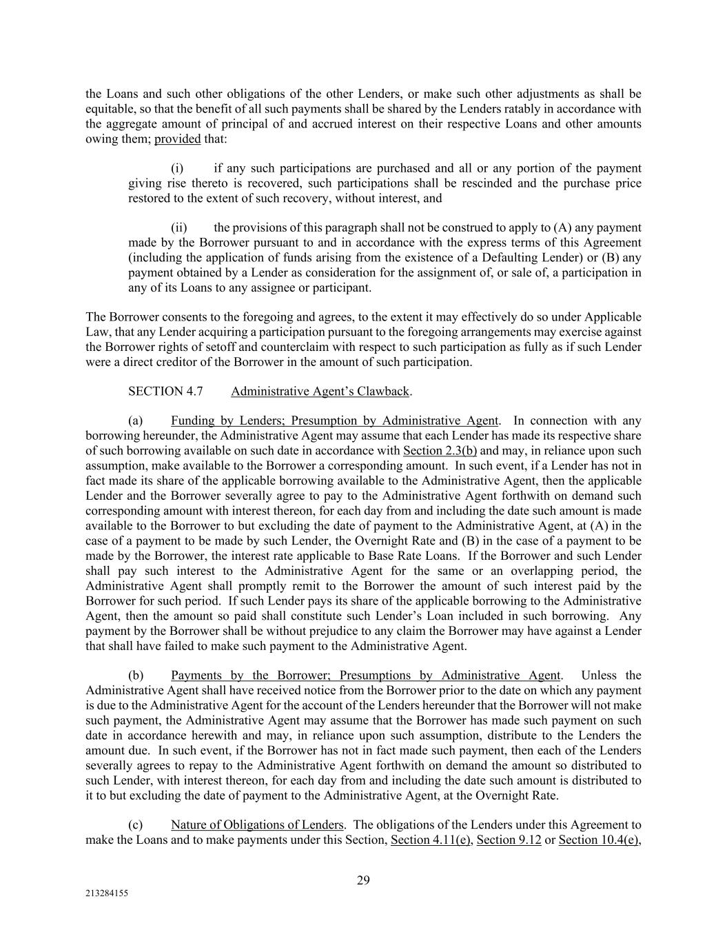 29 213284155 the Loans and such other obligations of the other Lenders, or make such other adjustments as shall be equitable, so that the benefit of all such payments shall be shared by the Lenders ratably in accordance with the aggregate amount of principal of and accrued interest on their respective Loans and other amounts owing them; provided that: (i) if any such participations are purchased and all or any portion of the payment giving rise thereto is recovered, such participations shall be rescinded and the purchase price restored to the extent of such recovery, without interest, and (ii) the provisions of this paragraph shall not be construed to apply to (A) any payment made by the Borrower pursuant to and in accordance with the express terms of this Agreement (including the application of funds arising from the existence of a Defaulting Lender) or (B) any payment obtained by a Lender as consideration for the assignment of, or sale of, a participation in any of its Loans to any assignee or participant. The Borrower consents to the foregoing and agrees, to the extent it may effectively do so under Applicable Law, that any Lender acquiring a participation pursuant to the foregoing arrangements may exercise against the Borrower rights of setoff and counterclaim with respect to such participation as fully as if such Lender were a direct creditor of the Borrower in the amount of such participation. SECTION 4.7 Administrative Agent’s Clawback. (a) Funding by Lenders; Presumption by Administrative Agent. In connection with any borrowing hereunder, the Administrative Agent may assume that each Lender has made its respective share of such borrowing available on such date in accordance with Section 2.3(b) and may, in reliance upon such assumption, make available to the Borrower a corresponding amount. In such event, if a Lender has not in fact made its share of the applicable borrowing available to the Administrative Agent, then the applicable Lender and the Borrower severally agree to pay to the Administrative Agent forthwith on demand such corresponding amount with interest thereon, for each day from and including the date such amount is made available to the Borrower to but excluding the date of payment to the Administrative Agent, at (A) in the case of a payment to be made by such Lender, the Overnight Rate and (B) in the case of a payment to be made by the Borrower, the interest rate applicable to Base Rate Loans. If the Borrower and such Lender shall pay such interest to the Administrative Agent for the same or an overlapping period, the Administrative Agent shall promptly remit to the Borrower the amount of such interest paid by the Borrower for such period. If such Lender pays its share of the applicable borrowing to the Administrative Agent, then the amount so paid shall constitute such Lender’s Loan included in such borrowing. Any payment by the Borrower shall be without prejudice to any claim the Borrower may have against a Lender that shall have failed to make such payment to the Administrative Agent. (b) Payments by the Borrower; Presumptions by Administrative Agent. Unless the Administrative Agent shall have received notice from the Borrower prior to the date on which any payment is due to the Administrative Agent for the account of the Lenders hereunder that the Borrower will not make such payment, the Administrative Agent may assume that the Borrower has made such payment on such date in accordance herewith and may, in reliance upon such assumption, distribute to the Lenders the amount due. In such event, if the Borrower has not in fact made such payment, then each of the Lenders severally agrees to repay to the Administrative Agent forthwith on demand the amount so distributed to such Lender, with interest thereon, for each day from and including the date such amount is distributed to it to but excluding the date of payment to the Administrative Agent, at the Overnight Rate. (c) Nature of Obligations of Lenders. The obligations of the Lenders under this Agreement to make the Loans and to make payments under this Section, Section 4.11(e), Section 9.12 or Section 10.4(e),