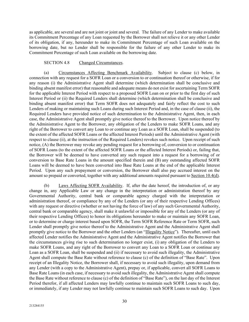 30 213284155 as applicable, are several and are not joint or joint and several. The failure of any Lender to make available its Commitment Percentage of any Loan requested by the Borrower shall not relieve it or any other Lender of its obligation, if any, hereunder to make its Commitment Percentage of such Loan available on the borrowing date, but no Lender shall be responsible for the failure of any other Lender to make its Commitment Percentage of such Loan available on the borrowing date. SECTION 4.8 Changed Circumstances. (a) Circumstances Affecting Benchmark Availability. Subject to clause (c) below, in connection with any request for a SOFR Loan or a conversion to or continuation thereof or otherwise, if for any reason (i) the Administrative Agent shall determine (which determination shall be conclusive and binding absent manifest error) that reasonable and adequate means do not exist for ascertaining Term SOFR for the applicable Interest Period with respect to a proposed SOFR Loan on or prior to the first day of such Interest Period or (ii) the Required Lenders shall determine (which determination shall be conclusive and binding absent manifest error) that Term SOFR does not adequately and fairly reflect the cost to such Lenders of making or maintaining such Loans during such Interest Period and, in the case of clause (ii), the Required Lenders have provided notice of such determination to the Administrative Agent, then, in each case, the Administrative Agent shall promptly give notice thereof to the Borrower. Upon notice thereof by the Administrative Agent to the Borrower, any obligation of the Lenders to make SOFR Loans, and any right of the Borrower to convert any Loan to or continue any Loan as a SOFR Loan, shall be suspended (to the extent of the affected SOFR Loans or the affected Interest Periods) until the Administrative Agent (with respect to clause (ii), at the instruction of the Required Lenders) revokes such notice. Upon receipt of such notice, (A) the Borrower may revoke any pending request for a borrowing of, conversion to or continuation of SOFR Loans (to the extent of the affected SOFR Loans or the affected Interest Periods) or, failing that, the Borrower will be deemed to have converted any such request into a request for a borrowing of or conversion to Base Rate Loans in the amount specified therein and (B) any outstanding affected SOFR Loans will be deemed to have been converted into Base Rate Loans at the end of the applicable Interest Period. Upon any such prepayment or conversion, the Borrower shall also pay accrued interest on the amount so prepaid or converted, together with any additional amounts required pursuant to Section 10.4(d). (b) Laws Affecting SOFR Availability. If, after the date hereof, the introduction of, or any change in, any Applicable Law or any change in the interpretation or administration thereof by any Governmental Authority, central bank or comparable agency charged with the interpretation or administration thereof, or compliance by any of the Lenders (or any of their respective Lending Offices) with any request or directive (whether or not having the force of law) of any such Governmental Authority, central bank or comparable agency, shall make it unlawful or impossible for any of the Lenders (or any of their respective Lending Offices) to honor its obligations hereunder to make or maintain any SOFR Loan, or to determine or charge interest based upon SOFR, the Term SOFR Reference Rate or Term SOFR, such Lender shall promptly give notice thereof to the Administrative Agent and the Administrative Agent shall promptly give notice to the Borrower and the other Lenders (an “Illegality Notice”). Thereafter, until each affected Lender notifies the Administrative Agent and the Administrative Agent notifies the Borrower that the circumstances giving rise to such determination no longer exist, (i) any obligation of the Lenders to make SOFR Loans, and any right of the Borrower to convert any Loan to a SOFR Loan or continue any Loan as a SOFR Loan, shall be suspended and (ii) if necessary to avoid such illegality, the Administrative Agent shall compute the Base Rate without reference to clause (c) of the definition of “Base Rate”. Upon receipt of an Illegality Notice, the Borrower shall, if necessary to avoid such illegality, upon demand from any Lender (with a copy to the Administrative Agent), prepay or, if applicable, convert all SOFR Loans to Base Rate Loans (in each case, if necessary to avoid such illegality, the Administrative Agent shall compute the Base Rate without reference to clause (c) of the definition of “Base Rate”), on the last day of the Interest Period therefor, if all affected Lenders may lawfully continue to maintain such SOFR Loans to such day, or immediately, if any Lender may not lawfully continue to maintain such SOFR Loans to such day. Upon