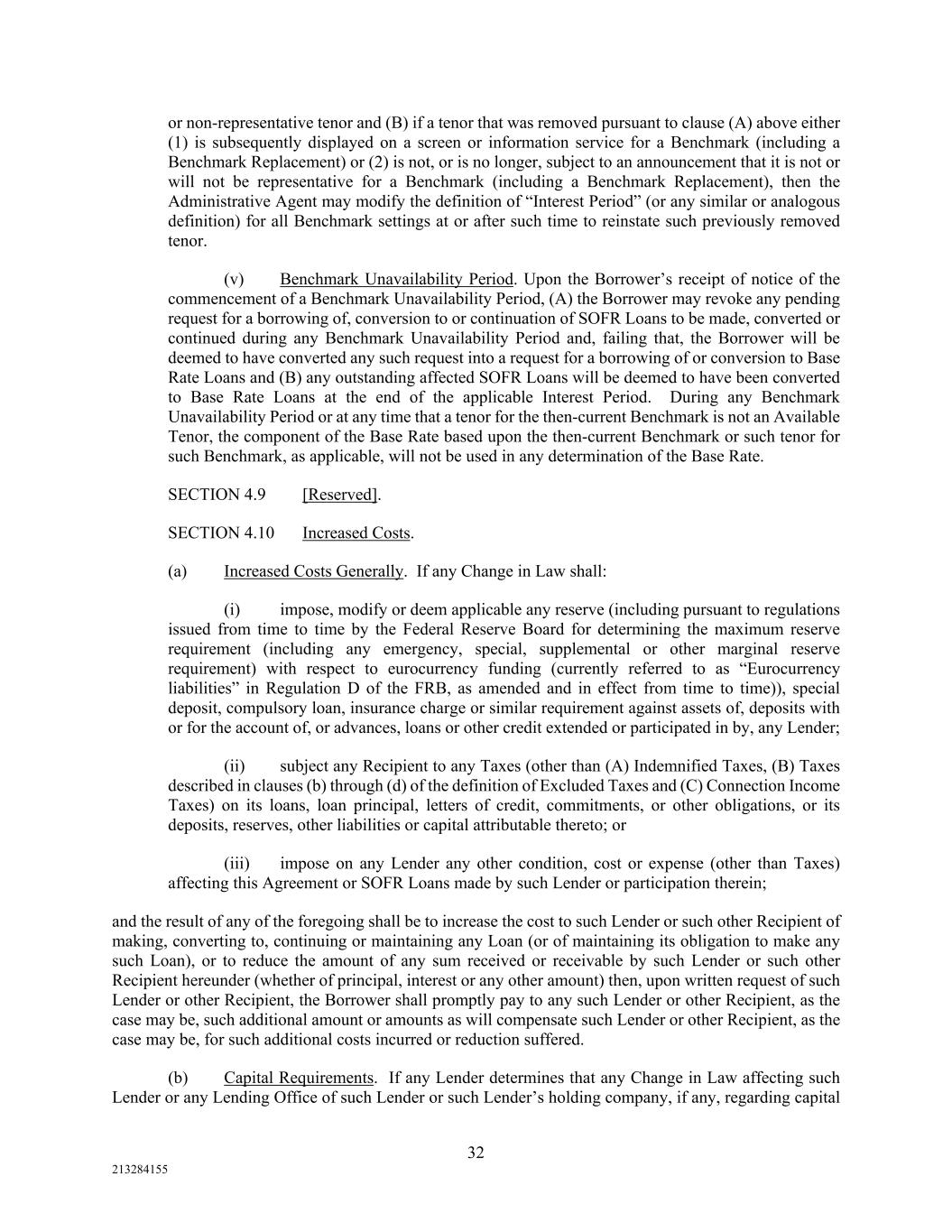 32 213284155 or non-representative tenor and (B) if a tenor that was removed pursuant to clause (A) above either (1) is subsequently displayed on a screen or information service for a Benchmark (including a Benchmark Replacement) or (2) is not, or is no longer, subject to an announcement that it is not or will not be representative for a Benchmark (including a Benchmark Replacement), then the Administrative Agent may modify the definition of “Interest Period” (or any similar or analogous definition) for all Benchmark settings at or after such time to reinstate such previously removed tenor. (v) Benchmark Unavailability Period. Upon the Borrower’s receipt of notice of the commencement of a Benchmark Unavailability Period, (A) the Borrower may revoke any pending request for a borrowing of, conversion to or continuation of SOFR Loans to be made, converted or continued during any Benchmark Unavailability Period and, failing that, the Borrower will be deemed to have converted any such request into a request for a borrowing of or conversion to Base Rate Loans and (B) any outstanding affected SOFR Loans will be deemed to have been converted to Base Rate Loans at the end of the applicable Interest Period. During any Benchmark Unavailability Period or at any time that a tenor for the then-current Benchmark is not an Available Tenor, the component of the Base Rate based upon the then-current Benchmark or such tenor for such Benchmark, as applicable, will not be used in any determination of the Base Rate. SECTION 4.9 [Reserved]. SECTION 4.10 Increased Costs. (a) Increased Costs Generally. If any Change in Law shall: (i) impose, modify or deem applicable any reserve (including pursuant to regulations issued from time to time by the Federal Reserve Board for determining the maximum reserve requirement (including any emergency, special, supplemental or other marginal reserve requirement) with respect to eurocurrency funding (currently referred to as “Eurocurrency liabilities” in Regulation D of the FRB, as amended and in effect from time to time)), special deposit, compulsory loan, insurance charge or similar requirement against assets of, deposits with or for the account of, or advances, loans or other credit extended or participated in by, any Lender; (ii) subject any Recipient to any Taxes (other than (A) Indemnified Taxes, (B) Taxes described in clauses (b) through (d) of the definition of Excluded Taxes and (C) Connection Income Taxes) on its loans, loan principal, letters of credit, commitments, or other obligations, or its deposits, reserves, other liabilities or capital attributable thereto; or (iii) impose on any Lender any other condition, cost or expense (other than Taxes) affecting this Agreement or SOFR Loans made by such Lender or participation therein; and the result of any of the foregoing shall be to increase the cost to such Lender or such other Recipient of making, converting to, continuing or maintaining any Loan (or of maintaining its obligation to make any such Loan), or to reduce the amount of any sum received or receivable by such Lender or such other Recipient hereunder (whether of principal, interest or any other amount) then, upon written request of such Lender or other Recipient, the Borrower shall promptly pay to any such Lender or other Recipient, as the case may be, such additional amount or amounts as will compensate such Lender or other Recipient, as the case may be, for such additional costs incurred or reduction suffered. (b) Capital Requirements. If any Lender determines that any Change in Law affecting such Lender or any Lending Office of such Lender or such Lender’s holding company, if any, regarding capital