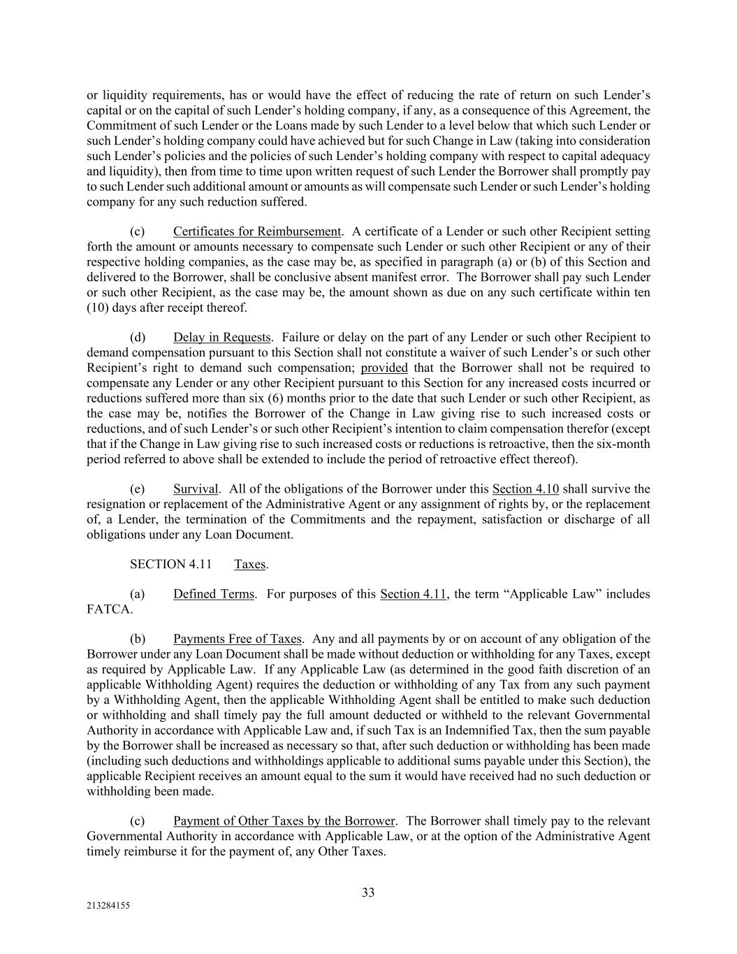 33 213284155 or liquidity requirements, has or would have the effect of reducing the rate of return on such Lender’s capital or on the capital of such Lender’s holding company, if any, as a consequence of this Agreement, the Commitment of such Lender or the Loans made by such Lender to a level below that which such Lender or such Lender’s holding company could have achieved but for such Change in Law (taking into consideration such Lender’s policies and the policies of such Lender’s holding company with respect to capital adequacy and liquidity), then from time to time upon written request of such Lender the Borrower shall promptly pay to such Lender such additional amount or amounts as will compensate such Lender or such Lender’s holding company for any such reduction suffered. (c) Certificates for Reimbursement. A certificate of a Lender or such other Recipient setting forth the amount or amounts necessary to compensate such Lender or such other Recipient or any of their respective holding companies, as the case may be, as specified in paragraph (a) or (b) of this Section and delivered to the Borrower, shall be conclusive absent manifest error. The Borrower shall pay such Lender or such other Recipient, as the case may be, the amount shown as due on any such certificate within ten (10) days after receipt thereof. (d) Delay in Requests. Failure or delay on the part of any Lender or such other Recipient to demand compensation pursuant to this Section shall not constitute a waiver of such Lender’s or such other Recipient’s right to demand such compensation; provided that the Borrower shall not be required to compensate any Lender or any other Recipient pursuant to this Section for any increased costs incurred or reductions suffered more than six (6) months prior to the date that such Lender or such other Recipient, as the case may be, notifies the Borrower of the Change in Law giving rise to such increased costs or reductions, and of such Lender’s or such other Recipient’s intention to claim compensation therefor (except that if the Change in Law giving rise to such increased costs or reductions is retroactive, then the six-month period referred to above shall be extended to include the period of retroactive effect thereof). (e) Survival. All of the obligations of the Borrower under this Section 4.10 shall survive the resignation or replacement of the Administrative Agent or any assignment of rights by, or the replacement of, a Lender, the termination of the Commitments and the repayment, satisfaction or discharge of all obligations under any Loan Document. SECTION 4.11 Taxes. (a) Defined Terms. For purposes of this Section 4.11, the term “Applicable Law” includes FATCA. (b) Payments Free of Taxes. Any and all payments by or on account of any obligation of the Borrower under any Loan Document shall be made without deduction or withholding for any Taxes, except as required by Applicable Law. If any Applicable Law (as determined in the good faith discretion of an applicable Withholding Agent) requires the deduction or withholding of any Tax from any such payment by a Withholding Agent, then the applicable Withholding Agent shall be entitled to make such deduction or withholding and shall timely pay the full amount deducted or withheld to the relevant Governmental Authority in accordance with Applicable Law and, if such Tax is an Indemnified Tax, then the sum payable by the Borrower shall be increased as necessary so that, after such deduction or withholding has been made (including such deductions and withholdings applicable to additional sums payable under this Section), the applicable Recipient receives an amount equal to the sum it would have received had no such deduction or withholding been made. (c) Payment of Other Taxes by the Borrower. The Borrower shall timely pay to the relevant Governmental Authority in accordance with Applicable Law, or at the option of the Administrative Agent timely reimburse it for the payment of, any Other Taxes.