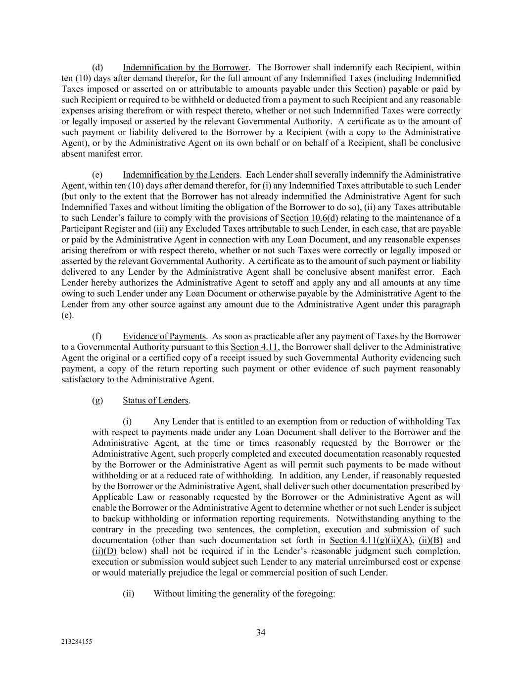 34 213284155 (d) Indemnification by the Borrower. The Borrower shall indemnify each Recipient, within ten (10) days after demand therefor, for the full amount of any Indemnified Taxes (including Indemnified Taxes imposed or asserted on or attributable to amounts payable under this Section) payable or paid by such Recipient or required to be withheld or deducted from a payment to such Recipient and any reasonable expenses arising therefrom or with respect thereto, whether or not such Indemnified Taxes were correctly or legally imposed or asserted by the relevant Governmental Authority. A certificate as to the amount of such payment or liability delivered to the Borrower by a Recipient (with a copy to the Administrative Agent), or by the Administrative Agent on its own behalf or on behalf of a Recipient, shall be conclusive absent manifest error. (e) Indemnification by the Lenders. Each Lender shall severally indemnify the Administrative Agent, within ten (10) days after demand therefor, for (i) any Indemnified Taxes attributable to such Lender (but only to the extent that the Borrower has not already indemnified the Administrative Agent for such Indemnified Taxes and without limiting the obligation of the Borrower to do so), (ii) any Taxes attributable to such Lender’s failure to comply with the provisions of Section 10.6(d) relating to the maintenance of a Participant Register and (iii) any Excluded Taxes attributable to such Lender, in each case, that are payable or paid by the Administrative Agent in connection with any Loan Document, and any reasonable expenses arising therefrom or with respect thereto, whether or not such Taxes were correctly or legally imposed or asserted by the relevant Governmental Authority. A certificate as to the amount of such payment or liability delivered to any Lender by the Administrative Agent shall be conclusive absent manifest error. Each Lender hereby authorizes the Administrative Agent to setoff and apply any and all amounts at any time owing to such Lender under any Loan Document or otherwise payable by the Administrative Agent to the Lender from any other source against any amount due to the Administrative Agent under this paragraph (e). (f) Evidence of Payments. As soon as practicable after any payment of Taxes by the Borrower to a Governmental Authority pursuant to this Section 4.11, the Borrower shall deliver to the Administrative Agent the original or a certified copy of a receipt issued by such Governmental Authority evidencing such payment, a copy of the return reporting such payment or other evidence of such payment reasonably satisfactory to the Administrative Agent. (g) Status of Lenders. (i) Any Lender that is entitled to an exemption from or reduction of withholding Tax with respect to payments made under any Loan Document shall deliver to the Borrower and the Administrative Agent, at the time or times reasonably requested by the Borrower or the Administrative Agent, such properly completed and executed documentation reasonably requested by the Borrower or the Administrative Agent as will permit such payments to be made without withholding or at a reduced rate of withholding. In addition, any Lender, if reasonably requested by the Borrower or the Administrative Agent, shall deliver such other documentation prescribed by Applicable Law or reasonably requested by the Borrower or the Administrative Agent as will enable the Borrower or the Administrative Agent to determine whether or not such Lender is subject to backup withholding or information reporting requirements. Notwithstanding anything to the contrary in the preceding two sentences, the completion, execution and submission of such documentation (other than such documentation set forth in Section 4.11(g)(ii)(A), (ii)(B) and (ii)(D) below) shall not be required if in the Lender’s reasonable judgment such completion, execution or submission would subject such Lender to any material unreimbursed cost or expense or would materially prejudice the legal or commercial position of such Lender. (ii) Without limiting the generality of the foregoing: