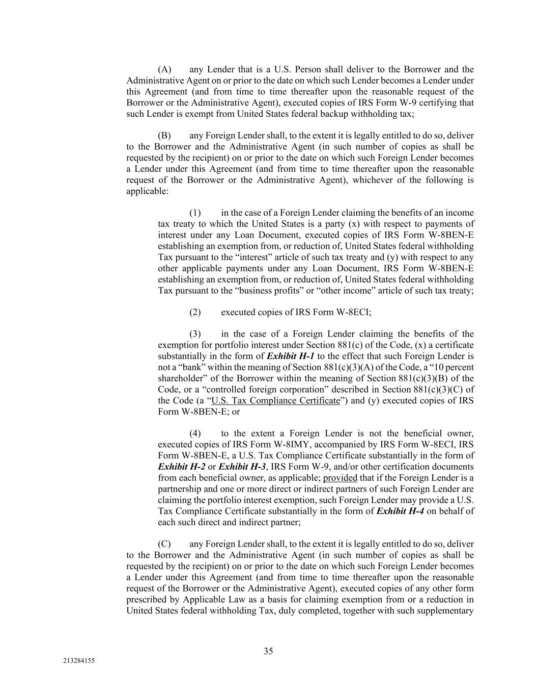 35 213284155 (A) any Lender that is a U.S. Person shall deliver to the Borrower and the Administrative Agent on or prior to the date on which such Lender becomes a Lender under this Agreement (and from time to time thereafter upon the reasonable request of the Borrower or the Administrative Agent), executed copies of IRS Form W-9 certifying that such Lender is exempt from United States federal backup withholding tax; (B) any Foreign Lender shall, to the extent it is legally entitled to do so, deliver to the Borrower and the Administrative Agent (in such number of copies as shall be requested by the recipient) on or prior to the date on which such Foreign Lender becomes a Lender under this Agreement (and from time to time thereafter upon the reasonable request of the Borrower or the Administrative Agent), whichever of the following is applicable: (1) in the case of a Foreign Lender claiming the benefits of an income tax treaty to which the United States is a party (x) with respect to payments of interest under any Loan Document, executed copies of IRS Form W-8BEN-E establishing an exemption from, or reduction of, United States federal withholding Tax pursuant to the “interest” article of such tax treaty and (y) with respect to any other applicable payments under any Loan Document, IRS Form W-8BEN-E establishing an exemption from, or reduction of, United States federal withholding Tax pursuant to the “business profits” or “other income” article of such tax treaty; (2) executed copies of IRS Form W-8ECI; (3) in the case of a Foreign Lender claiming the benefits of the exemption for portfolio interest under Section 881(c) of the Code, (x) a certificate substantially in the form of Exhibit H-1 to the effect that such Foreign Lender is not a “bank” within the meaning of Section 881(c)(3)(A) of the Code, a “10 percent shareholder” of the Borrower within the meaning of Section 881(c)(3)(B) of the Code, or a “controlled foreign corporation” described in Section 881(c)(3)(C) of the Code (a “U.S. Tax Compliance Certificate”) and (y) executed copies of IRS Form W-8BEN-E; or (4) to the extent a Foreign Lender is not the beneficial owner, executed copies of IRS Form W-8IMY, accompanied by IRS Form W-8ECI, IRS Form W-8BEN-E, a U.S. Tax Compliance Certificate substantially in the form of Exhibit H-2 or Exhibit H-3, IRS Form W-9, and/or other certification documents from each beneficial owner, as applicable; provided that if the Foreign Lender is a partnership and one or more direct or indirect partners of such Foreign Lender are claiming the portfolio interest exemption, such Foreign Lender may provide a U.S. Tax Compliance Certificate substantially in the form of Exhibit H-4 on behalf of each such direct and indirect partner; (C) any Foreign Lender shall, to the extent it is legally entitled to do so, deliver to the Borrower and the Administrative Agent (in such number of copies as shall be requested by the recipient) on or prior to the date on which such Foreign Lender becomes a Lender under this Agreement (and from time to time thereafter upon the reasonable request of the Borrower or the Administrative Agent), executed copies of any other form prescribed by Applicable Law as a basis for claiming exemption from or a reduction in United States federal withholding Tax, duly completed, together with such supplementary