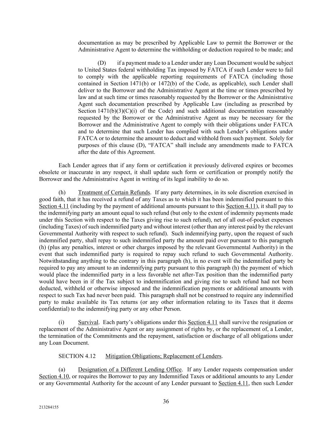 36 213284155 documentation as may be prescribed by Applicable Law to permit the Borrower or the Administrative Agent to determine the withholding or deduction required to be made; and (D) if a payment made to a Lender under any Loan Document would be subject to United States federal withholding Tax imposed by FATCA if such Lender were to fail to comply with the applicable reporting requirements of FATCA (including those contained in Section 1471(b) or 1472(b) of the Code, as applicable), such Lender shall deliver to the Borrower and the Administrative Agent at the time or times prescribed by law and at such time or times reasonably requested by the Borrower or the Administrative Agent such documentation prescribed by Applicable Law (including as prescribed by Section 1471(b)(3)(C)(i) of the Code) and such additional documentation reasonably requested by the Borrower or the Administrative Agent as may be necessary for the Borrower and the Administrative Agent to comply with their obligations under FATCA and to determine that such Lender has complied with such Lender’s obligations under FATCA or to determine the amount to deduct and withhold from such payment. Solely for purposes of this clause (D), “FATCA” shall include any amendments made to FATCA after the date of this Agreement. Each Lender agrees that if any form or certification it previously delivered expires or becomes obsolete or inaccurate in any respect, it shall update such form or certification or promptly notify the Borrower and the Administrative Agent in writing of its legal inability to do so. (h) Treatment of Certain Refunds. If any party determines, in its sole discretion exercised in good faith, that it has received a refund of any Taxes as to which it has been indemnified pursuant to this Section 4.11 (including by the payment of additional amounts pursuant to this Section 4.11), it shall pay to the indemnifying party an amount equal to such refund (but only to the extent of indemnity payments made under this Section with respect to the Taxes giving rise to such refund), net of all out-of-pocket expenses (including Taxes) of such indemnified party and without interest (other than any interest paid by the relevant Governmental Authority with respect to such refund). Such indemnifying party, upon the request of such indemnified party, shall repay to such indemnified party the amount paid over pursuant to this paragraph (h) (plus any penalties, interest or other charges imposed by the relevant Governmental Authority) in the event that such indemnified party is required to repay such refund to such Governmental Authority. Notwithstanding anything to the contrary in this paragraph (h), in no event will the indemnified party be required to pay any amount to an indemnifying party pursuant to this paragraph (h) the payment of which would place the indemnified party in a less favorable net after-Tax position than the indemnified party would have been in if the Tax subject to indemnification and giving rise to such refund had not been deducted, withheld or otherwise imposed and the indemnification payments or additional amounts with respect to such Tax had never been paid. This paragraph shall not be construed to require any indemnified party to make available its Tax returns (or any other information relating to its Taxes that it deems confidential) to the indemnifying party or any other Person. (i) Survival. Each party’s obligations under this Section 4.11 shall survive the resignation or replacement of the Administrative Agent or any assignment of rights by, or the replacement of, a Lender, the termination of the Commitments and the repayment, satisfaction or discharge of all obligations under any Loan Document. SECTION 4.12 Mitigation Obligations; Replacement of Lenders. (a) Designation of a Different Lending Office. If any Lender requests compensation under Section 4.10, or requires the Borrower to pay any Indemnified Taxes or additional amounts to any Lender or any Governmental Authority for the account of any Lender pursuant to Section 4.11, then such Lender